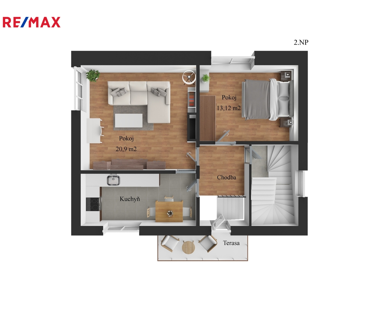2. NP: dva pokoje, kuchyně a vstup na terasu přístupnou z chodby
