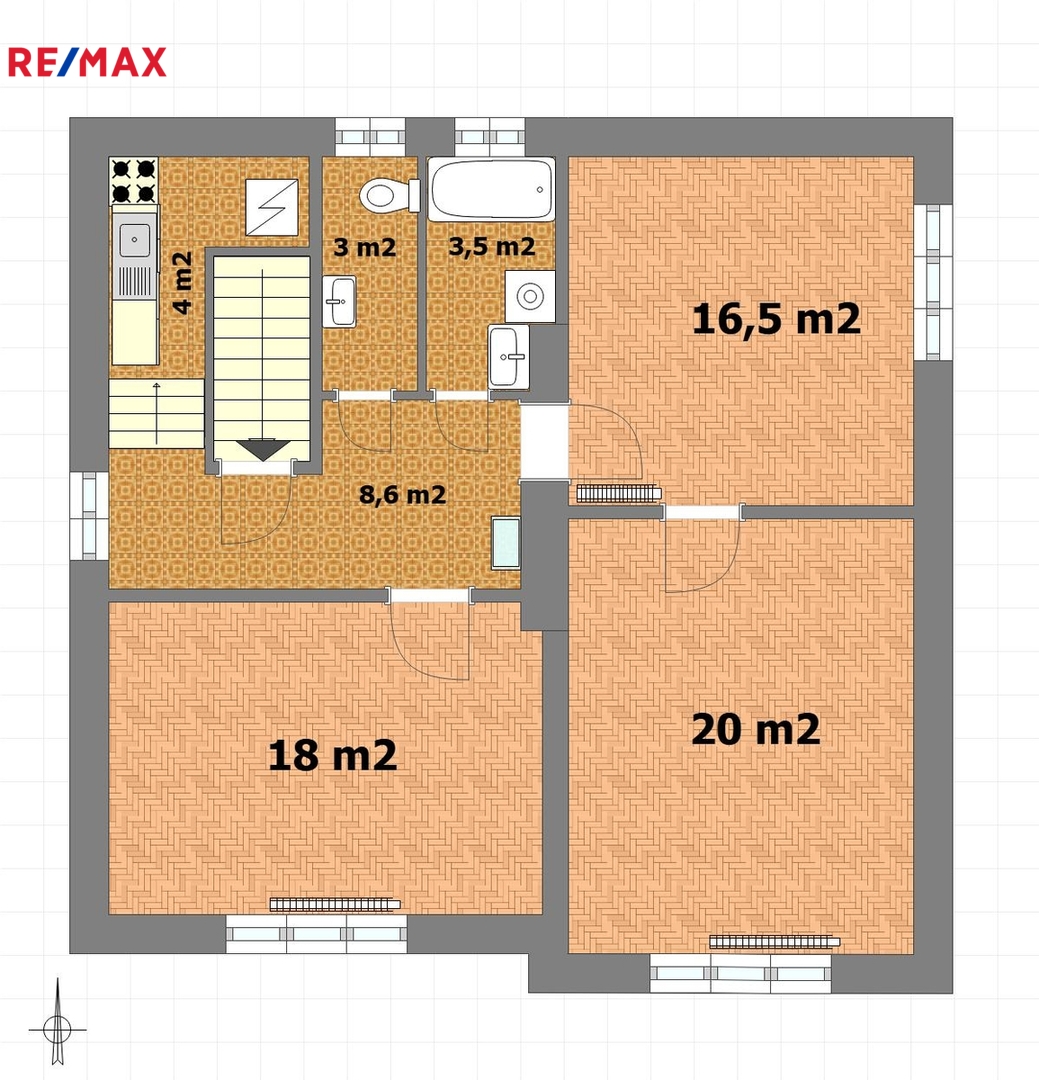 Samotná bytová jednotka (74 m2), která je předmětem prodeje, se nachází v 1. patře a je přístupná po schodišti ze společného zádveří. K dispozici je pak také polovina sklepu v suterénu domu o velikosti 13 m2 a další skladovací prostory na nižší půdě nad bytem.