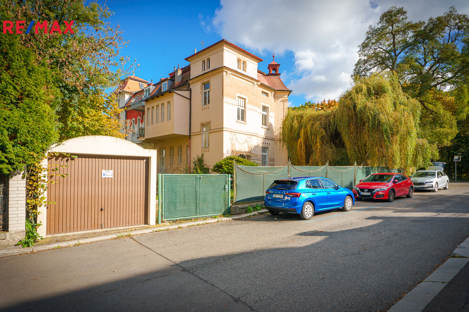 K domu přiléhá zatravněná odpočinková zahrada s několika vzrostlými stromy. Z boční ulice se vjíždí do samostatné garáže a na jedno parkovací místo přímo na pozemku.