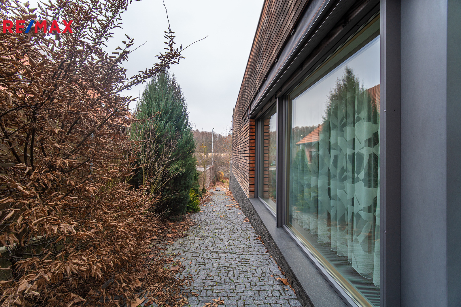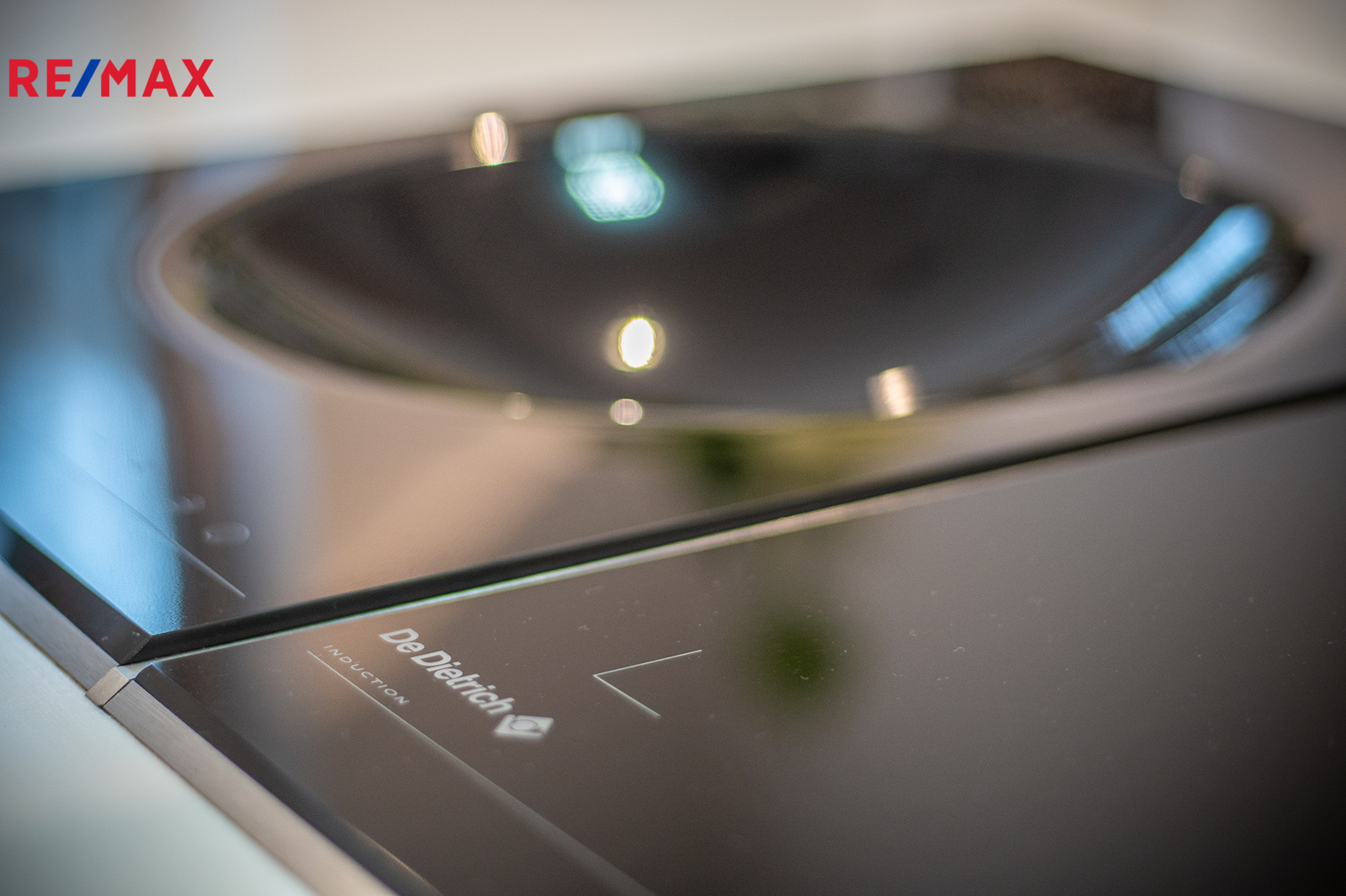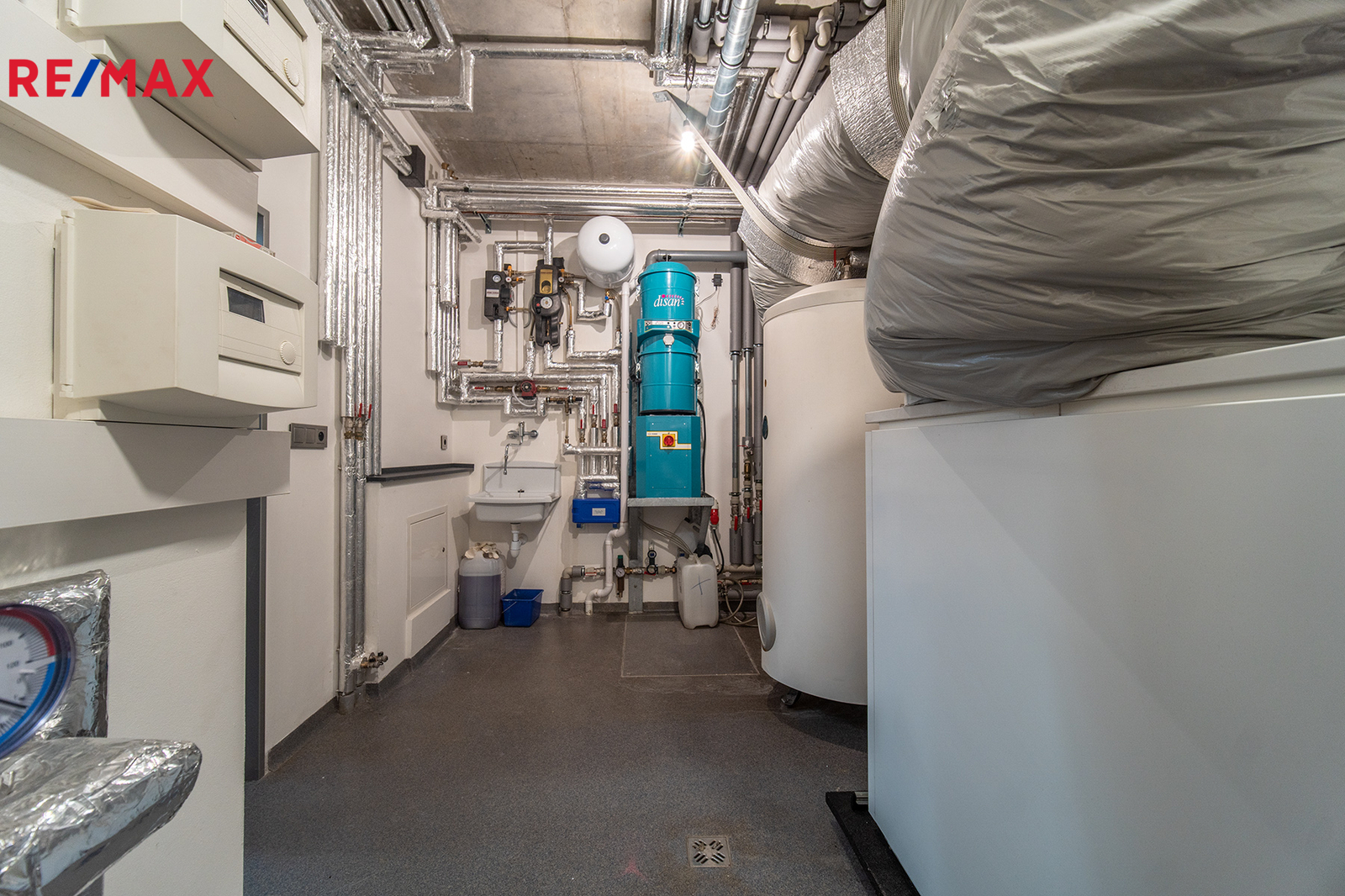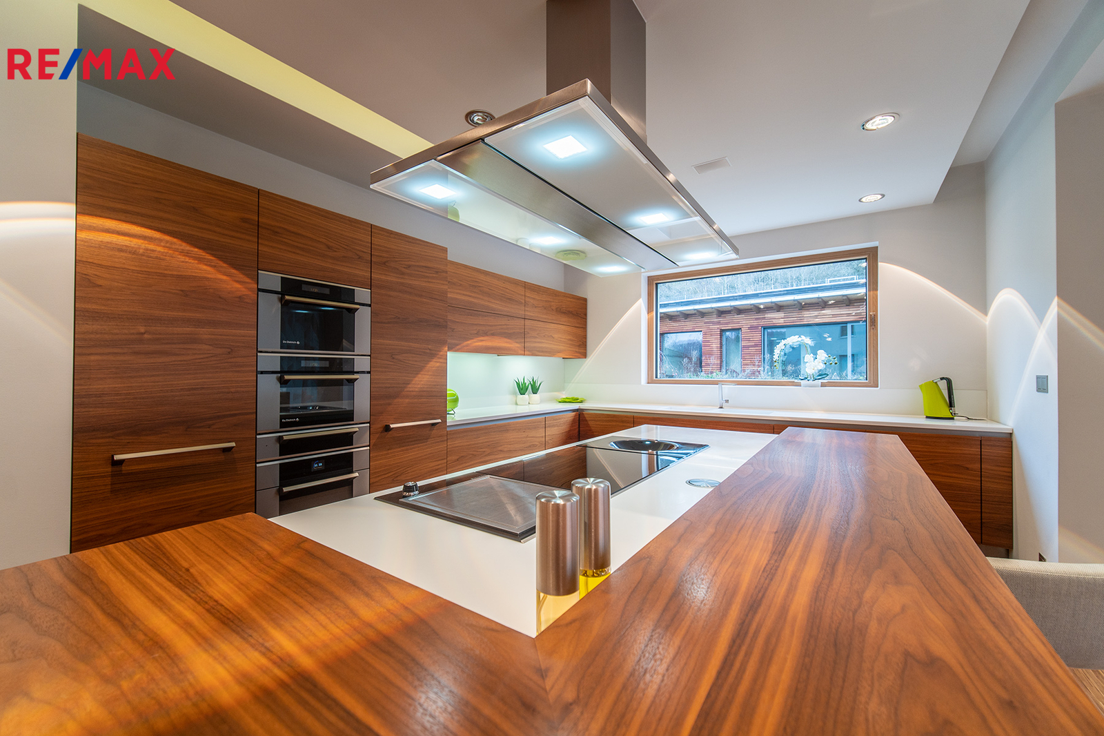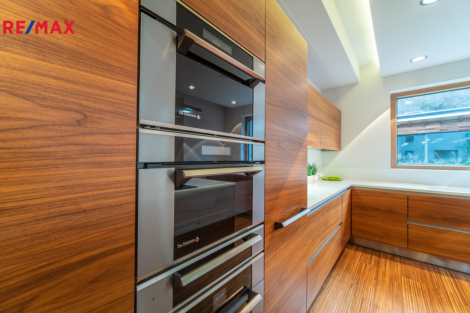 Kuchyně je vybavena prémiovými spotřebiči francouzské značky De Dietrich včetně indukčního woku a grilovací desky tepan. Také další detaily Vás nenechají na pochybách, že majitelé při stavbě domu a při jeho zařizovaní nešetřili na kvalitě. S koupí domu tak získáte nadčasovou nemovitost, která vám bude dlouhá léta spolehlivě sloužit. Vytápění a ohřev vody jsou řešeny tepelným čerpadlem v kombinaci se solárními kolektory. V domě je rozvedeno podlahové topení mimo ložnic, ve kterých jsou instalována designová topná tělesa. Kvalitní okna z vakuových trojskel s vnitřní fólií poskytují dokonalou tepelnou i aktustickou pohodu v domě. Stínění je řešeno venkovními elektrickými roletami. Samozřejmostí je elektronický zabezpečovací systém s venkovními kamerami. Případné cennosti můžete uložit do trezorové místnosti, která má necelé 4 m².