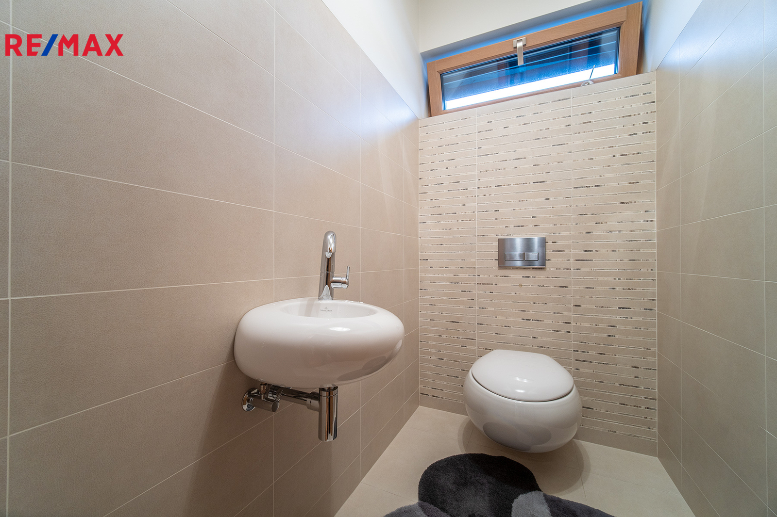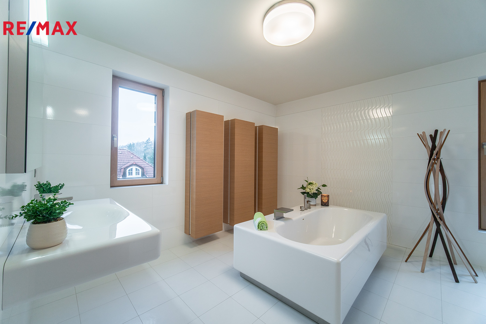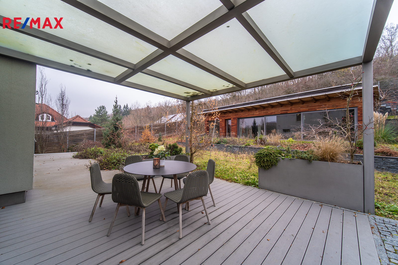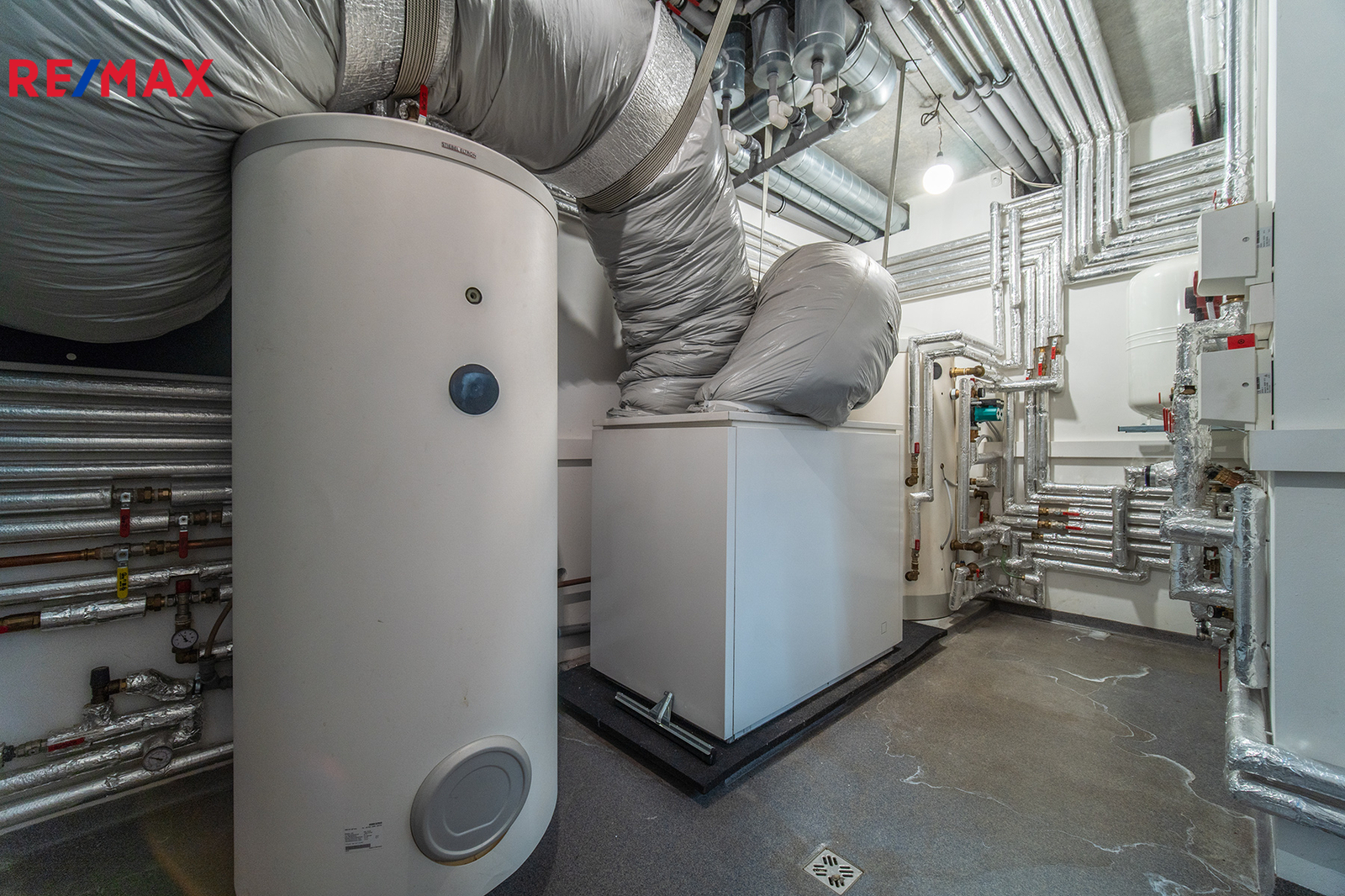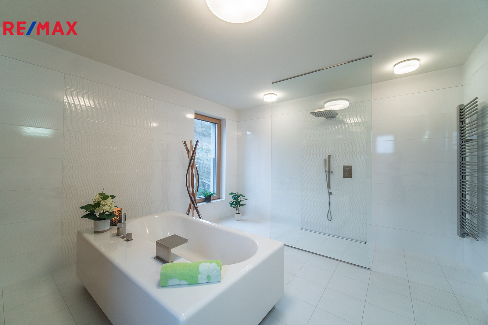 Kuchyně je vybavena prémiovými spotřebiči francouzské značky De Dietrich včetně indukčního woku a grilovací desky tepan. Také další detaily Vás nenechají na pochybách, že majitelé při stavbě domu a při jeho zařizovaní nešetřili na kvalitě. S koupí domu tak získáte nadčasovou nemovitost, která vám bude dlouhá léta spolehlivě sloužit. Vytápění a ohřev vody jsou řešeny tepelným čerpadlem v kombinaci se solárními kolektory. V domě je rozvedeno podlahové topení mimo ložnic, ve kterých jsou instalována designová topná tělesa. Kvalitní okna z vakuových trojskel s vnitřní fólií poskytují dokonalou tepelnou i aktustickou pohodu v domě. Stínění je řešeno venkovními elektrickými roletami. Samozřejmostí je elektronický zabezpečovací systém s venkovními kamerami. Případné cennosti můžete uložit do trezorové místnosti, která má necelé 4 m².