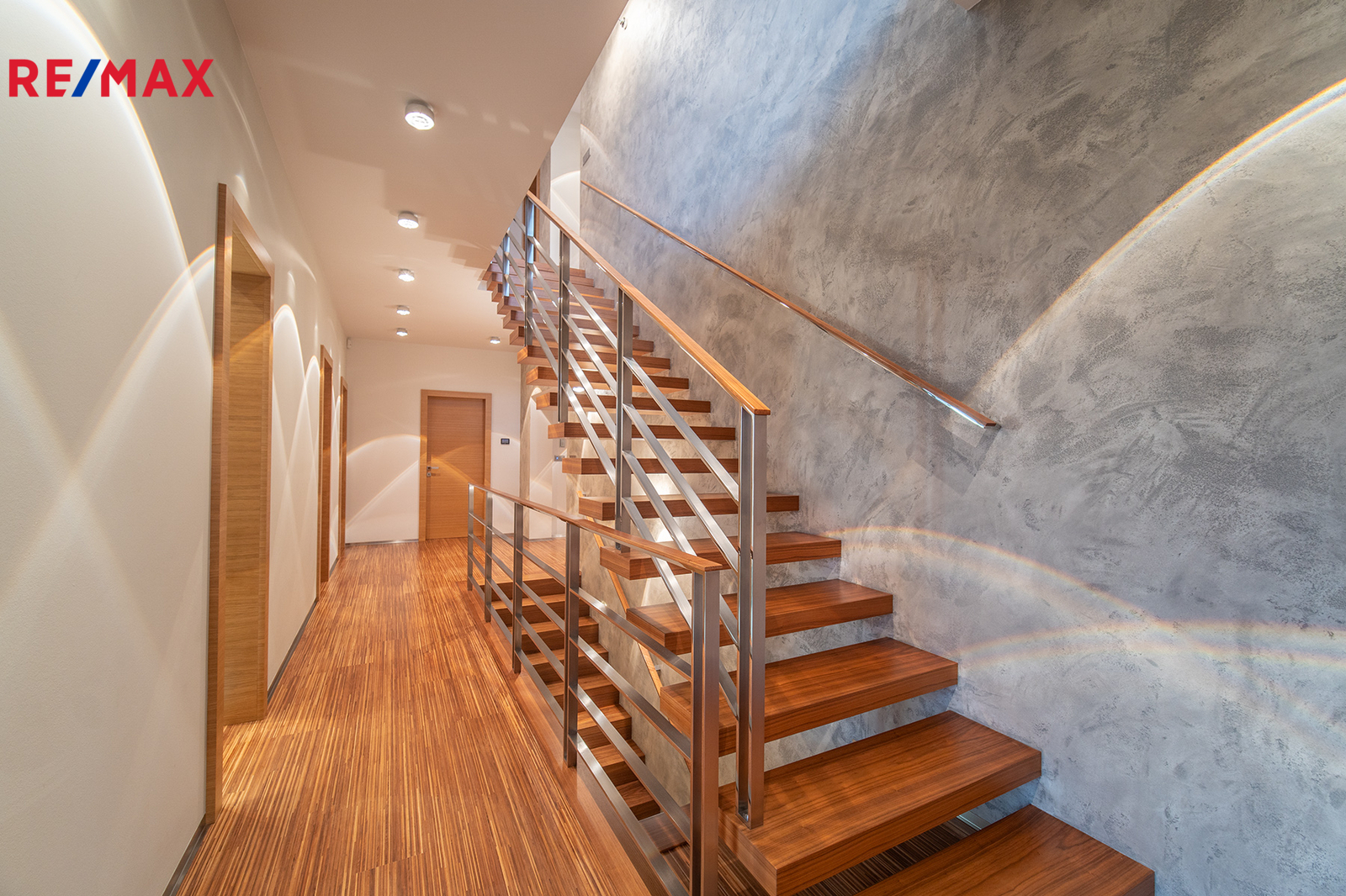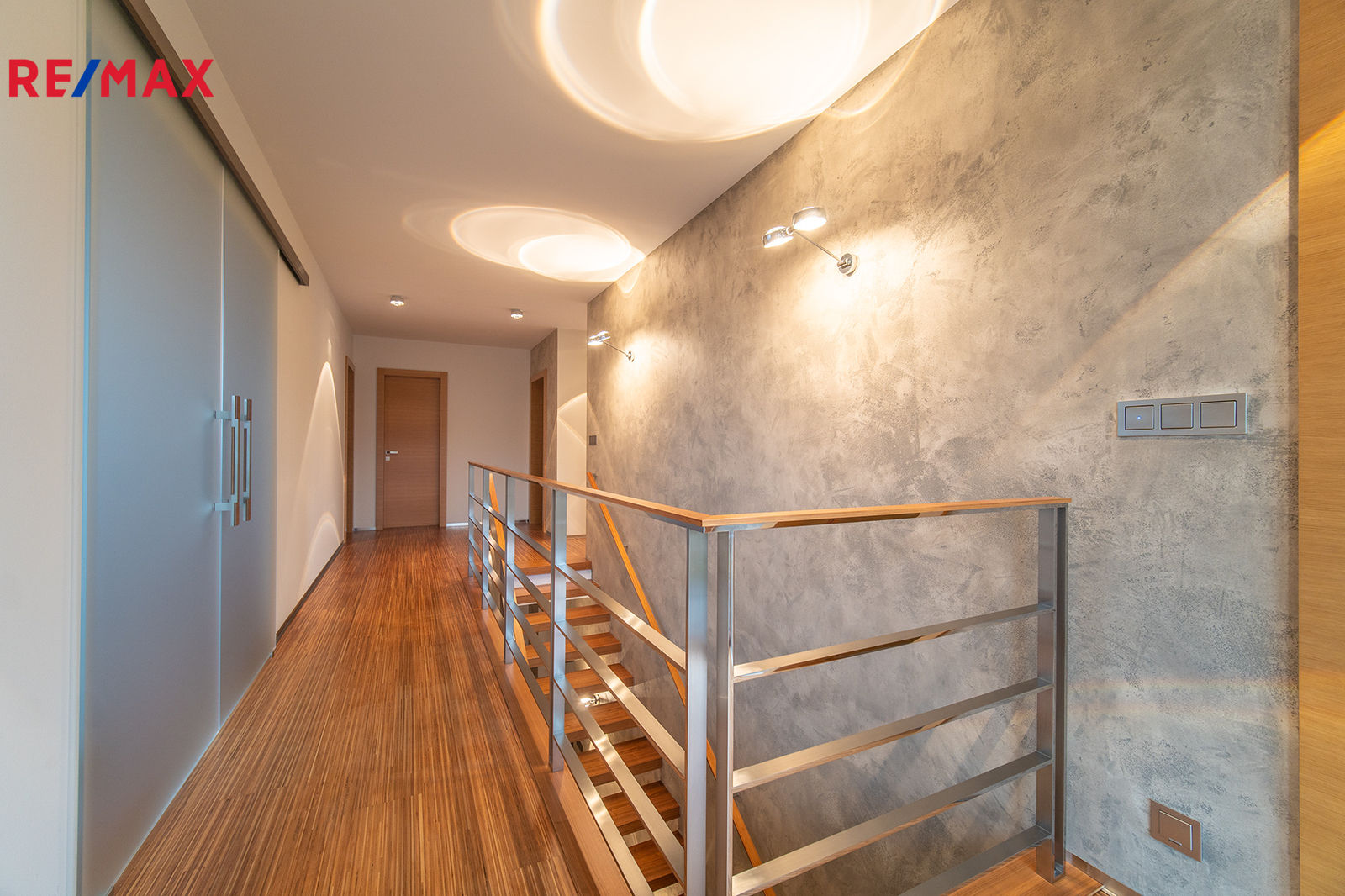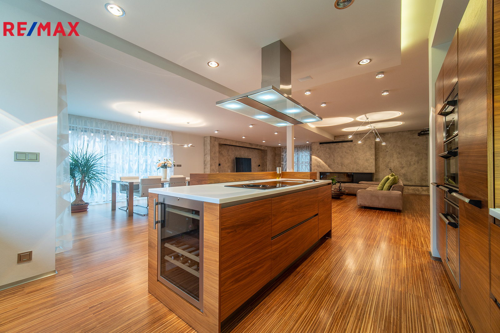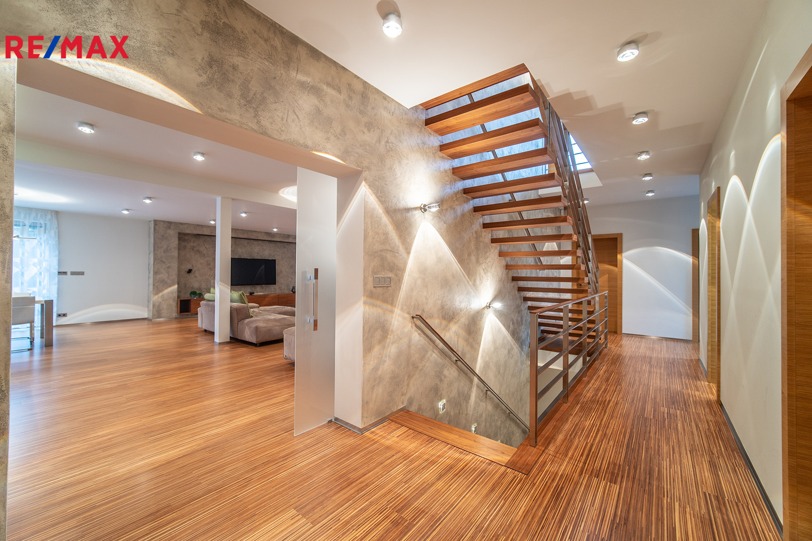 Třípodlažní rodinný dům kolaudovaný v roce 2012 nabízí užitnou plochu 536 m². Interiér poskytuje dostatek soukromí a osobního prostoru všem členům rodiny. K dispozici jsou 4 ložnice, 2 pracovny, 3 koupelny, technické a servisní zázemí, klimatizovaný sklad potravin a v neposlední řadě vzdušný obývací pokoj s kuchyňským a jídelním koutem. Obývací pokoj je společenským centrem každého rodinného domu a proto mu byl věnován patřičný prostor. Na téměř 97 m² podlahové plochy se pohodlně vejde prostorné posezení pro rodinu i hosty. Bez kompromisů si tak můžete užívat poslech hudby z intergovaného domácího audiosystému BOSE nebo sledovat oblíbený film na vestavěném projekčním plátně.