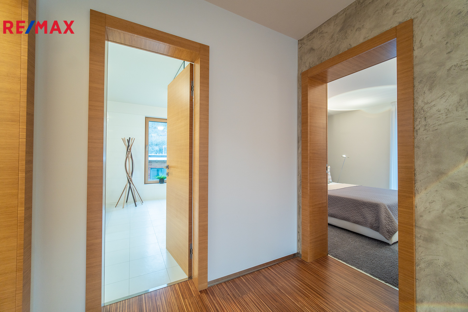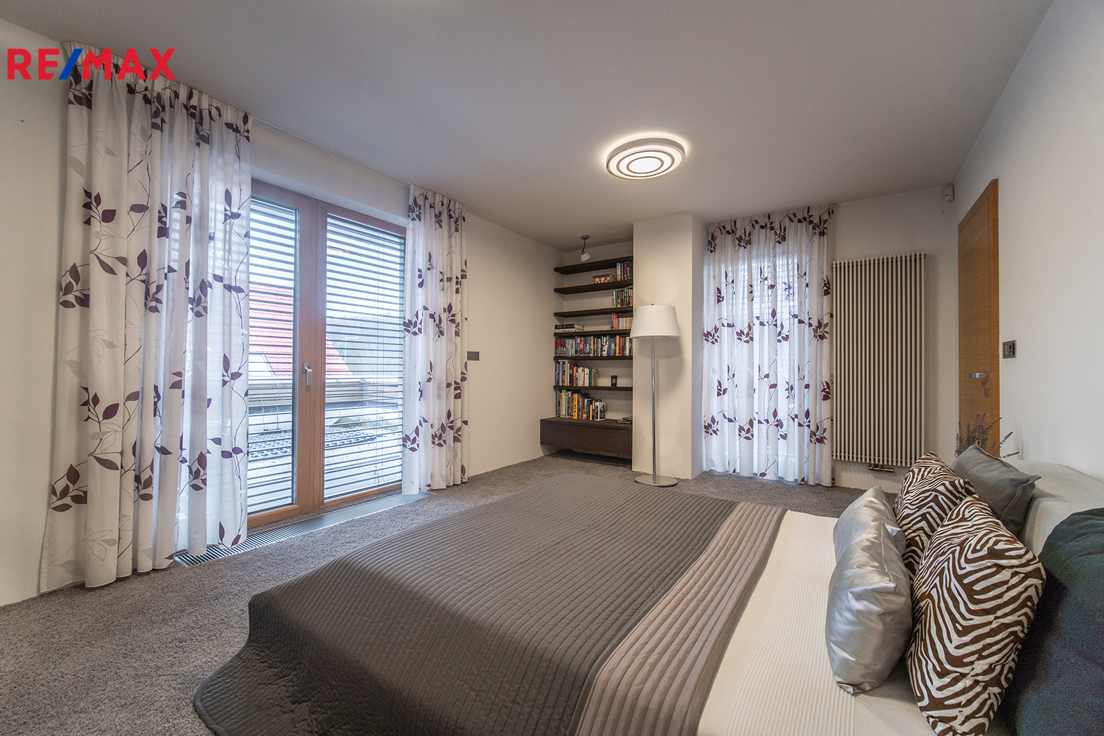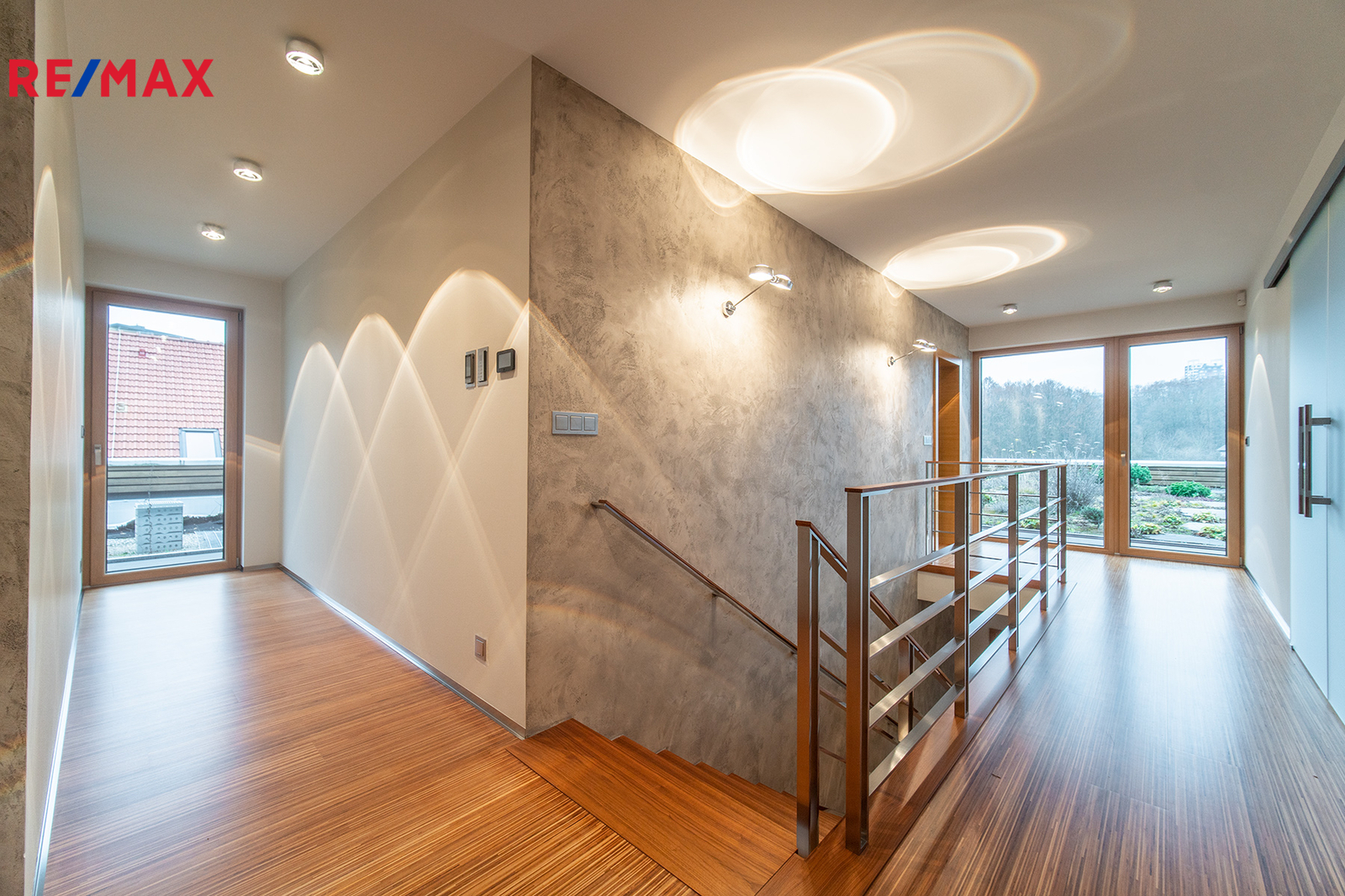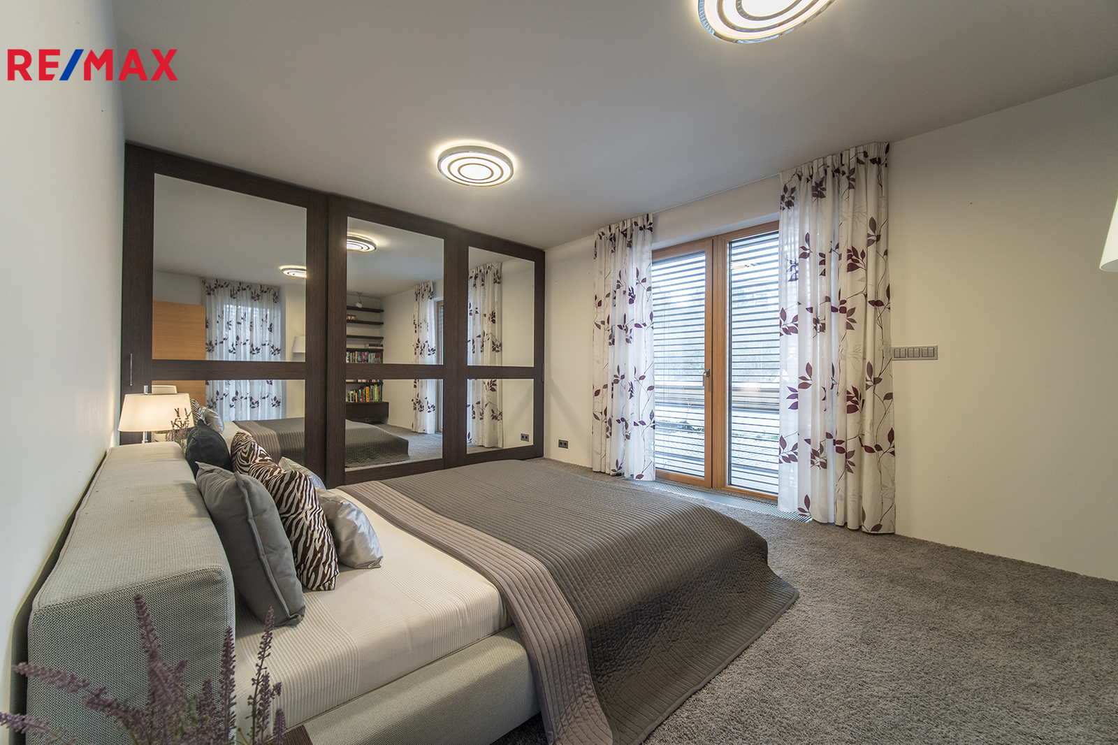 Třípodlažní rodinný dům kolaudovaný v roce 2012 nabízí užitnou plochu 536 m². Interiér poskytuje dostatek soukromí a osobního prostoru všem členům rodiny. K dispozici jsou 4 ložnice, 2 pracovny, 3 koupelny, technické a servisní zázemí, klimatizovaný sklad potravin a v neposlední řadě vzdušný obývací pokoj s kuchyňským a jídelním koutem. Obývací pokoj je společenským centrem každého rodinného domu a proto mu byl věnován patřičný prostor. Na téměř 97 m² podlahové plochy se pohodlně vejde prostorné posezení pro rodinu i hosty. Bez kompromisů si tak můžete užívat poslech hudby z intergovaného domácího audiosystému BOSE nebo sledovat oblíbený film na vestavěném projekčním plátně.