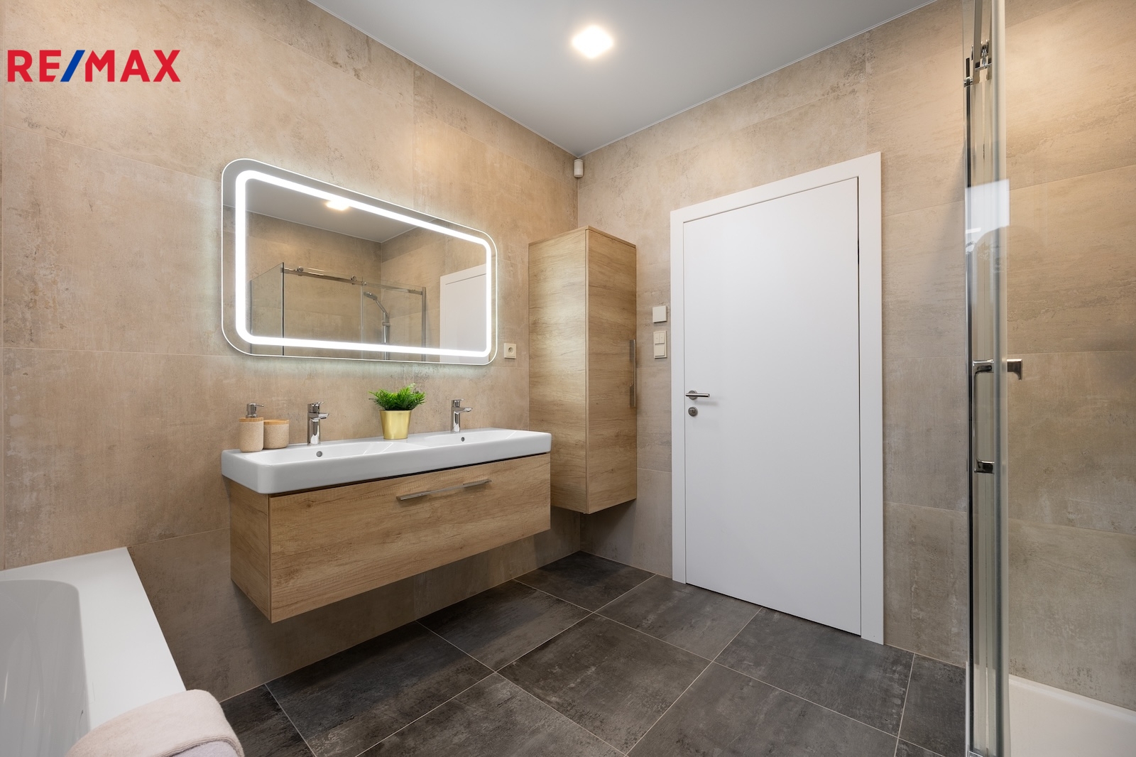 Dominantou domu je světlý obývací pokoj s kuchyní a přímým vstupem na terasu. K dispozici jsou tři samostatné ložnice, koupelna s vanou i sprchovým koutem, dvě samostatné toalety, praktická spíž a technická místnost. Dům je vybaven moderními technologiemi – teplovodním podlahovým vytápěním poháněným tepelným čerpadlem vzduch–voda, klimatizací, fotovoltaikou, venkovními žaluziemi a chytrou domácností s dálkovým ovládáním vstupu, topení i alarmu. Samozřejmostí je kamerový systém, brána na dálkové ovládání a vestavěné úložné prostory. Díky energeticky úspornému provozu se aktuální náklady na elektřinu a vytápění pohybují kolem 2 700 Kč měsíčně.