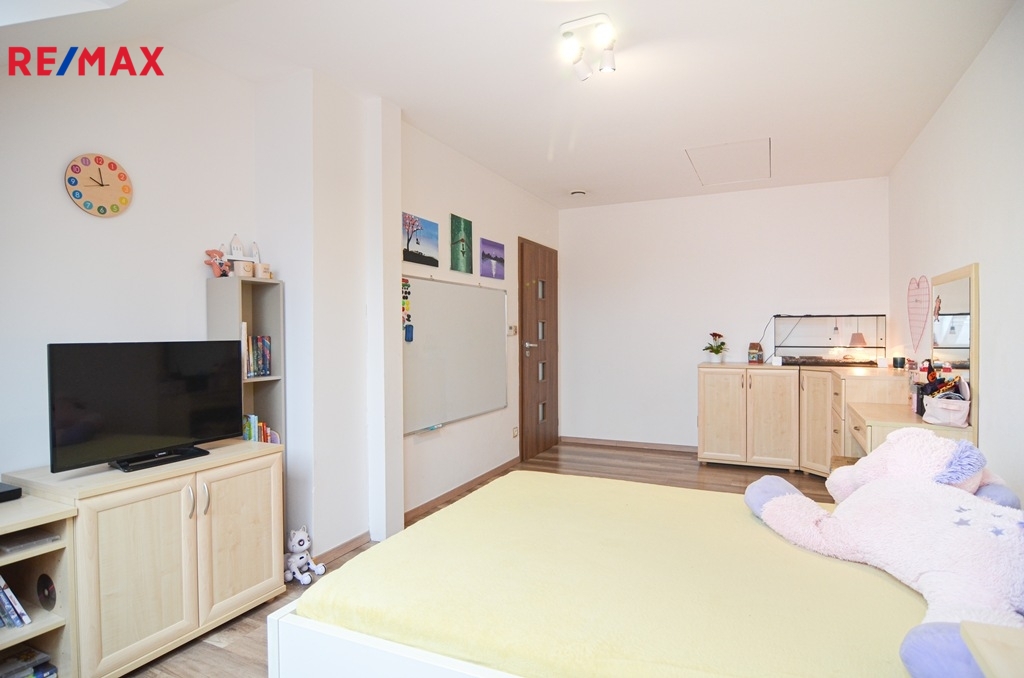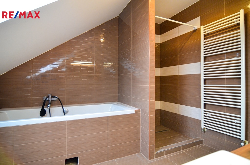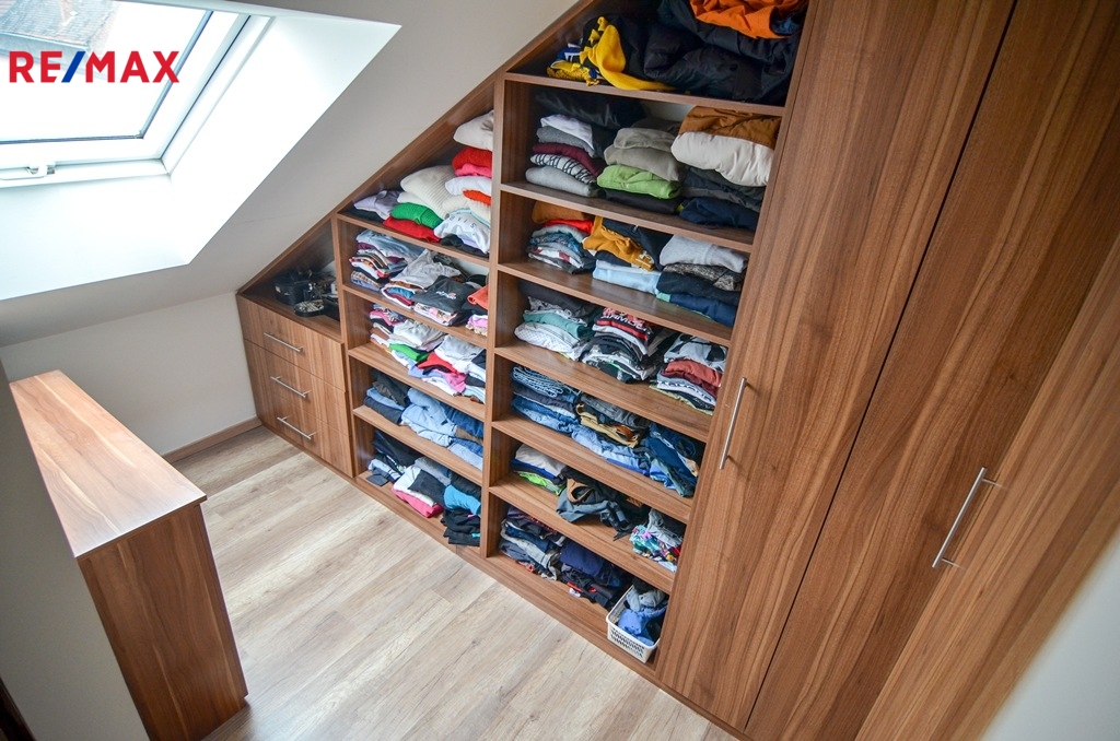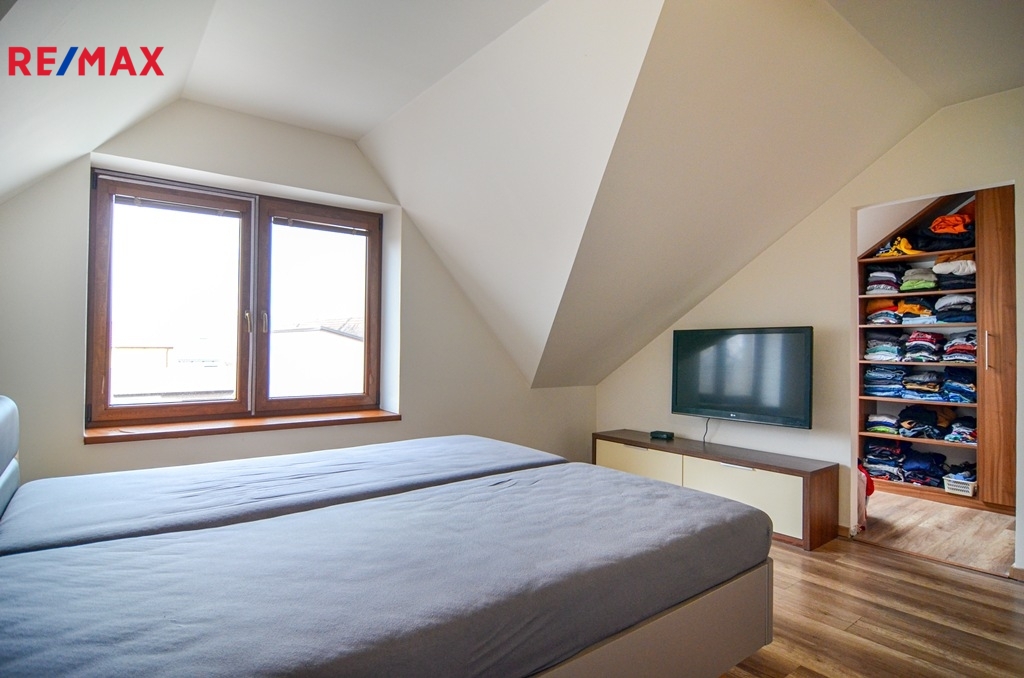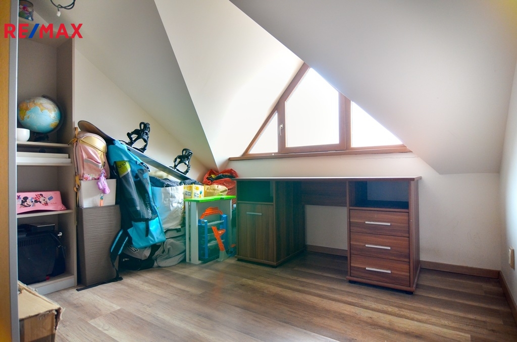 V podkroví jsou k dispozici tři samostatné pokoje (dva dětské pokoje), ložnice se šatnou, koupelna vybavená vanou i sprchovým koutem, samostatná toaleta a pracovna. V podkroví je instalována klimatizace, která zajišťuje komfort i během letních měsíců.