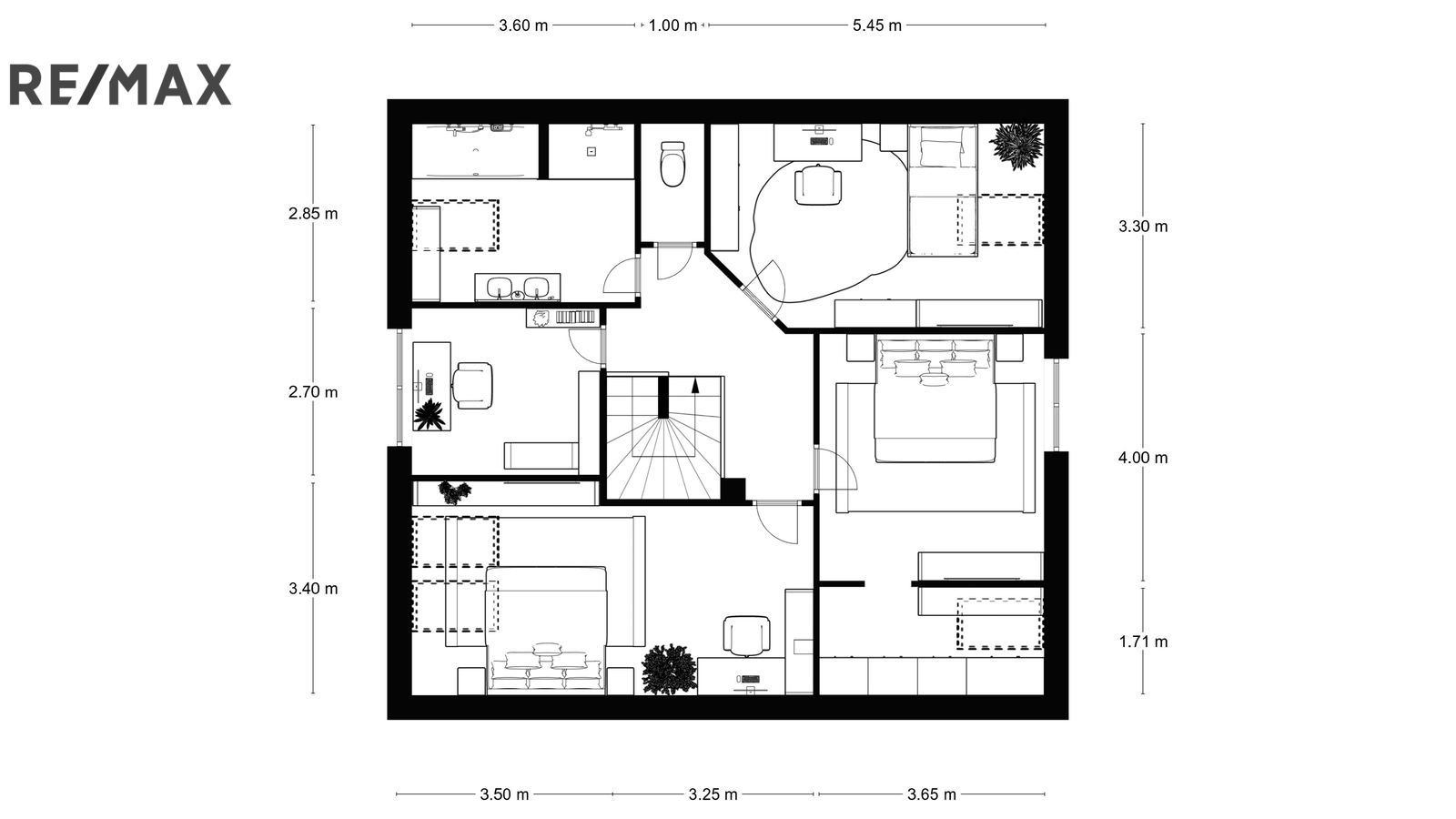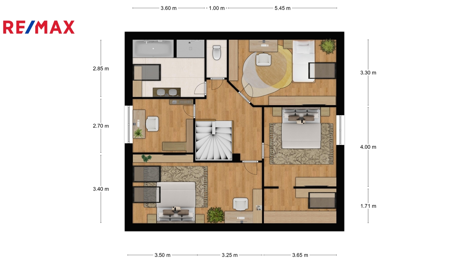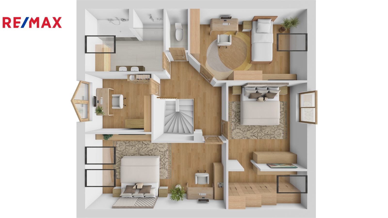 V podkroví jsou k dispozici tři samostatné pokoje (dva dětské pokoje), ložnice se šatnou, koupelna vybavená vanou i sprchovým koutem, samostatná toaleta a pracovna. V podkroví je instalována klimatizace, která zajišťuje komfort i během letních měsíců.