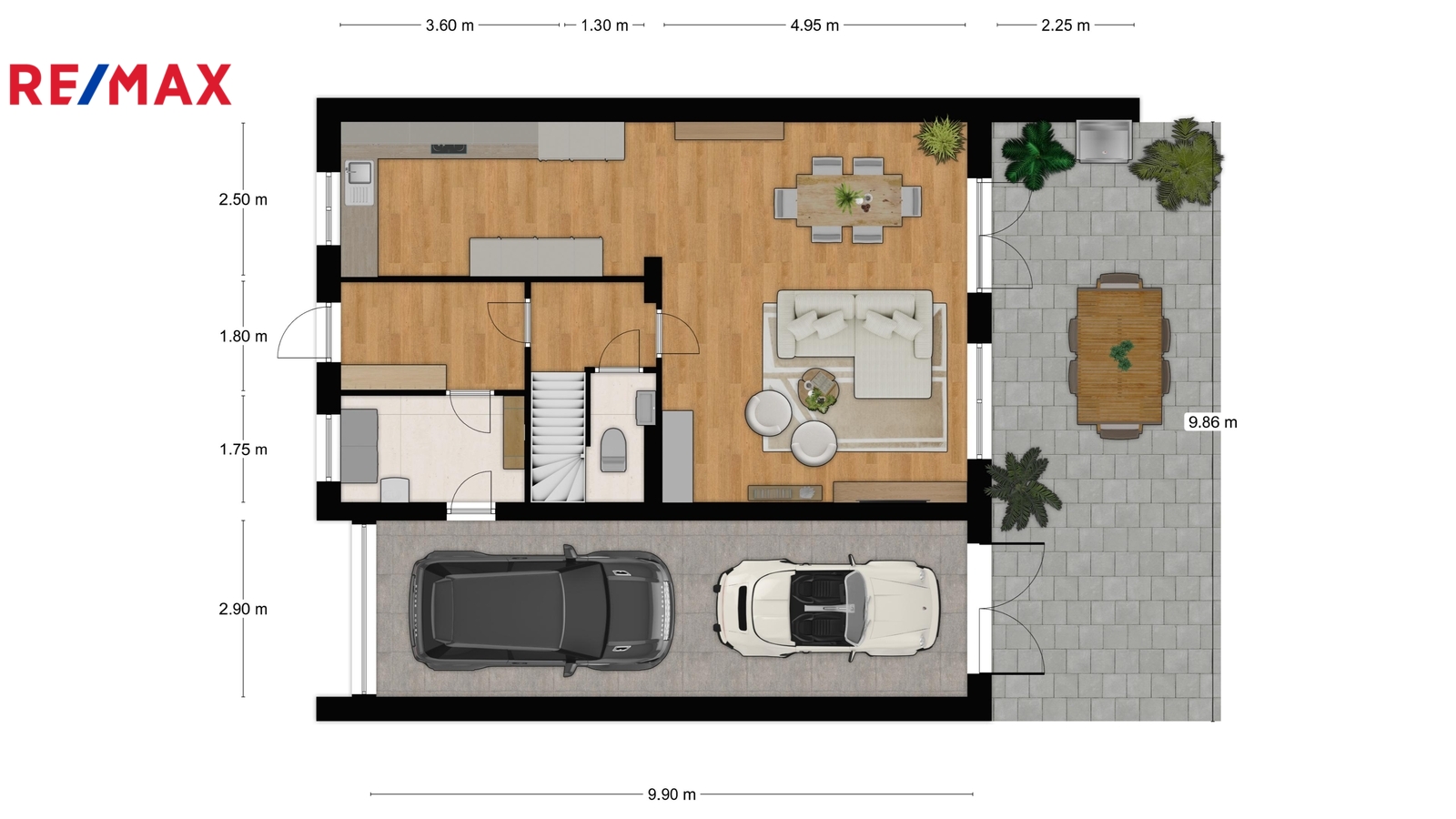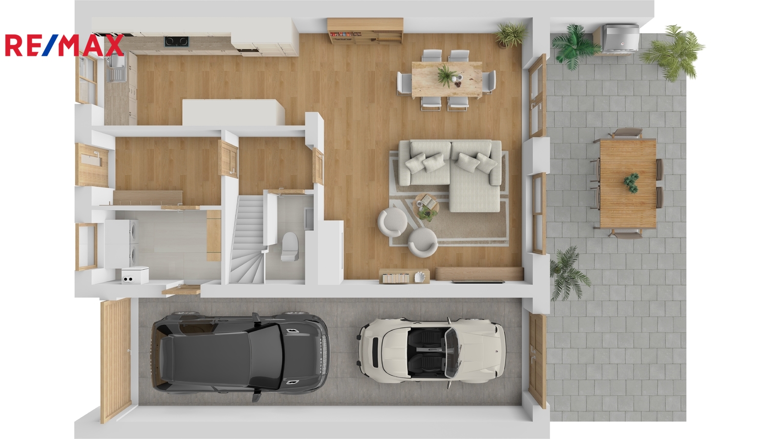 V přízemí domu se nachází prostorný obývací pokoj s přímým vstupem na terasu a zahradu. Atmosféru tohoto prostoru příjemně dokresluje krb, který vytváří útulné prostředí zejména v zimních měsících. Dále je zde kuchyně, vstupní hala, samostatná toaleta, technická místnost a garáž s možností parkování dvou vozidel za sebou. Před domem jsou k dispozici další dvě parkovací místa.