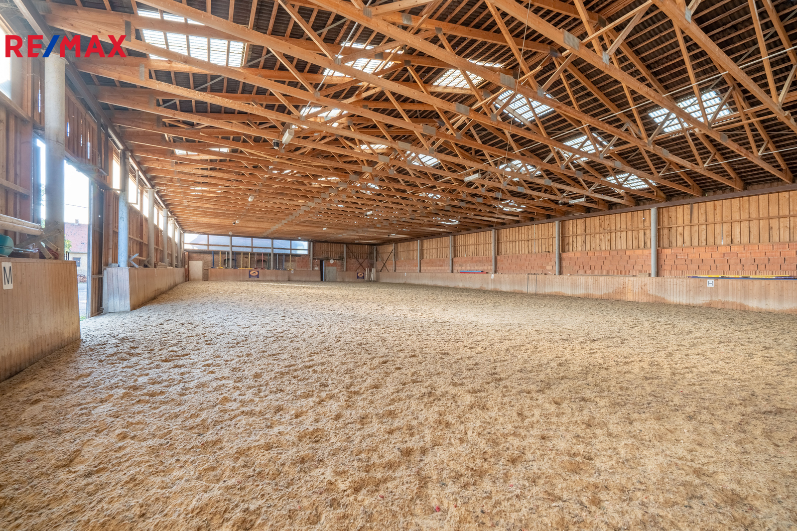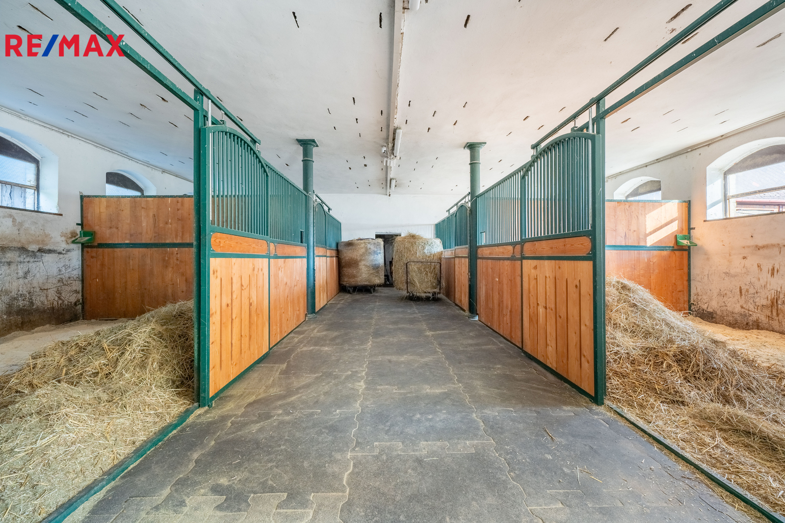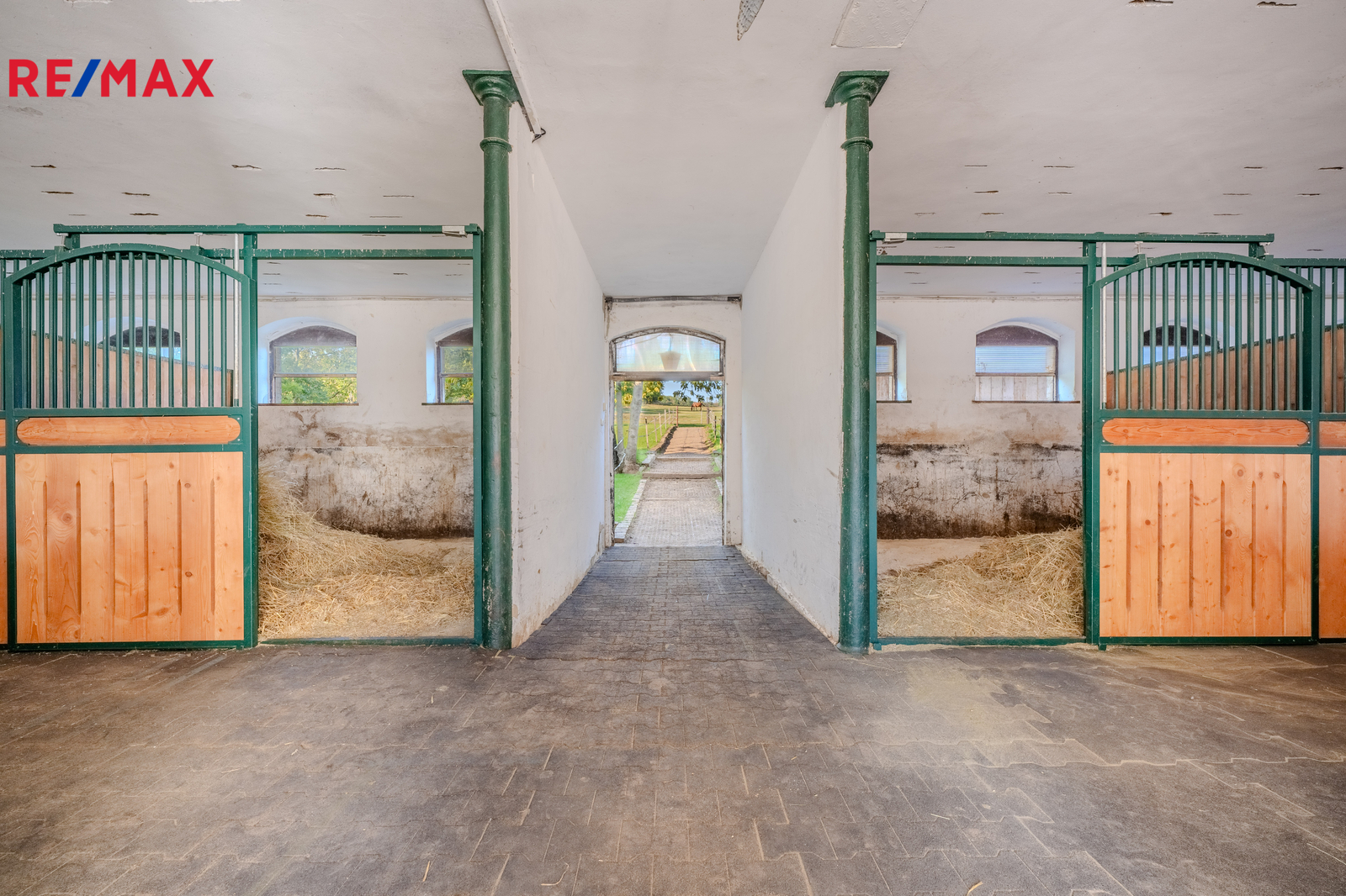 Další budova slouží jako prostorné stáje s kapacitou pro více než čtyřicet koní. Zázemí je plně funkční a uzpůsobené pro každodenní provoz s důrazem na pohodlí zvířat i efektivitu práce. U vstupu do areálu se nachází třetí objekt určený k rekonstrukci, který nabízí možnost vybudovat apartmány pro hosty či ubytování pro personál.