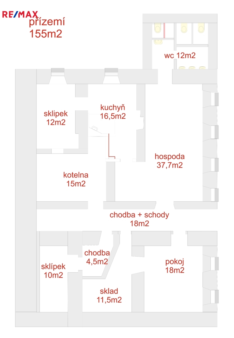 V přízemí o celkové výměře 155 m2 se nachází bývalý lokál hostince o výměře cca 38 m2, navazující malá kuchyňka, dále příslušenství, sklady, kotelna, sklípek a sociální zařízení.