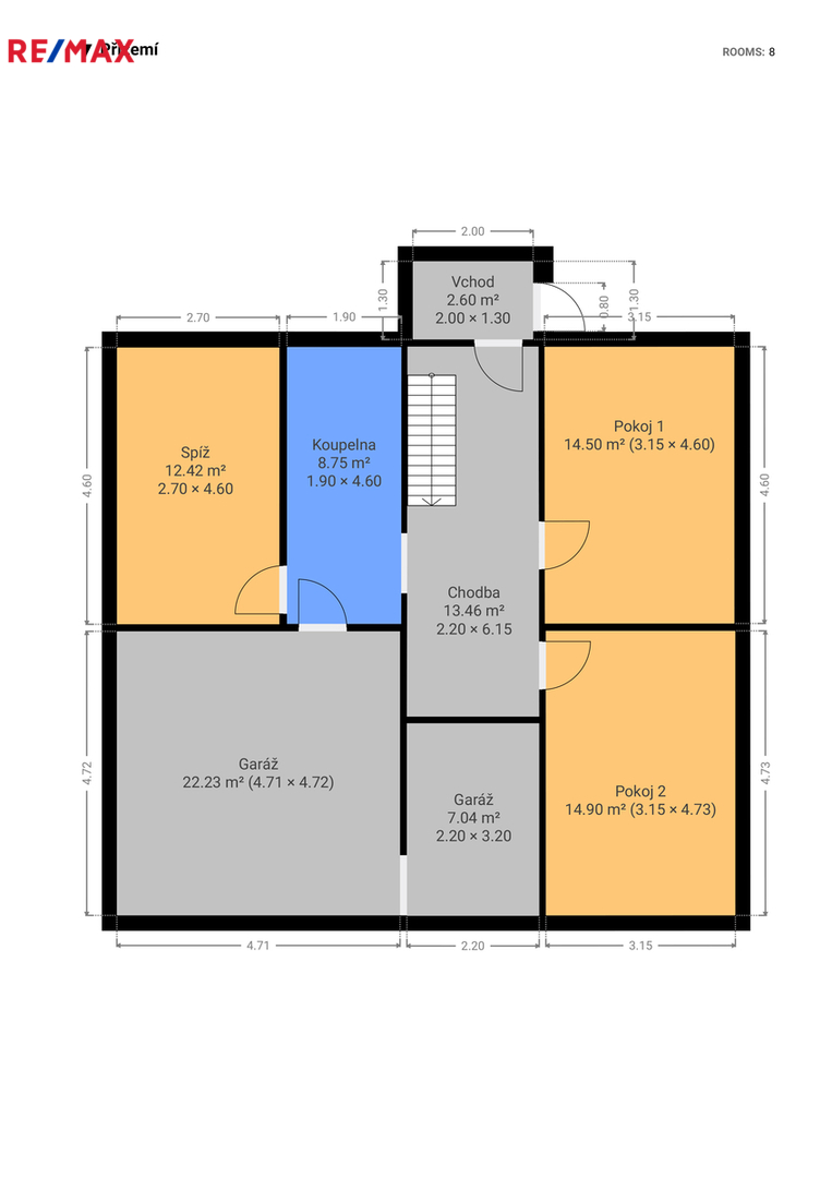 Přízemí: prostorná garáž, dva pokoje, koupelna, sklad