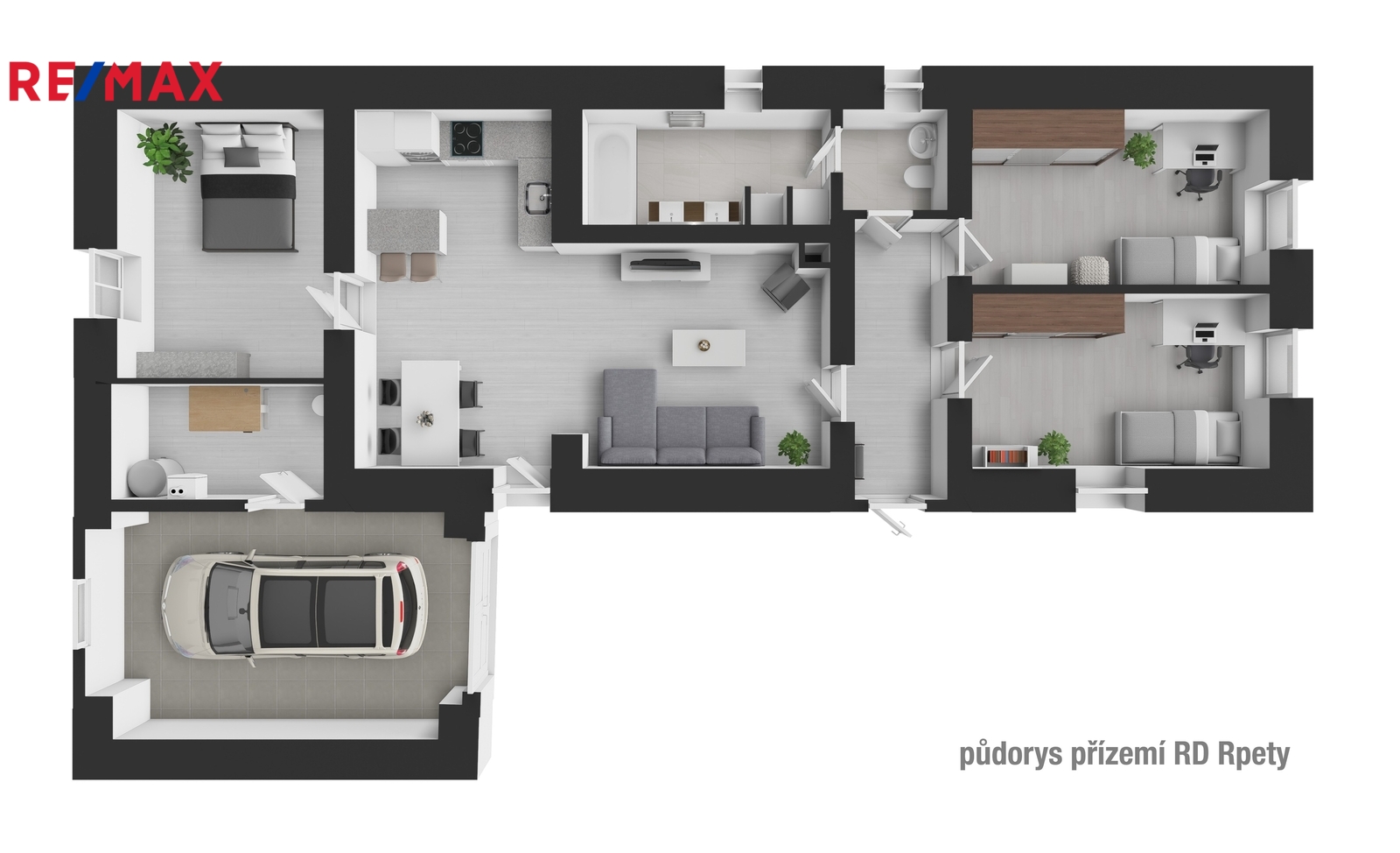 Nabízíme k prodeji prostorný rodinný dům o dispozici 4+kk, který se nachází v klidné části obce Rpety. Dům má v přízemí užitnou plochu 108 m² a dalších 136 m² v podkroví, kde již existuje jeden pokoj (17.6 m²) nad garáží a zbývající půdní prostor je možné přestavět na plnohodnotné obytné místnosti. Celková výměra pozemku činí 472 m².