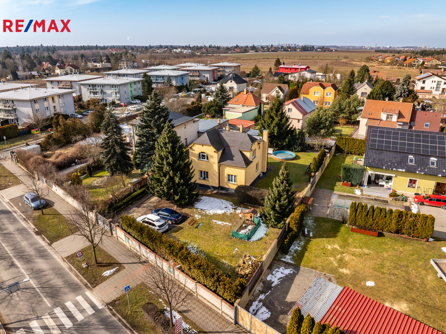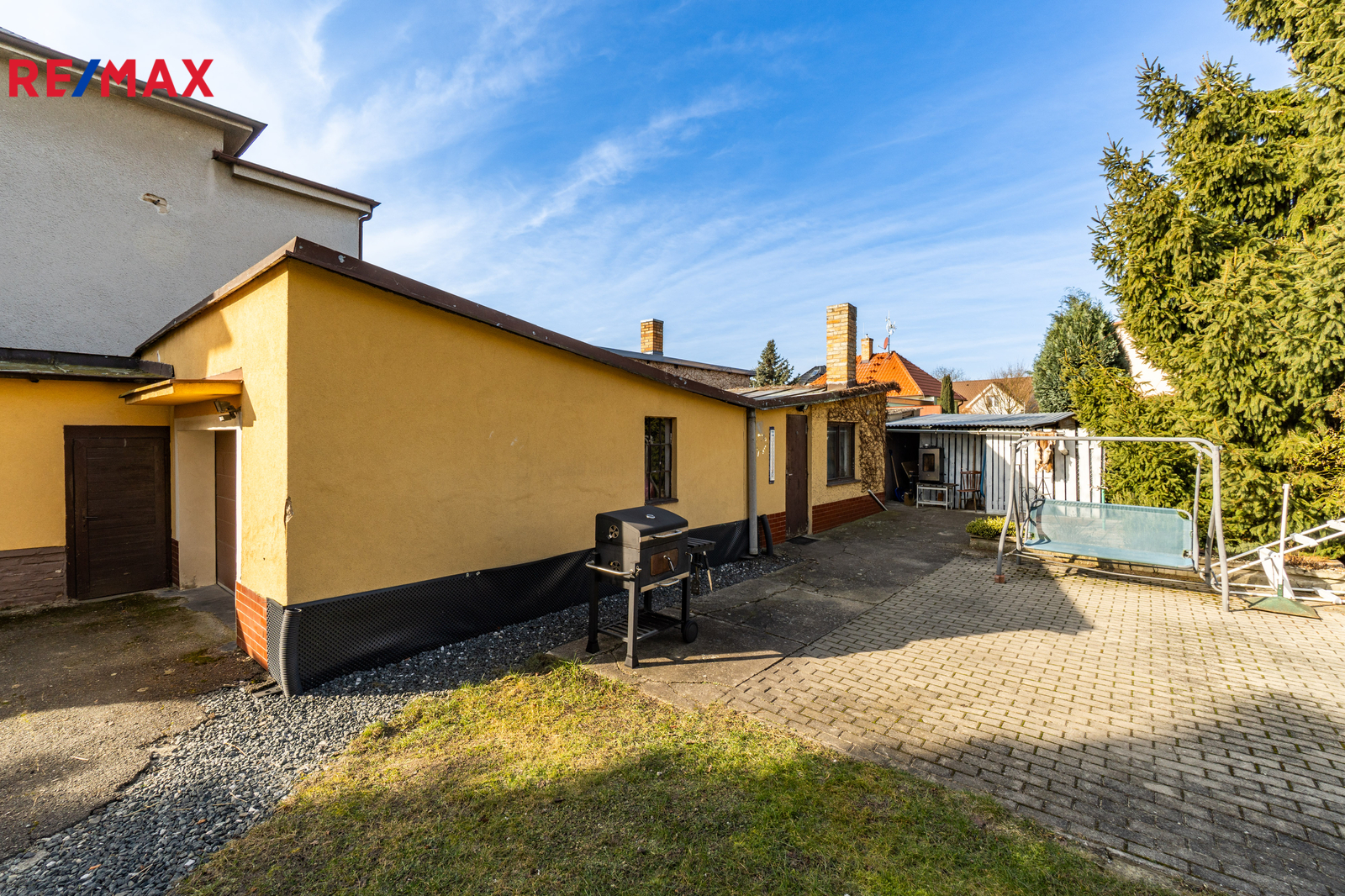 Dům je na pozemku se vzrostlými stromy situován s odstupem od hlavní komunikace. V přední části je příjezdová cesta s parkovací plochou pro 2 vozy a travnatá plocha se vzrostlou zelení. Za domem se nachází garáž pro jedno auto spojená s prostornou dílnou s montážní jámou, hospodářské zázemí, kopaná studna, nádrž na dešťovou vodu a bazén. Pozemek o celkové výměře 1205 m² je tak přirozeně rozdělen na klidovou zónu s velkou mírou soukromí a přední užitnou část.