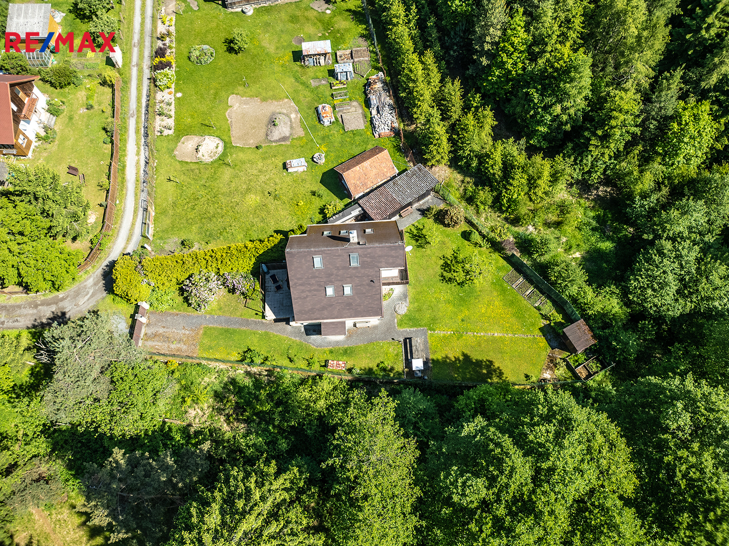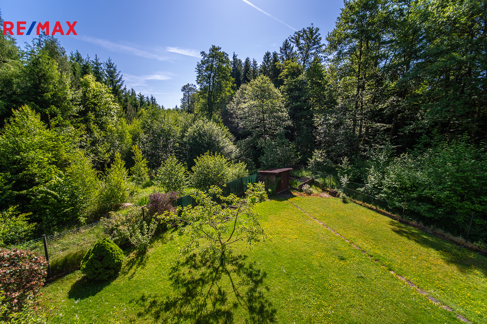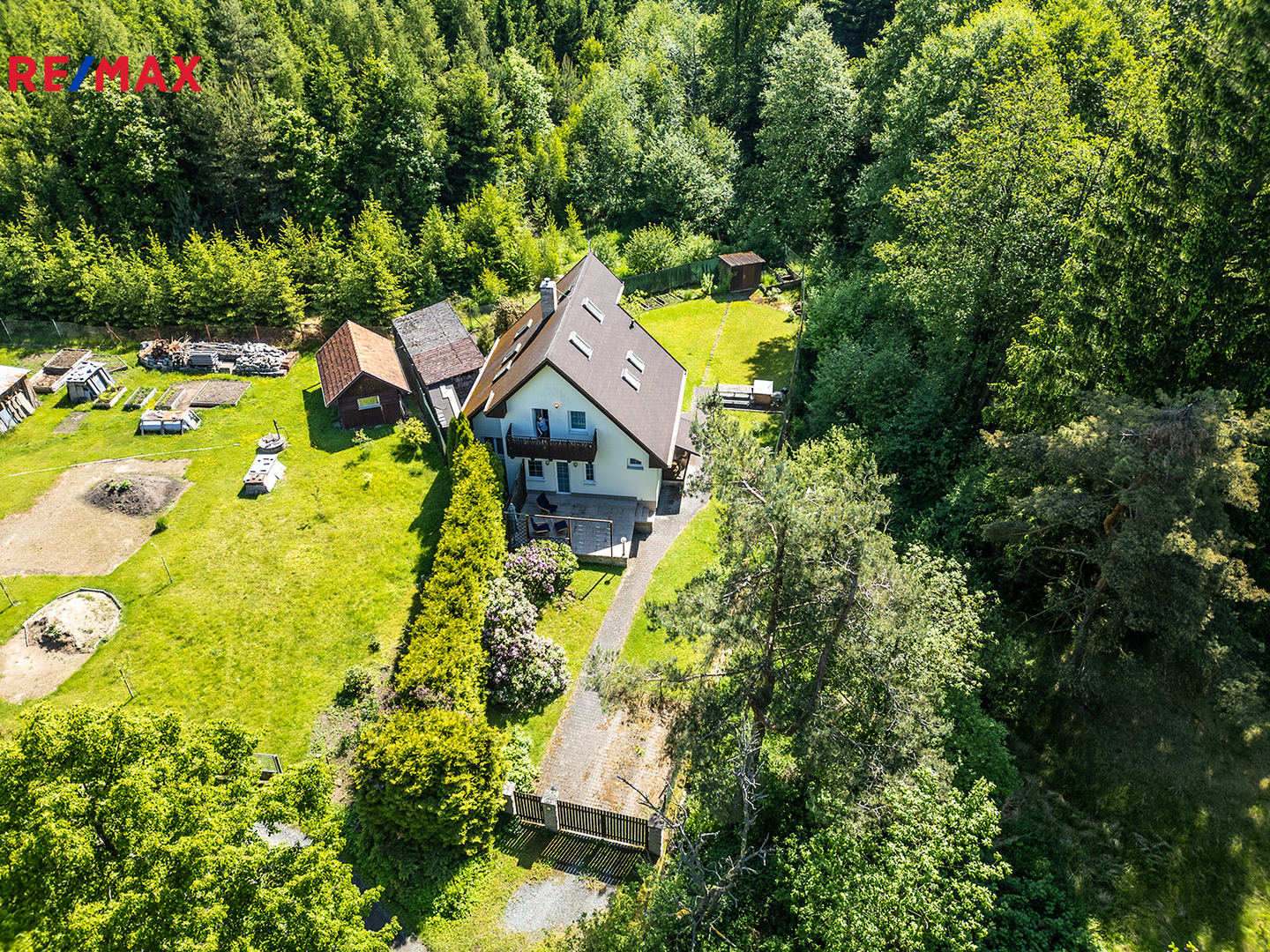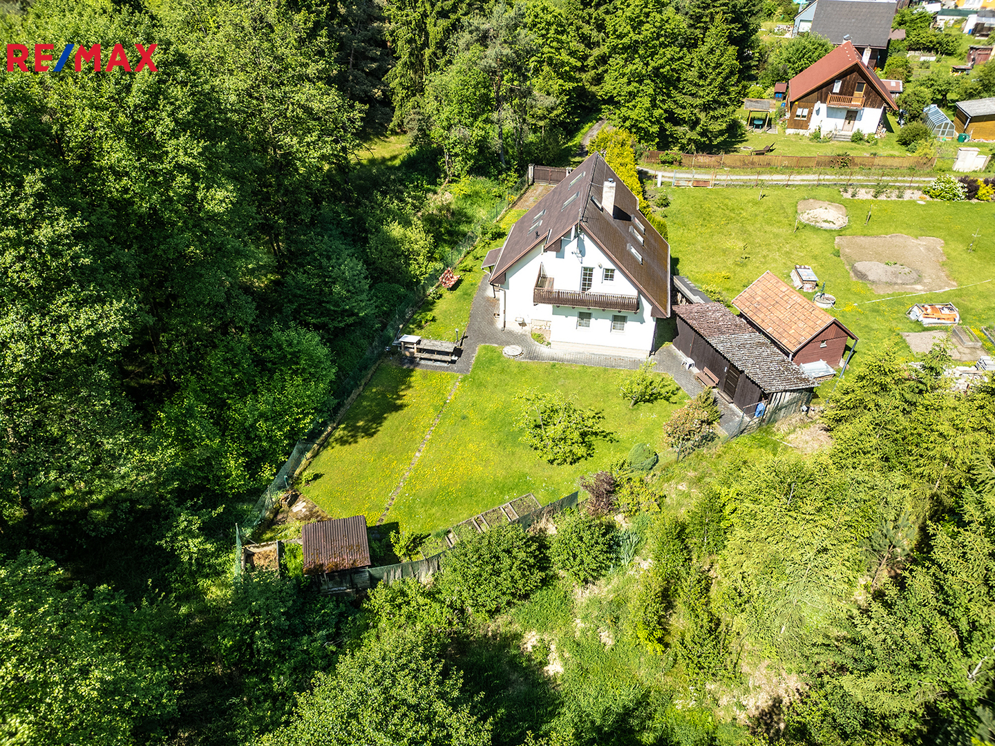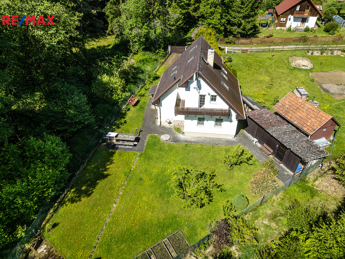 V přízemí se pak nachází další pokoj (ložnice/pracovna), koupelna, toaleta a praktická spíž. V 1.patře najdete další dva pokoje s toaletou a koupelnou. Z obou pokojů v 1.patře se dá vyjít na balkóny s výhledem do zahrady a okolní přírody. K dispozici je ještě velká půda využitelná jako úložný prostor a nebo se nabízí po úpravě možné využití jako další obytný prostor. Dům je částečně podsklepen a sklep se dá využít pro uskladnění ovoce a zeleniny.