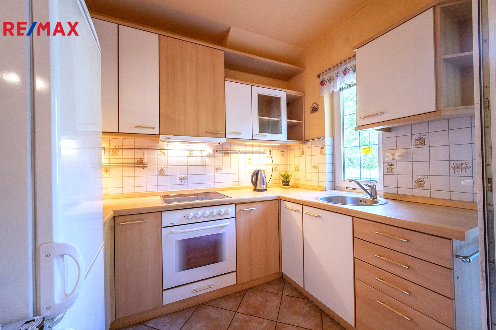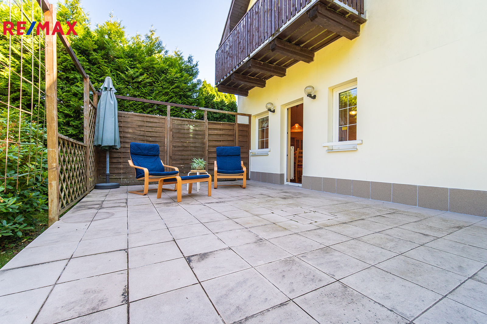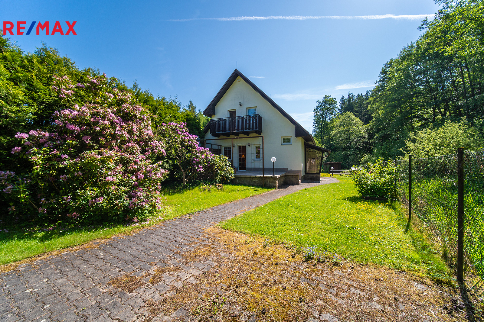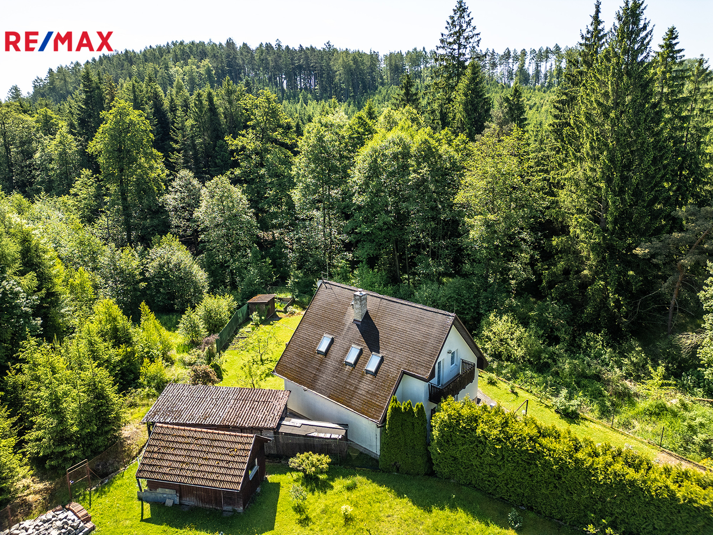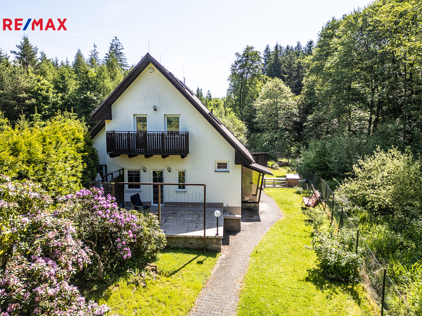 V přízemí se pak nachází další pokoj (ložnice/pracovna), koupelna, toaleta a praktická spíž. V 1.patře najdete další dva pokoje s toaletou a koupelnou. Z obou pokojů v 1.patře se dá vyjít na balkóny s výhledem do zahrady a okolní přírody. K dispozici je ještě velká půda využitelná jako úložný prostor a nebo se nabízí po úpravě možné využití jako další obytný prostor. Dům je částečně podsklepen a sklep se dá využít pro uskladnění ovoce a zeleniny.