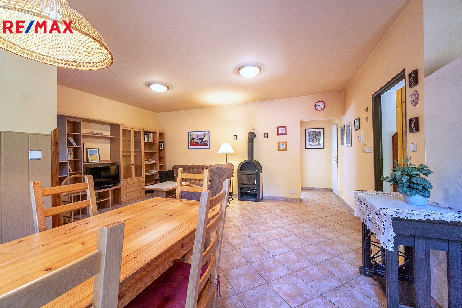 A čím Vás dům rozhodně zaujme? Srdce domu tvoří prostorný obývací pokoj s kuchyní, kde můžete trávit pohodově společný čas s rodinou u plápolajícího ohně v krbových kamnech. Nebo v létě vyjít z obývacího pokoje na venkovní terasu, která nabízí příjemné posezení na večerním slunci.