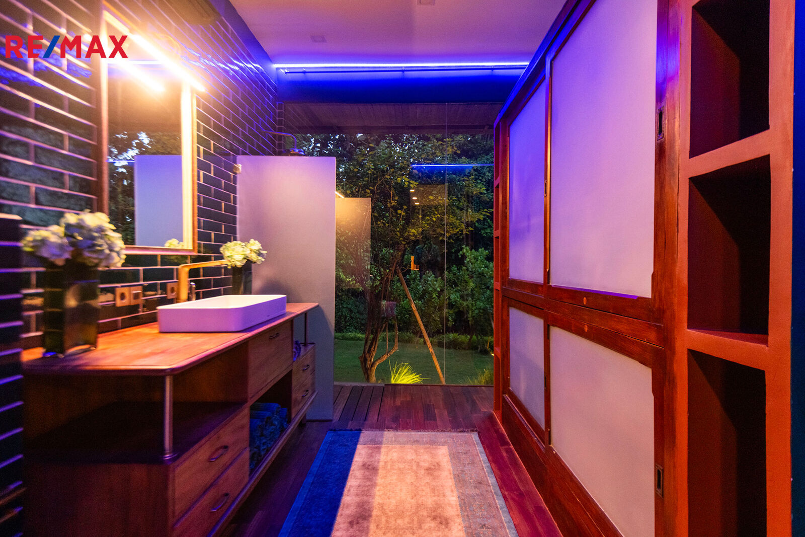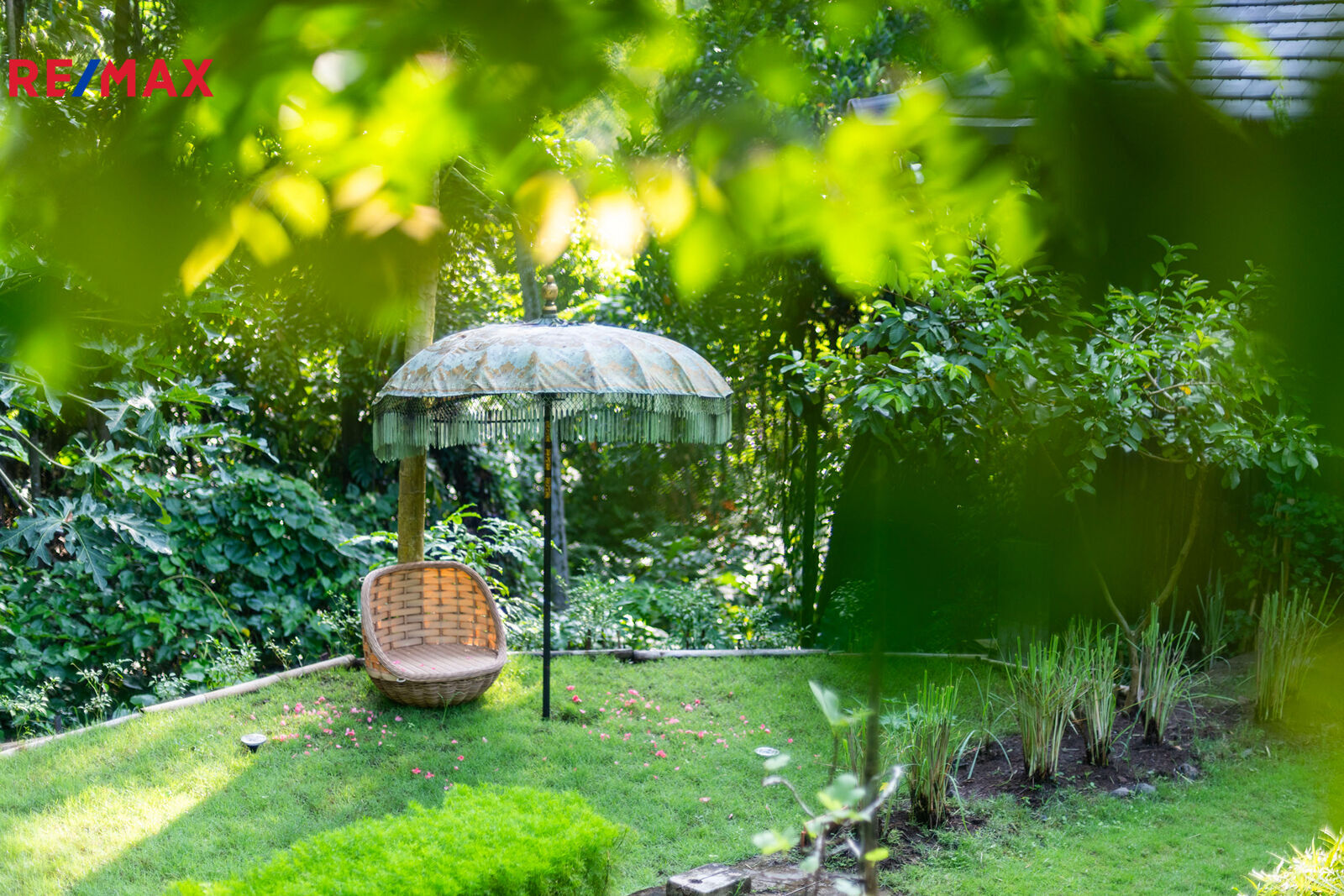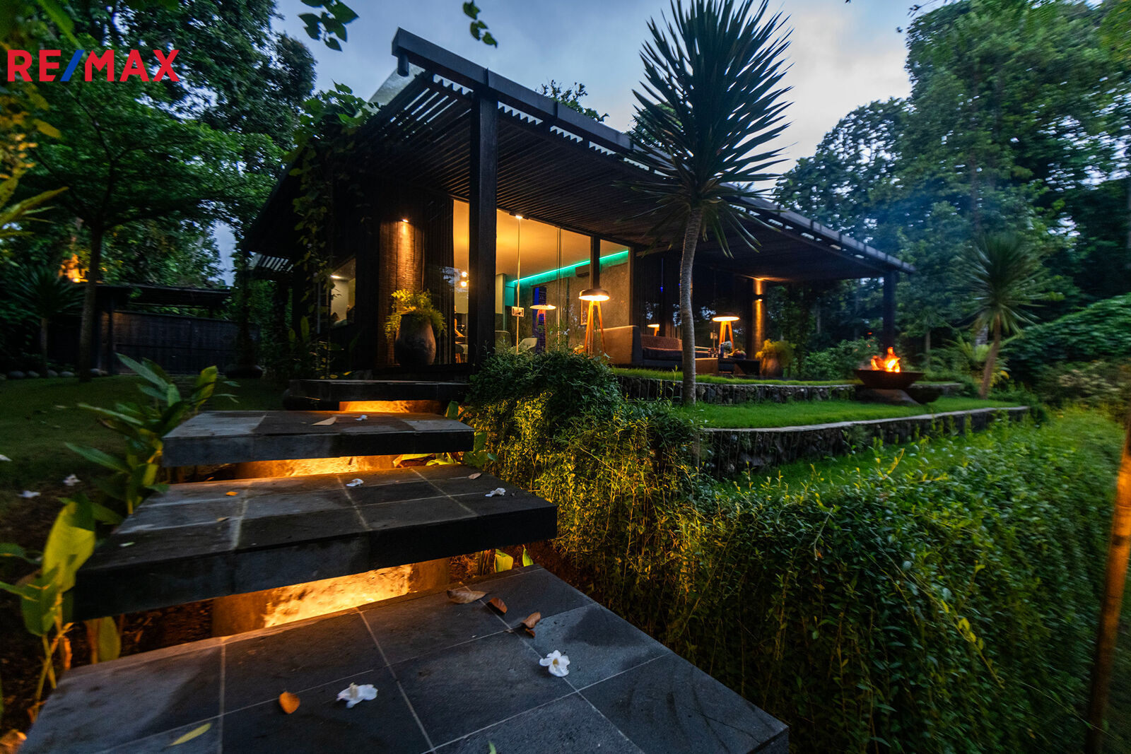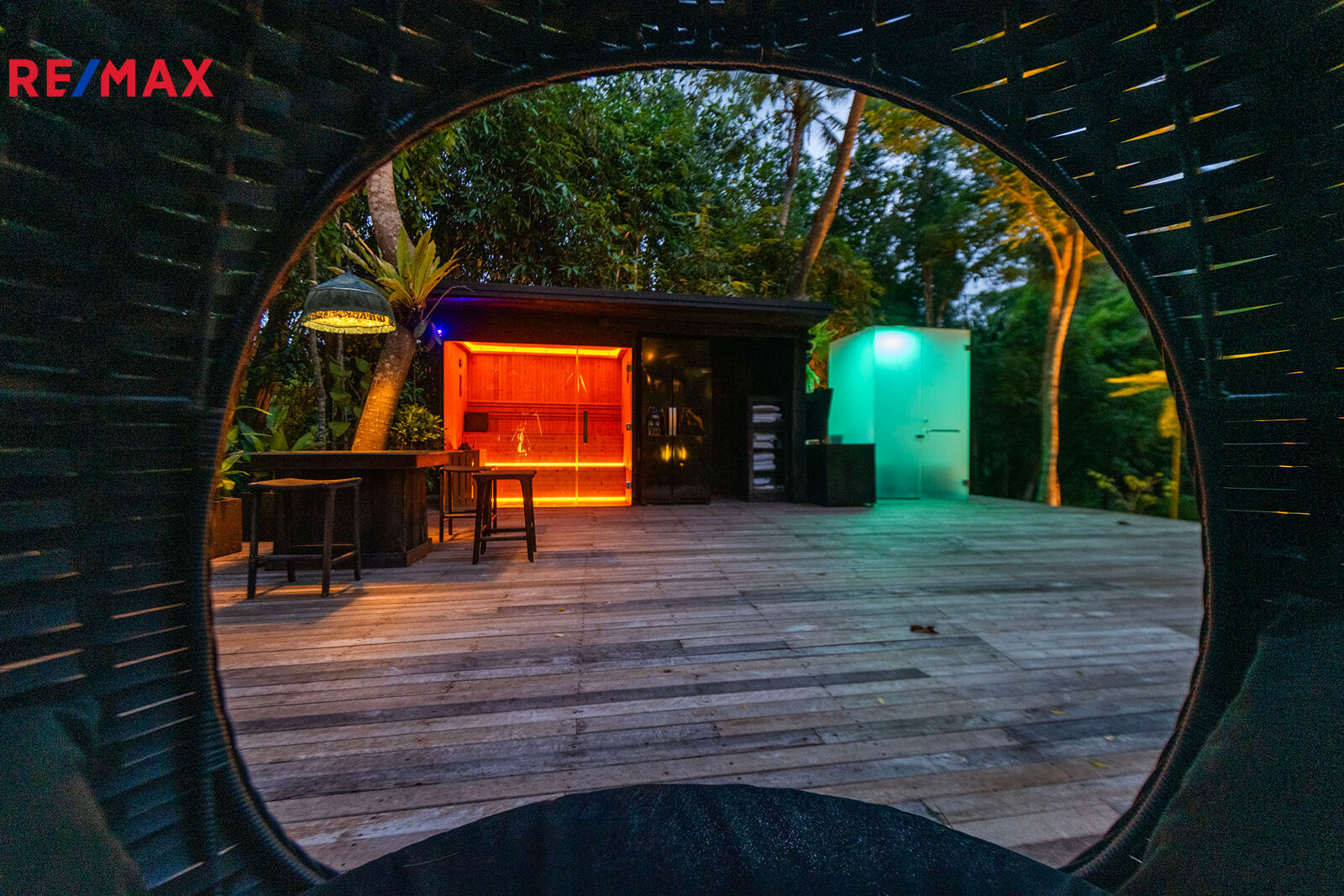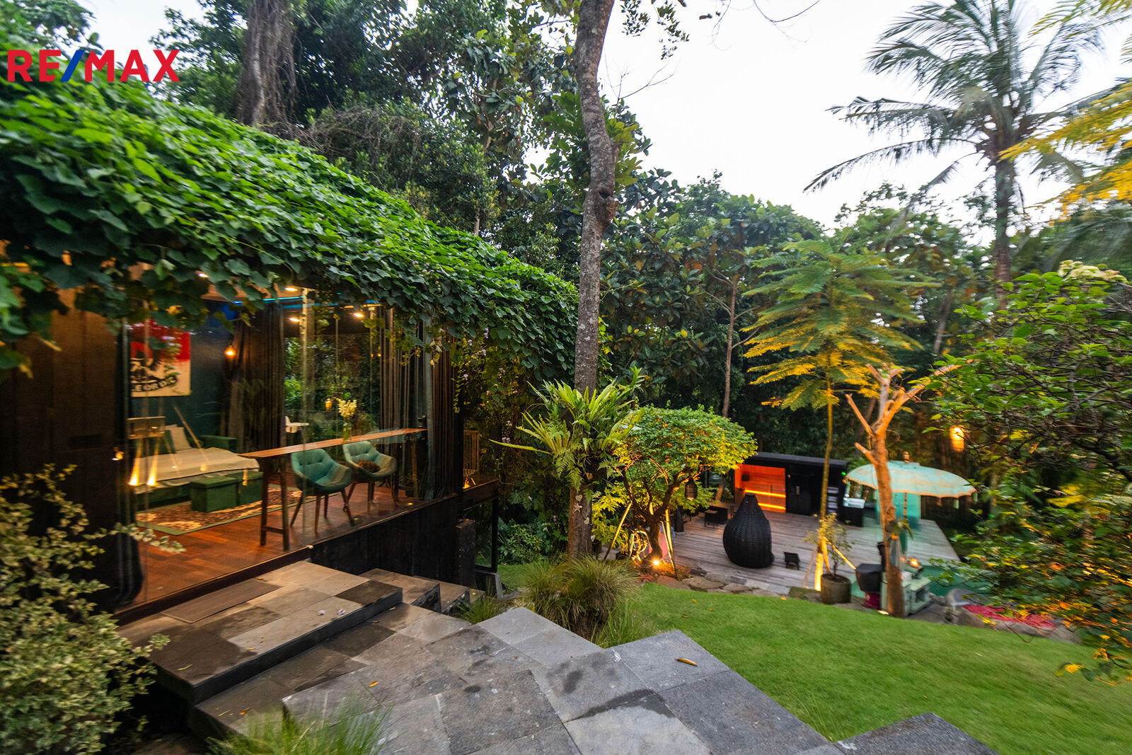 Zahrada jako z pohádky – plná palem, kapradin, stromů i tichých zákoutí, kde můžete meditovat, odpočívat nebo jen pozorovat ptáky. K tomu terasa s venkovním sezením, letní kuchyně, večerní světla podtrhující romantickou atmosféru a naprosté ticho – jen šumění větru a přírody.