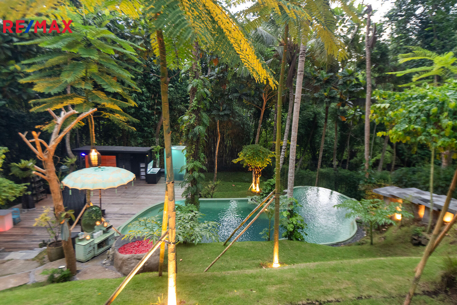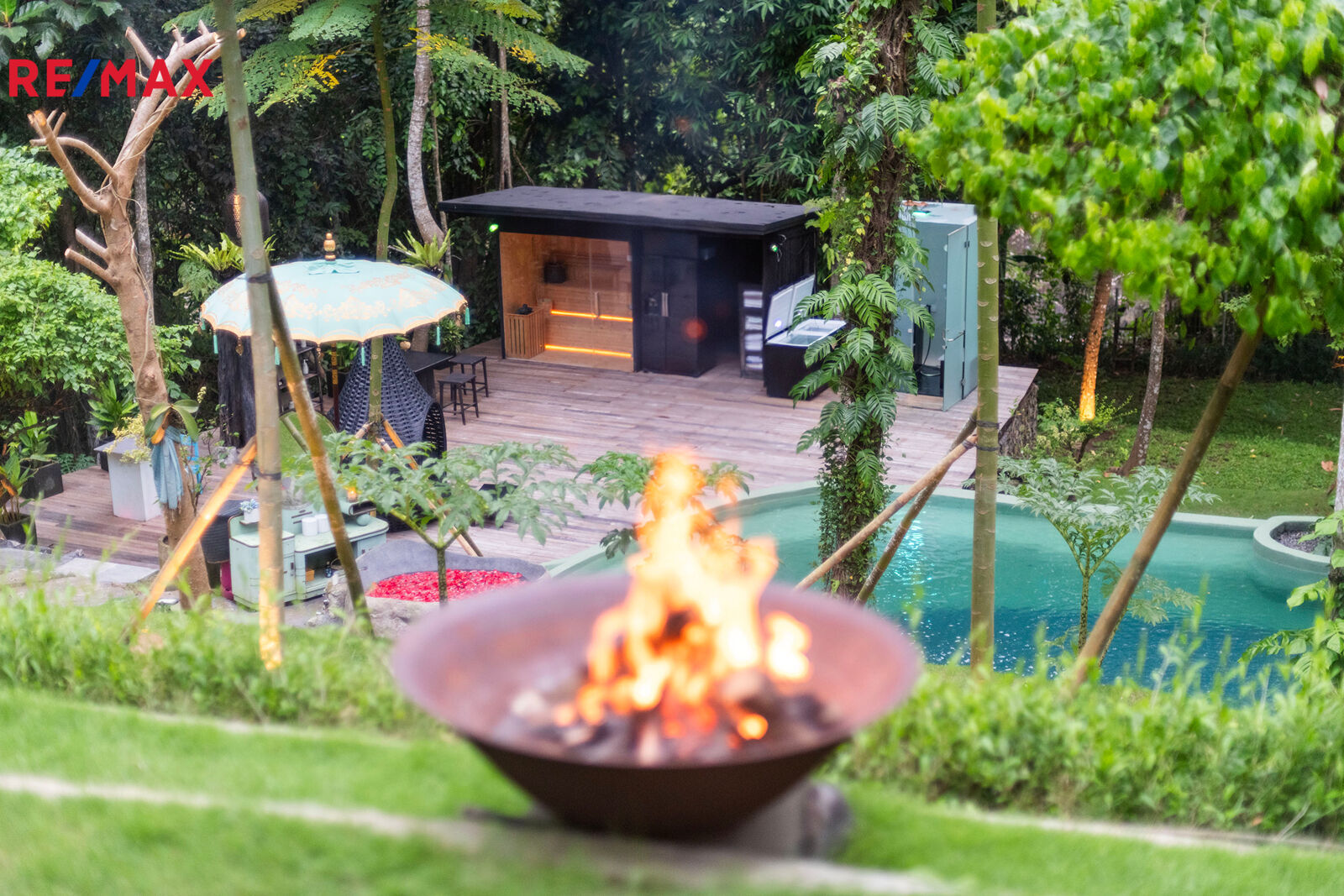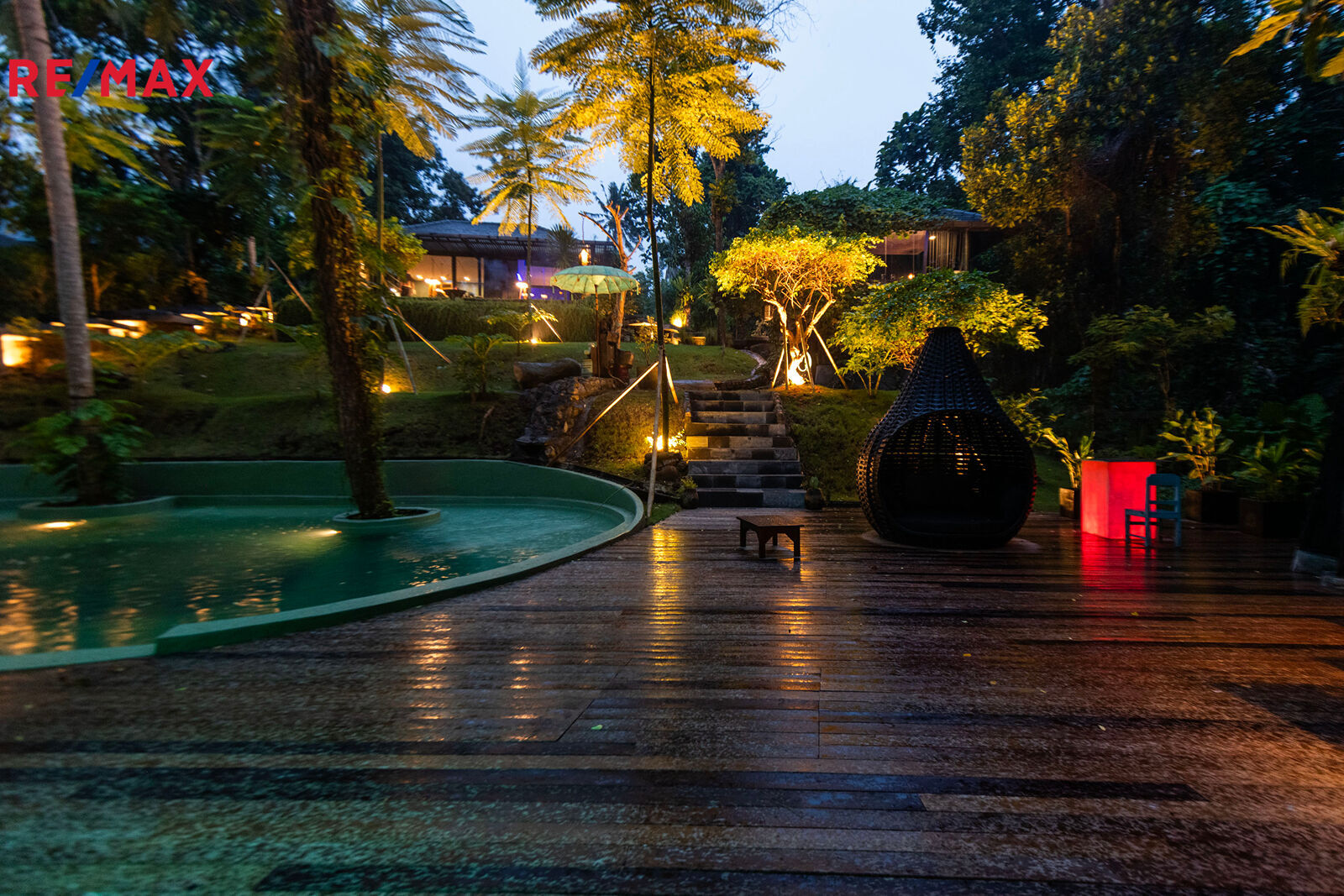 Na pozemku se nachází bazén, který připomíná tropickou lagunu. Zakřivené linie, stromy prorůstající přímo z vody, noční osvětlení, relax zóna se saunou a párou a přírodní pramen… místo, kde zcela zapomenete na realitu.