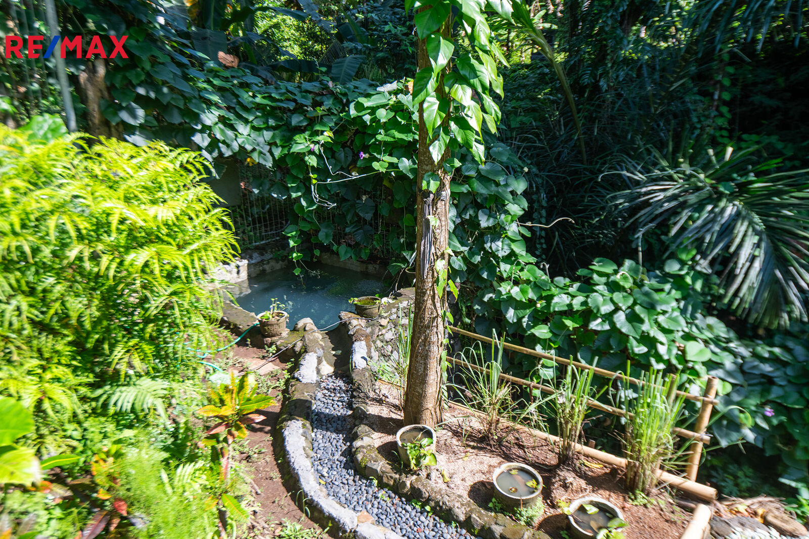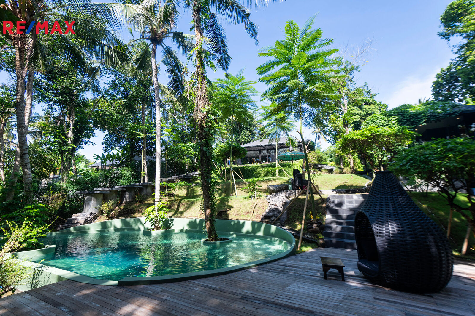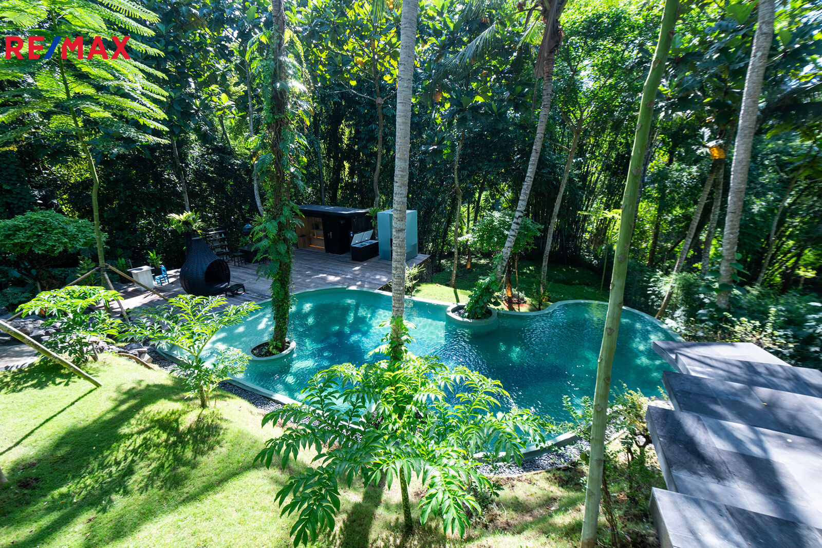 Na pozemku se nachází bazén, který připomíná tropickou lagunu. Zakřivené linie, stromy prorůstající přímo z vody, noční osvětlení, relax zóna se saunou a párou a přírodní pramen… místo, kde zcela zapomenete na realitu.