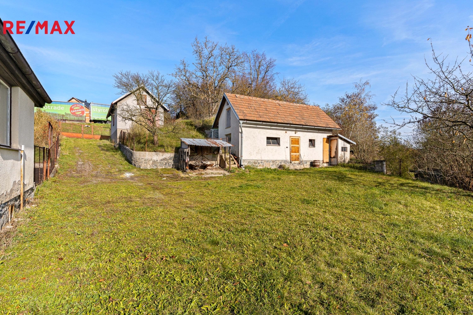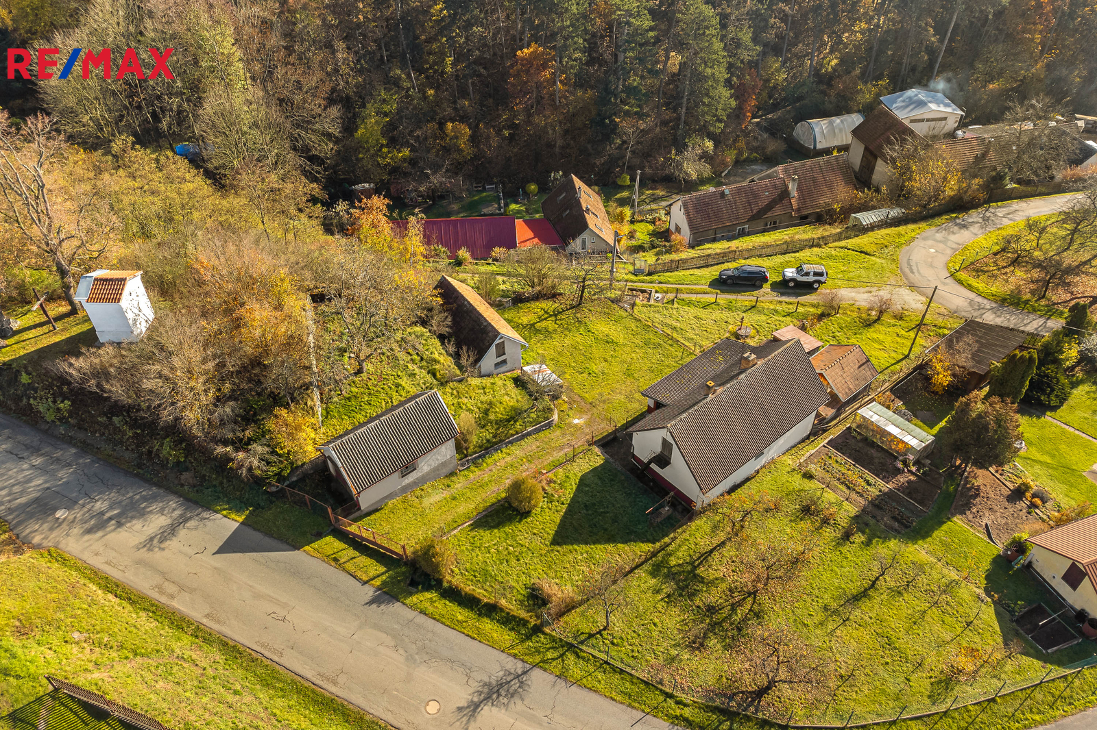 Nemovitost stojí na prostorném, jižně orientovaném pozemku o celkové výměře 1 455 m² a kromě samotné chalupy k ní náleží také soubor vedlejších staveb – zděné i dřevěné kůlny a zděné garáže, které poskytují dostatek prostoru pro dílnu, skladování i parkování.