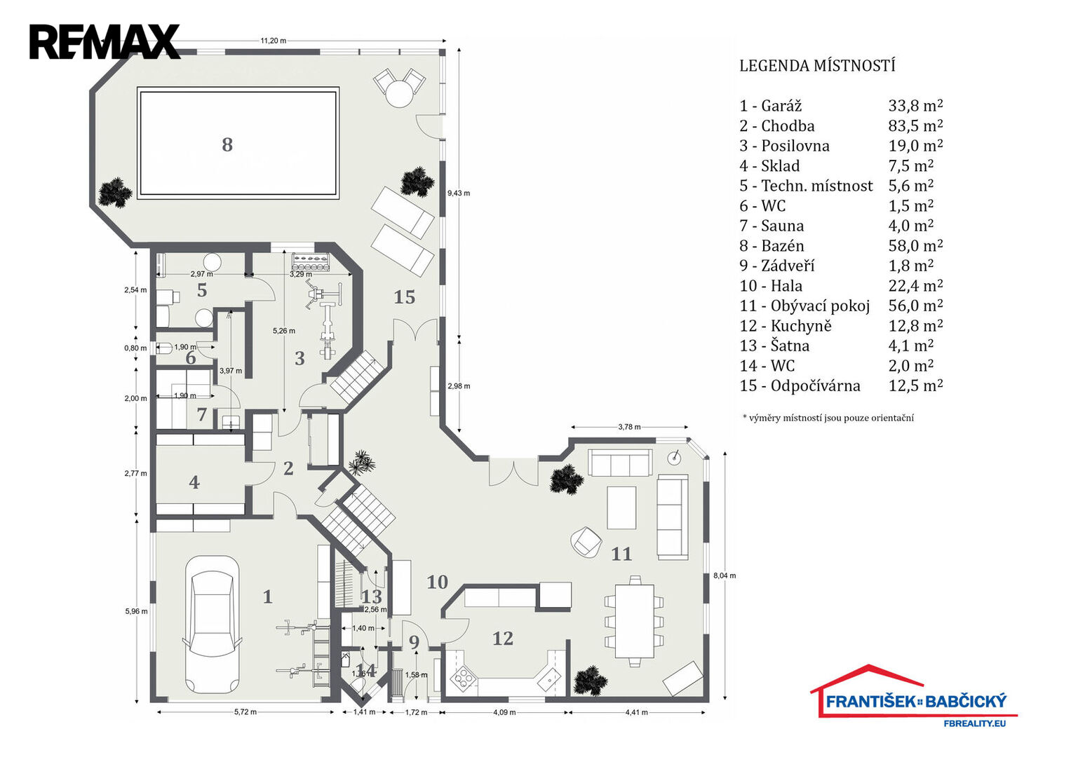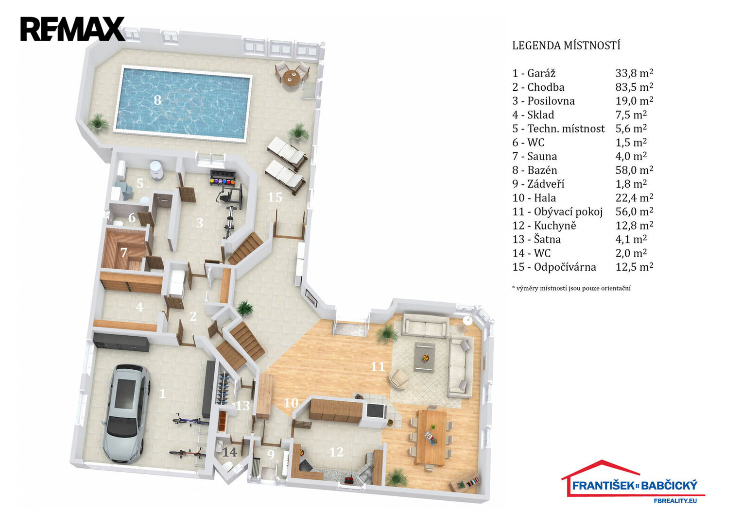 Suterén tvoří dvojgaráž 33,8 m², chodba 8,5 m², posilovna 19 m², sklad 7,5 m², technická místnost 5,6 m², WC 1,5 m² a sauna 4 m², u které je sprchový kout a umyvadlo. Praktická jsou 2 schodiště – jedno přímo do předsíně v přízemí, druhé do relaxační zóny.