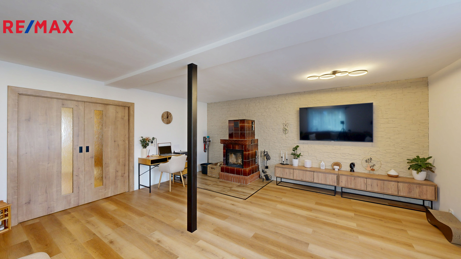 Dům disponuje čtyřmi samostatnými pokoji, oddělenou jídelnou a velkou kuchyní, což poskytuje dostatek prostoru pro vícečlennou rodinu. V přízemí se nachází obytná zóna domu. Je zde moderní kuchyně propojená s jídelnou, odkud vedou francouzská okna na terasu a do zahrady. Pokud rádi přijímáte návštěvy, oceníte opravdu prostorný obývací pokoj, kde si můžete užívat společné chvíle u kachlových krbových kamen, která dodají prostoru jedinečný ráz. Díky podlahovému vytápění bude váš domov vždy příjemný, ať už venku panuje jakékoli počasí.