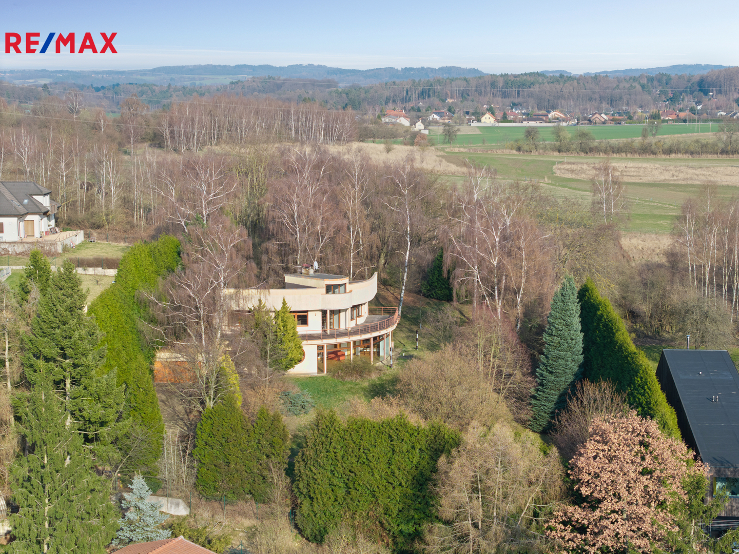 Z terasy je nádherný výhled do zeleně a do okolní krajiny. To, co tuto nemovitost skutečně odlišuje od ostatních, je kombinace naprostého soukromí a velkorysé výměry domu i pozemku.