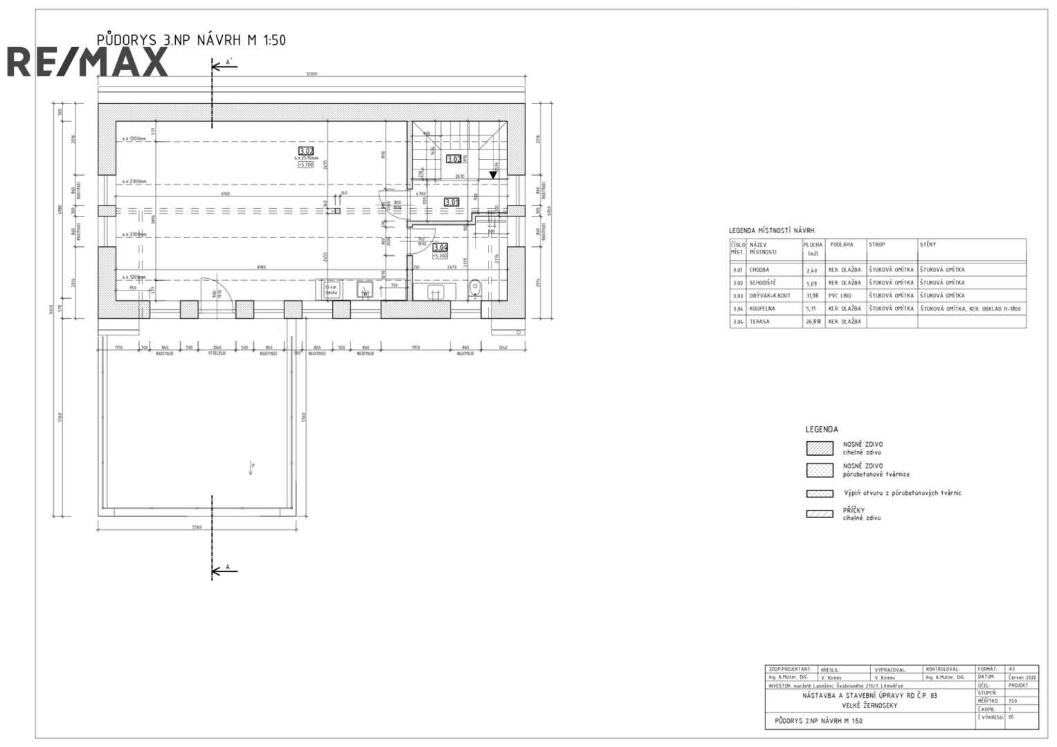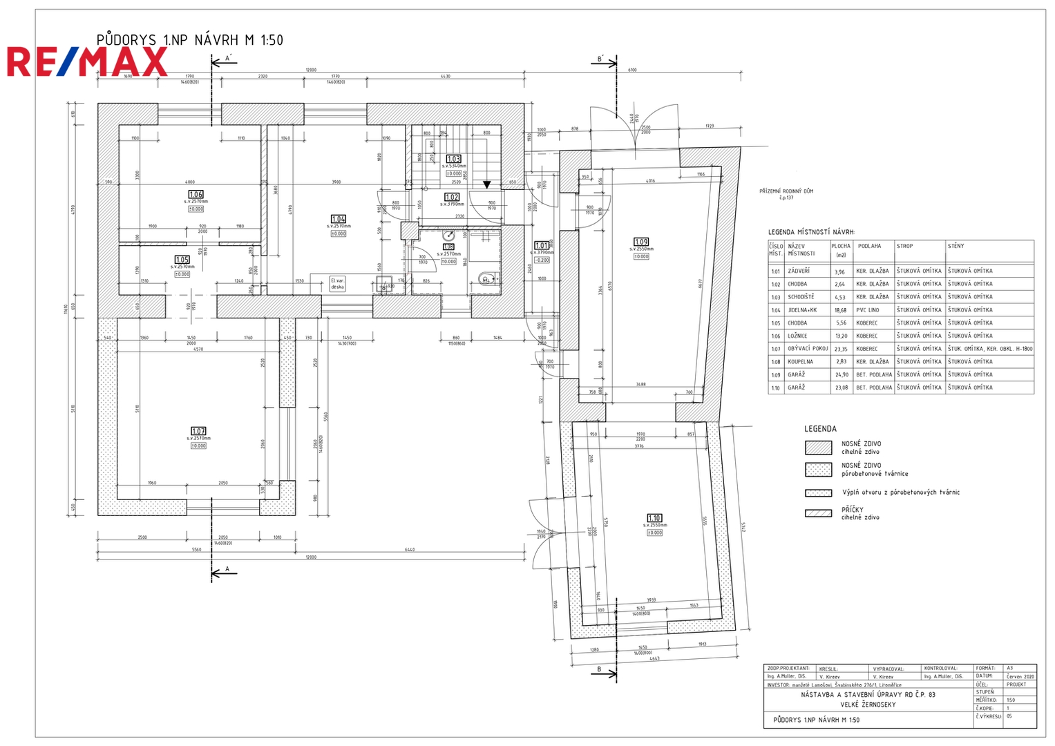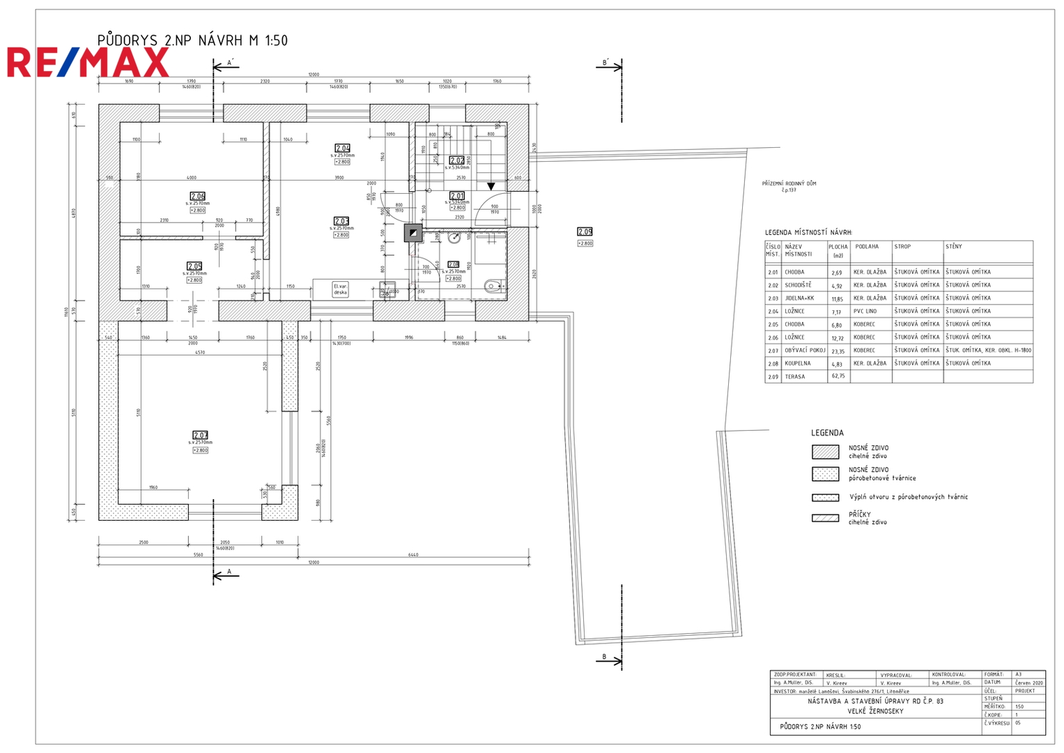 Rodinný dům je nyní dispozičně řešen jako 2 totožné bytové jednotky 3+KK každá o užitné ploše 63 m2. Podkroví je připravené na vybudování další jednotky 1 +KK 38m2 s terasou 25m2.