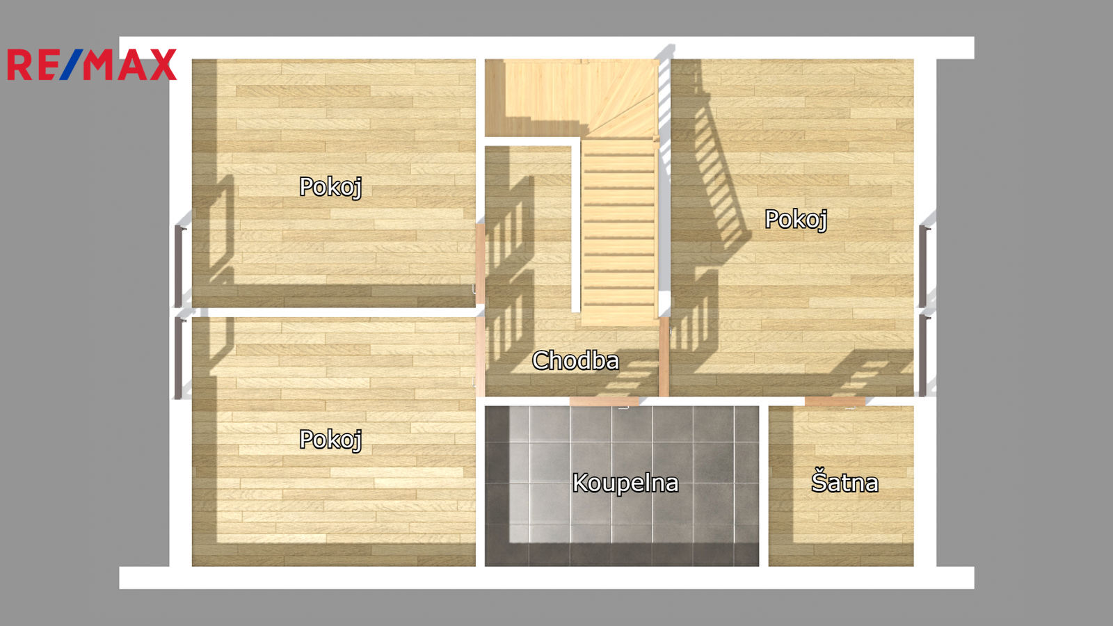 Zde se nachází koupelna s wc, hlavní ložnice se šatnou a dva samostatné pokoje.