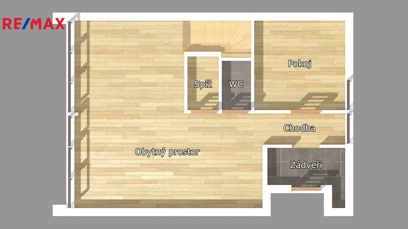 V přízemí se nachází zádveří, pracovna/pokoj , hlavní obývací prostor s kuchyňským koutem a wc.