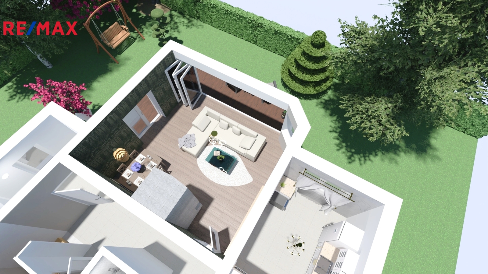 Zahrada je díky své orientaci slunná po celý den a skvěle se hodí pro relaxaci, grilování nebo dětské hry.