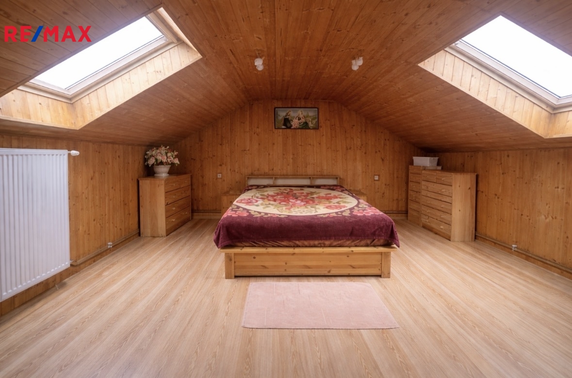 V podkroví jsou tři ložnice. Jedna aktuálně slouží jako šatna. Ústí na prostornou terasu s výhledem na okolí. Menší, velmi dobře udržovaný objekt s menší zahradou, s okrasným záhonem, a sezóním posezením pod přístřeškem.