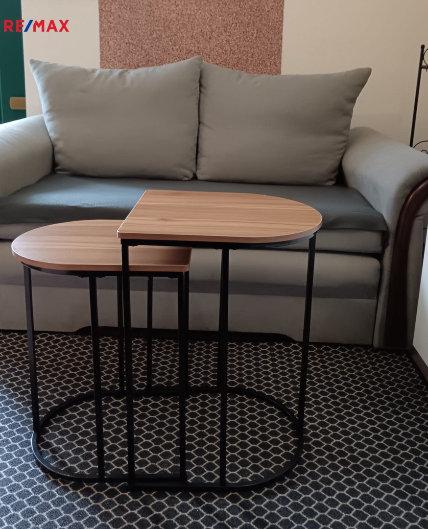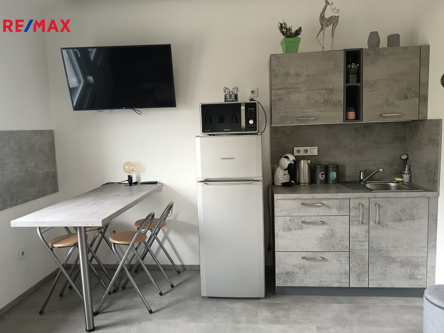 Apartmán je připraven k okamžitému užívání – najdete zde rozkládací gauč pro každodenní spaní, TV, jídelní stůl s barovými židlemi a moderní kuchyňský kout vybavený vším potřebným: dřezem, varnou konvicí, indukčním vařičem, mikrovlnnou troubou i prostornou lednicí s mrazákem.