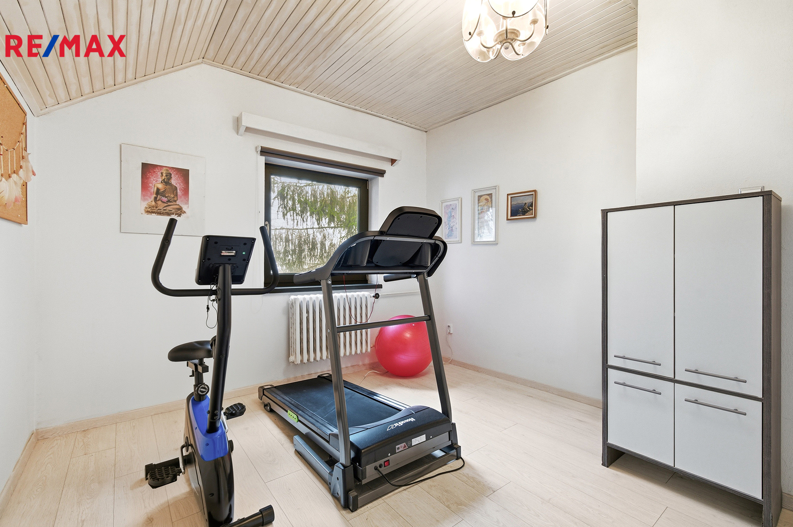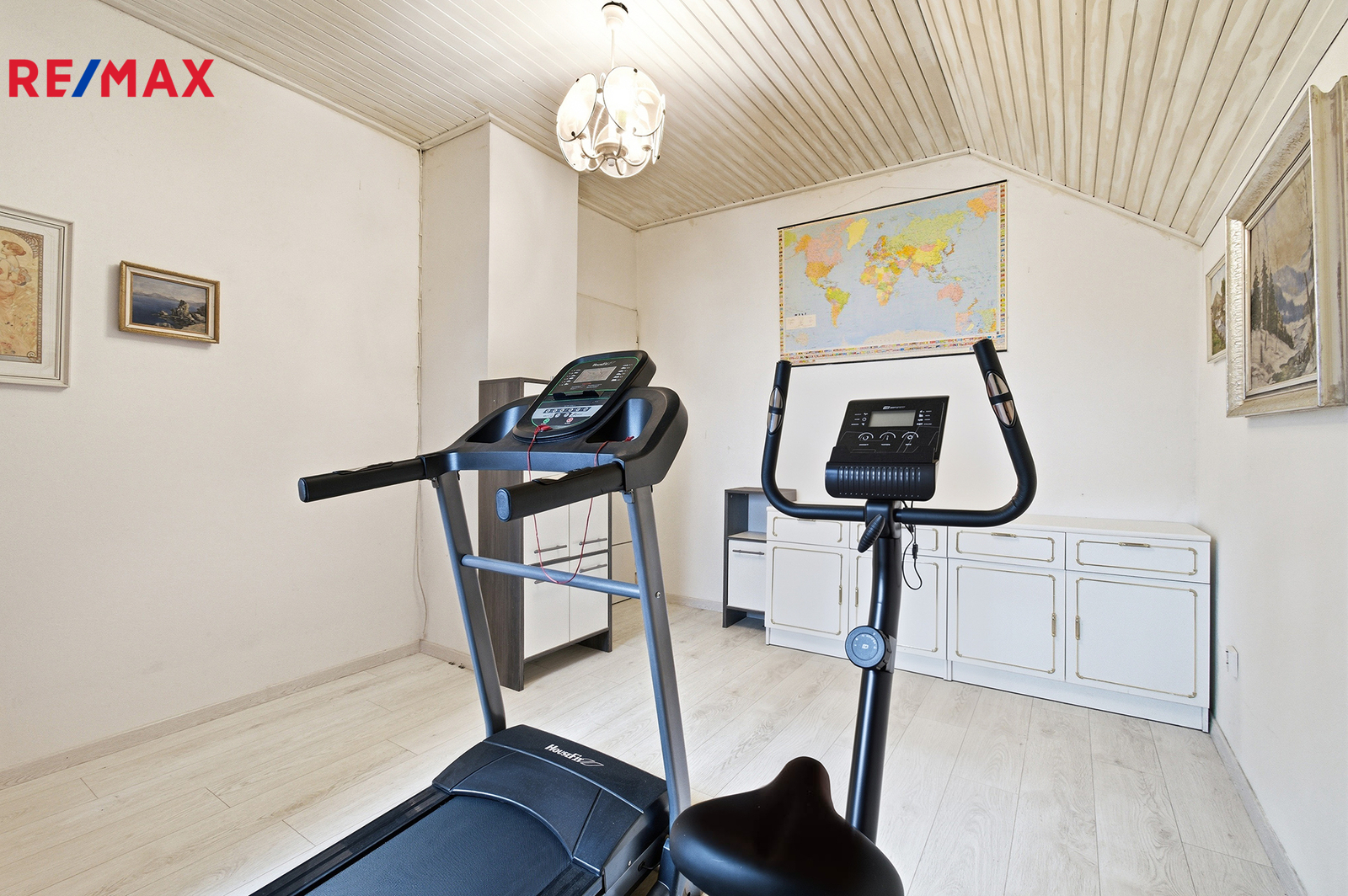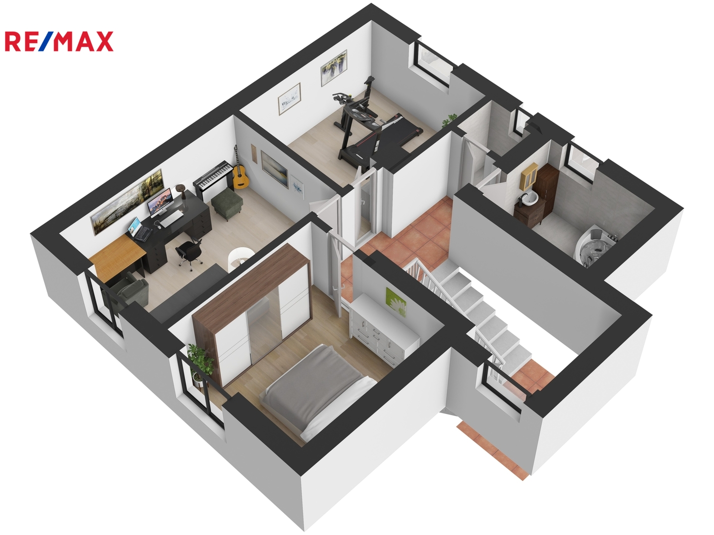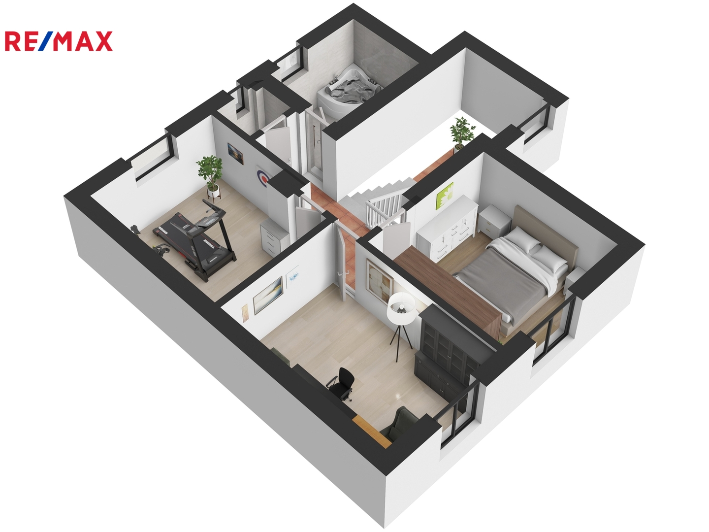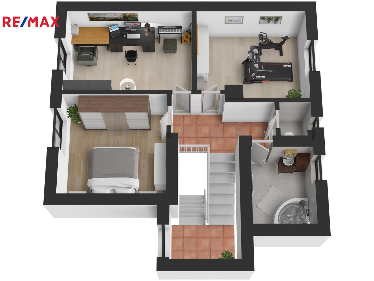 Horní patro koncipované jako klidová zóna domu nabízí tři neprůchozí pokoje. Aktuálně je zde ložnice, pracovna a domácí posilovna. Nicméně využití a přizpůsobení pokojů je zcela na novém nájemci a jeho potřebách. Nechybí samozřejmě koupelna s vanou, kde jistě oceníte příjemné podlahové topení a samostatná toaleta.