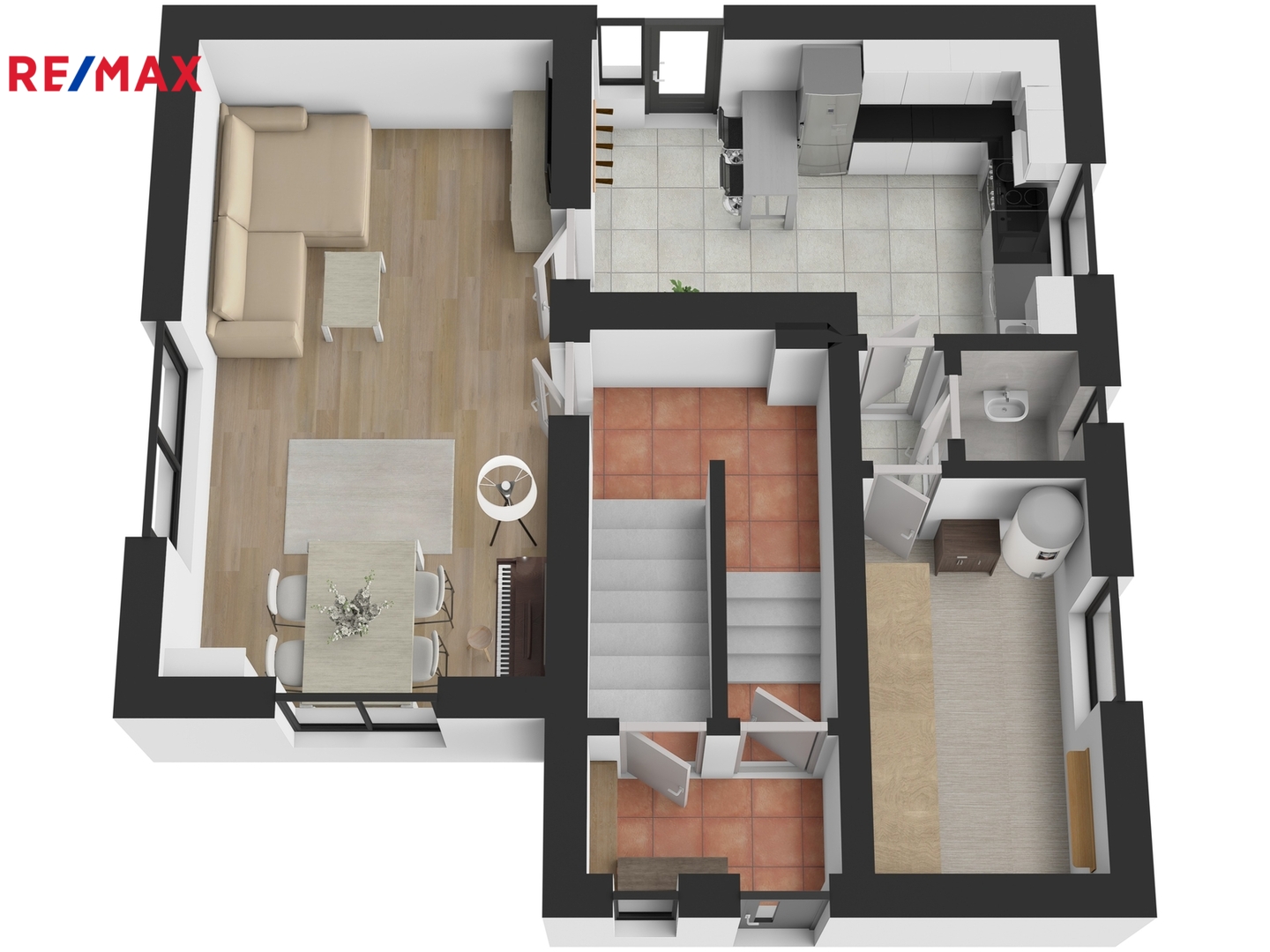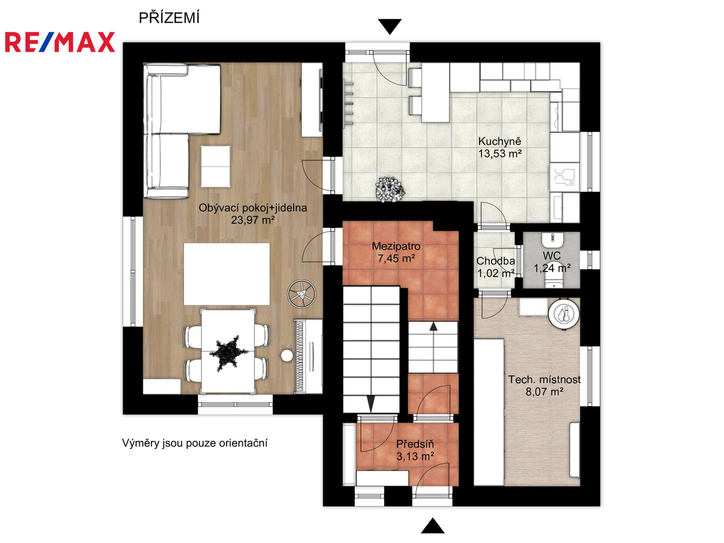 Srdcem přízemí je prostorný obývací pokoj s jídelnou, dále moderní plně vybavená kuchyně s vestavnými spotřebiči - sklokeramickou varnou deskou, elektrickou troubou, digestoří, myčkou nádobí a lednicí s mrazákem. Dále je zde kromě předsíně šatna s úložným prostorem a nechybí toaleta s umyvadlem.