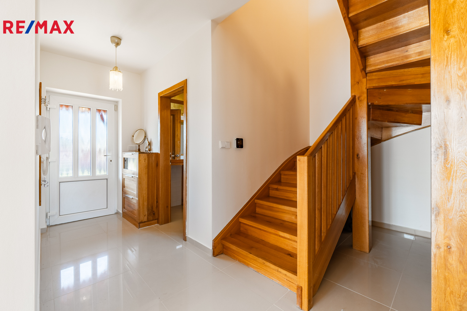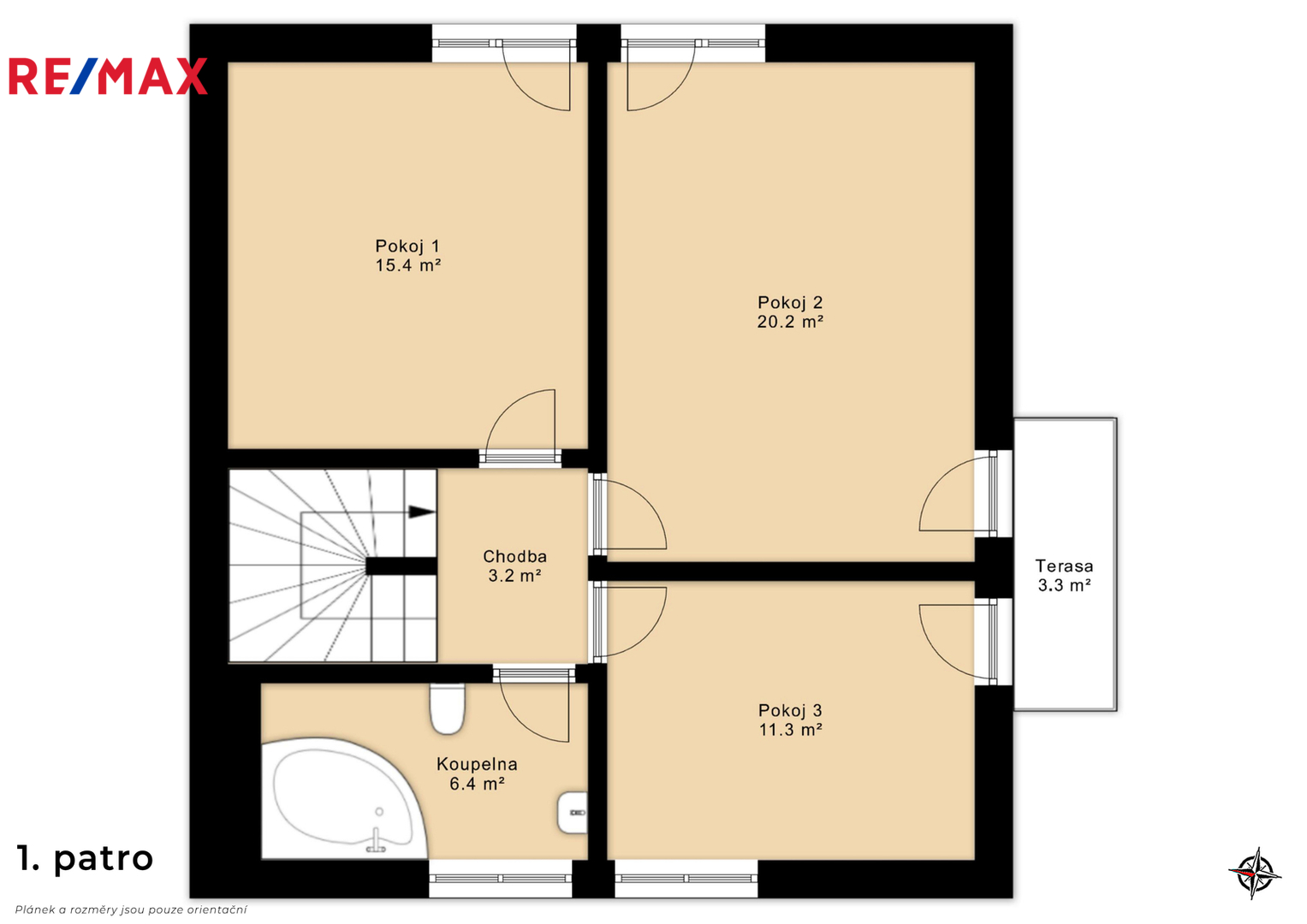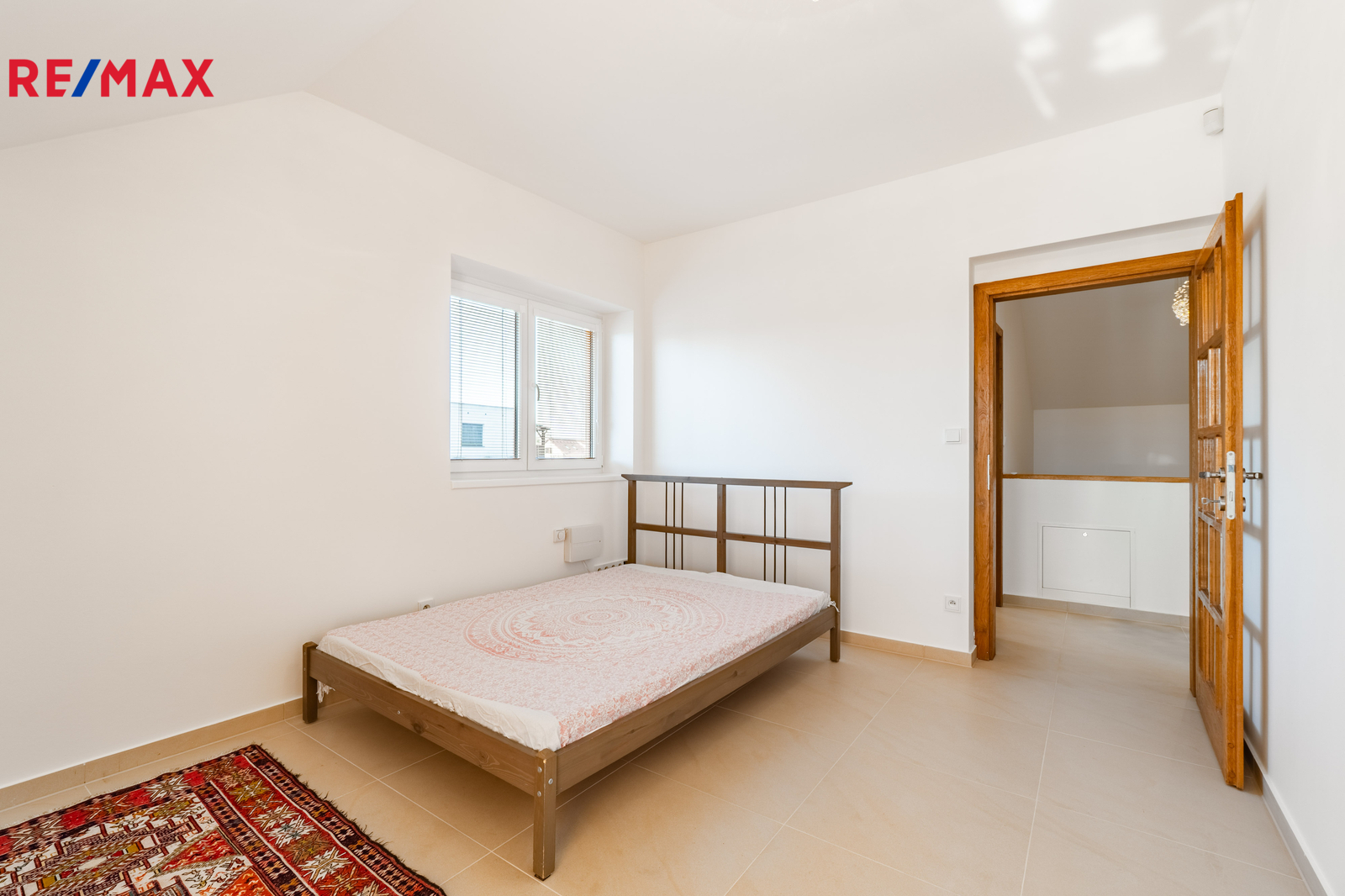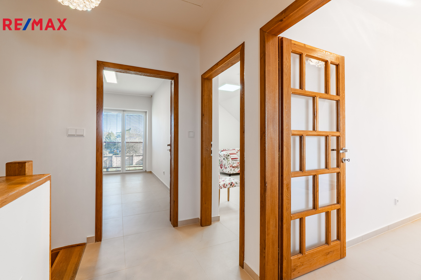 V patře jsou tři samostatné ložnice a koupelna s vanou, poskytující dostatek prostoru pro rodinu i práci z domova.