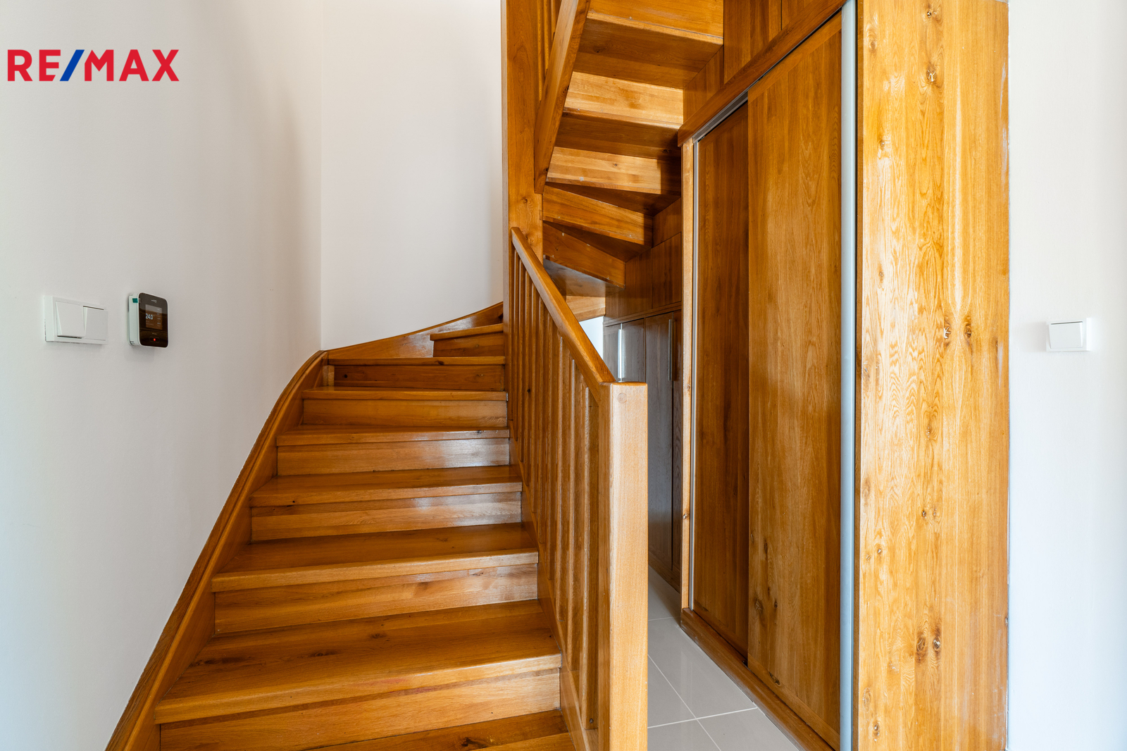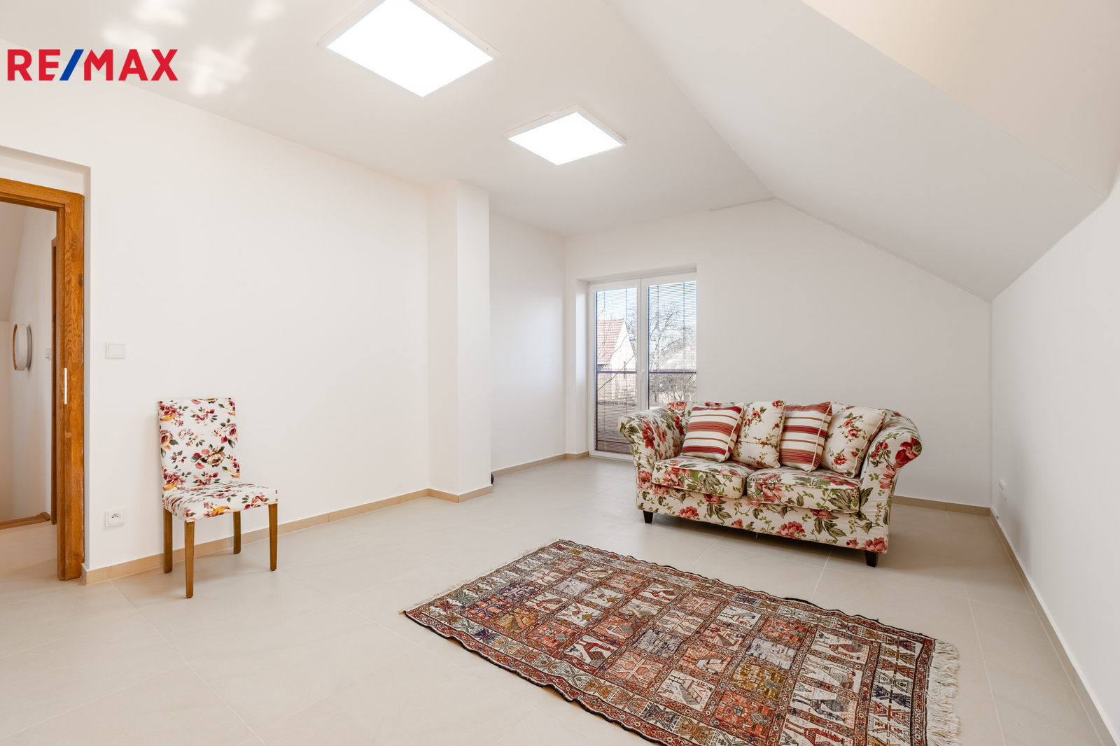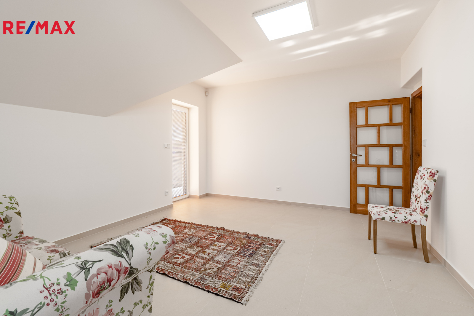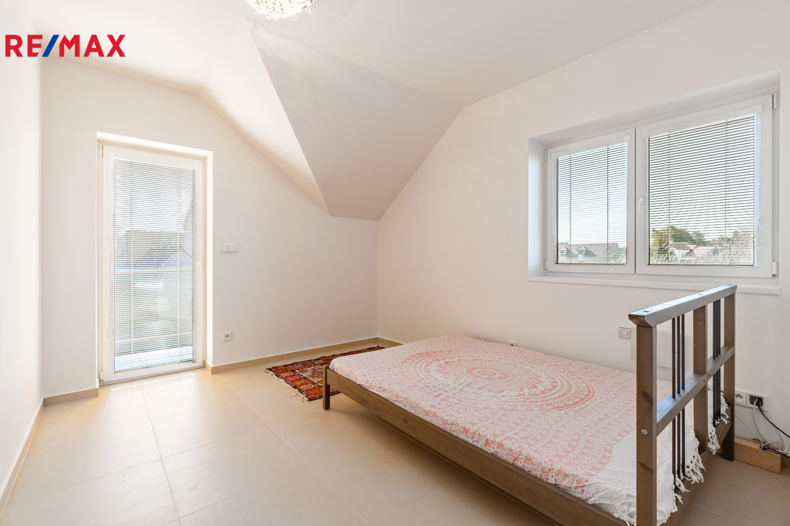 V patře jsou tři samostatné ložnice a koupelna s vanou, poskytující dostatek prostoru pro rodinu i práci z domova.