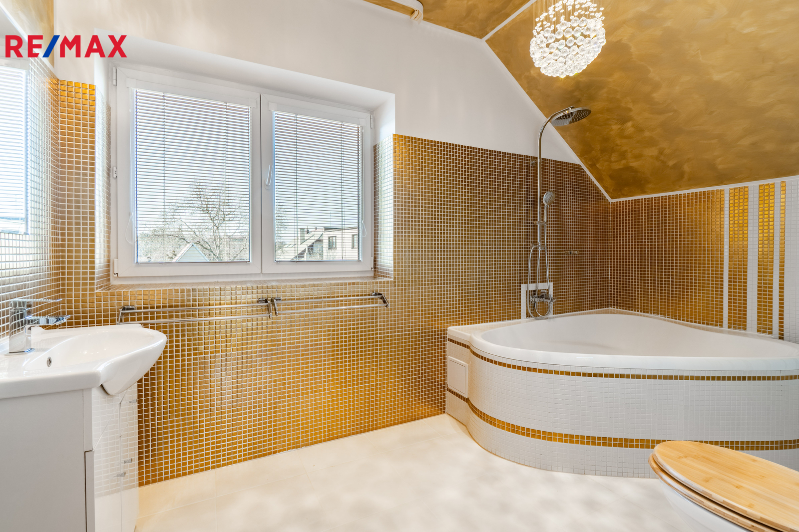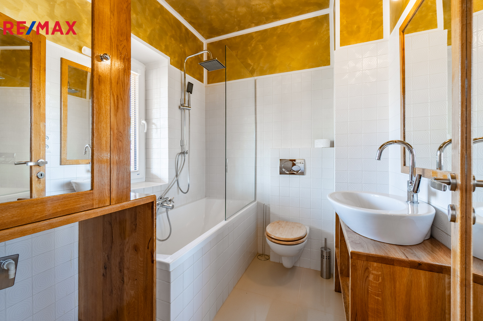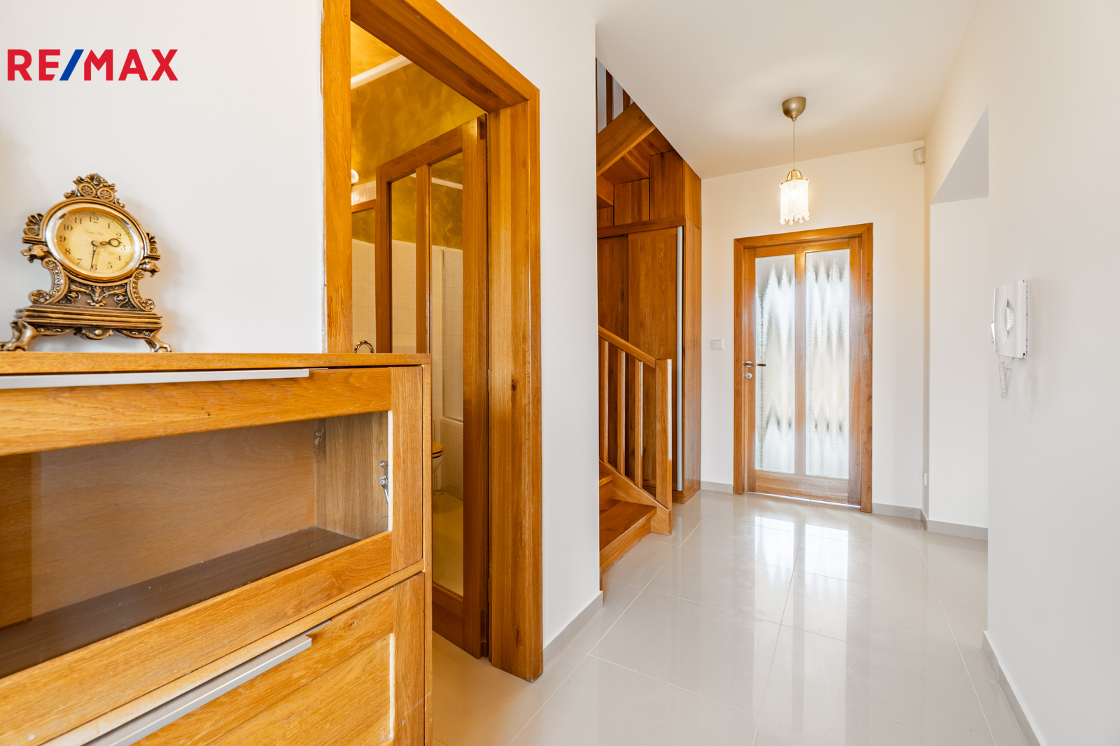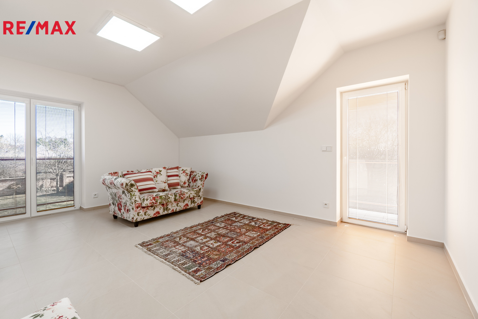 V patře jsou tři samostatné ložnice a koupelna s vanou, poskytující dostatek prostoru pro rodinu i práci z domova.