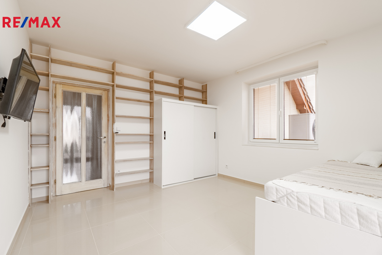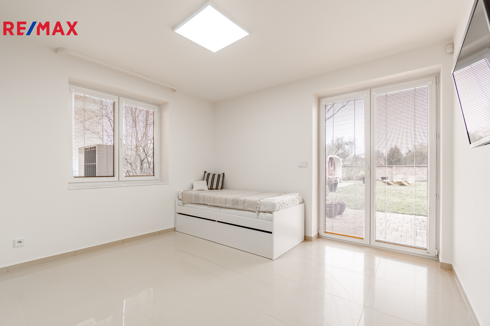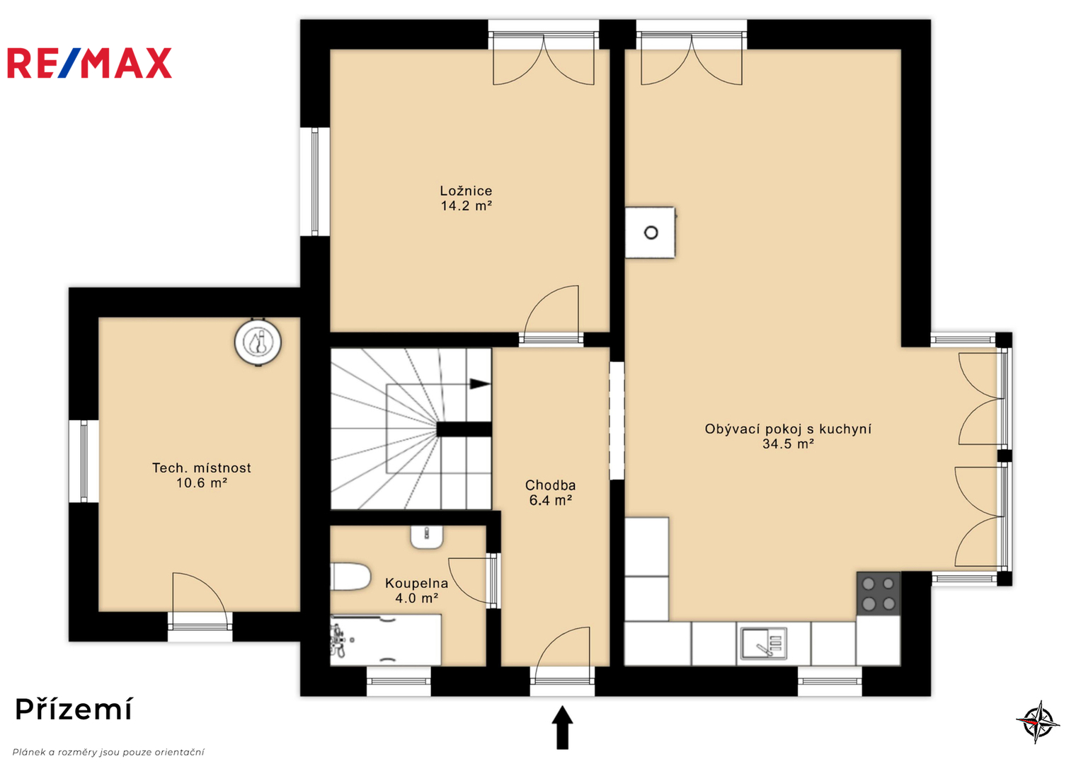 Přízemí domu tvoří vzdušný a světlý obývací prostor s kuchyňským koutem a jídelnou, který přirozeně propojuje interiér se zahradou. Dále se zde nachází ložnice a elegantní koupelna se sprchovým koutem. Technická místnost může sloužit jako prádelna či praktické zázemí domácnosti.