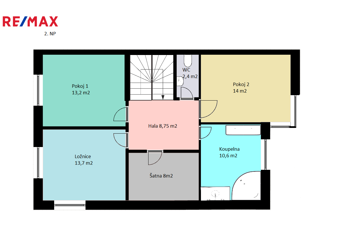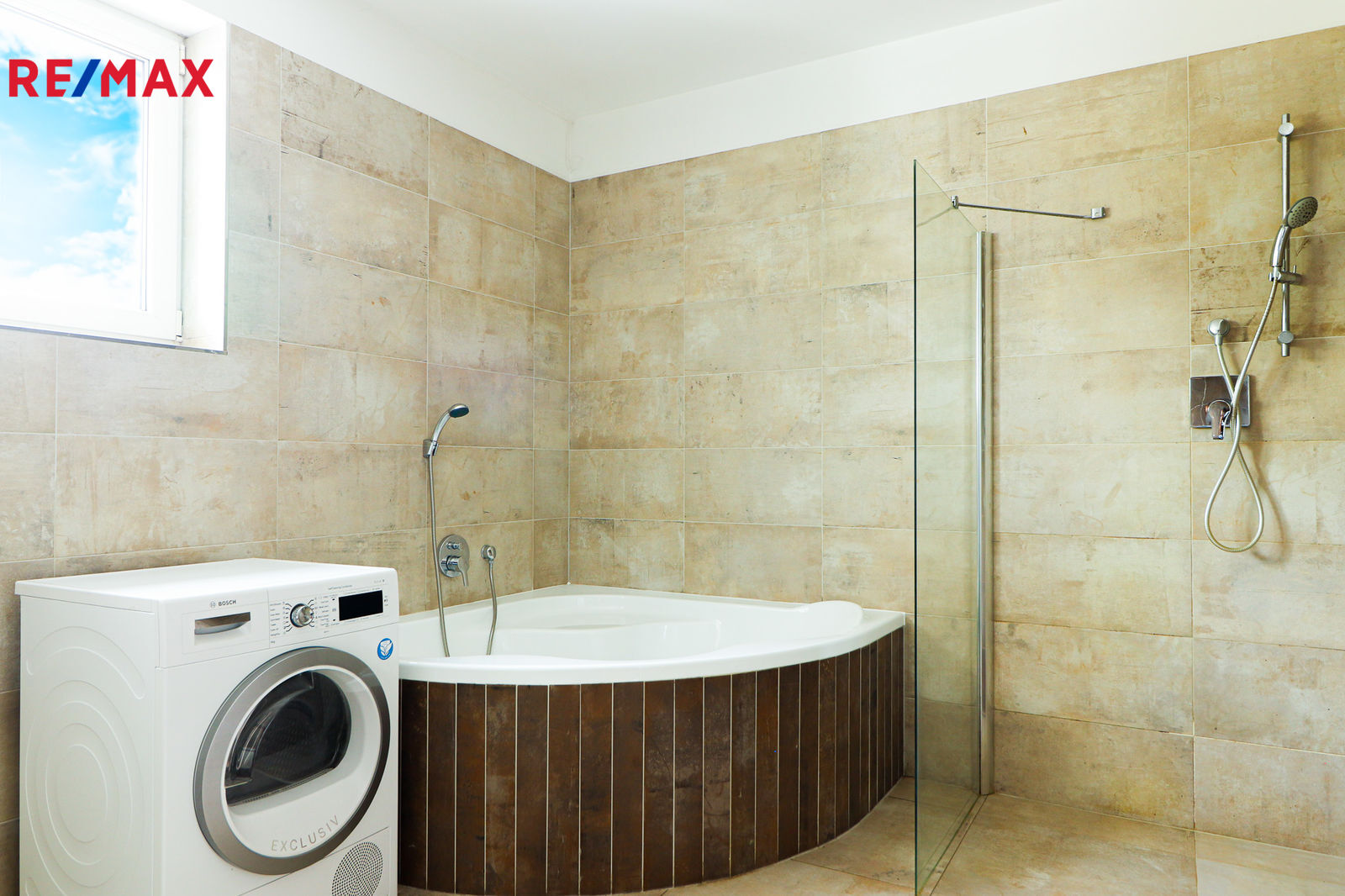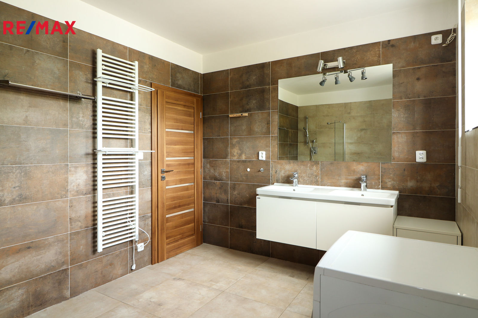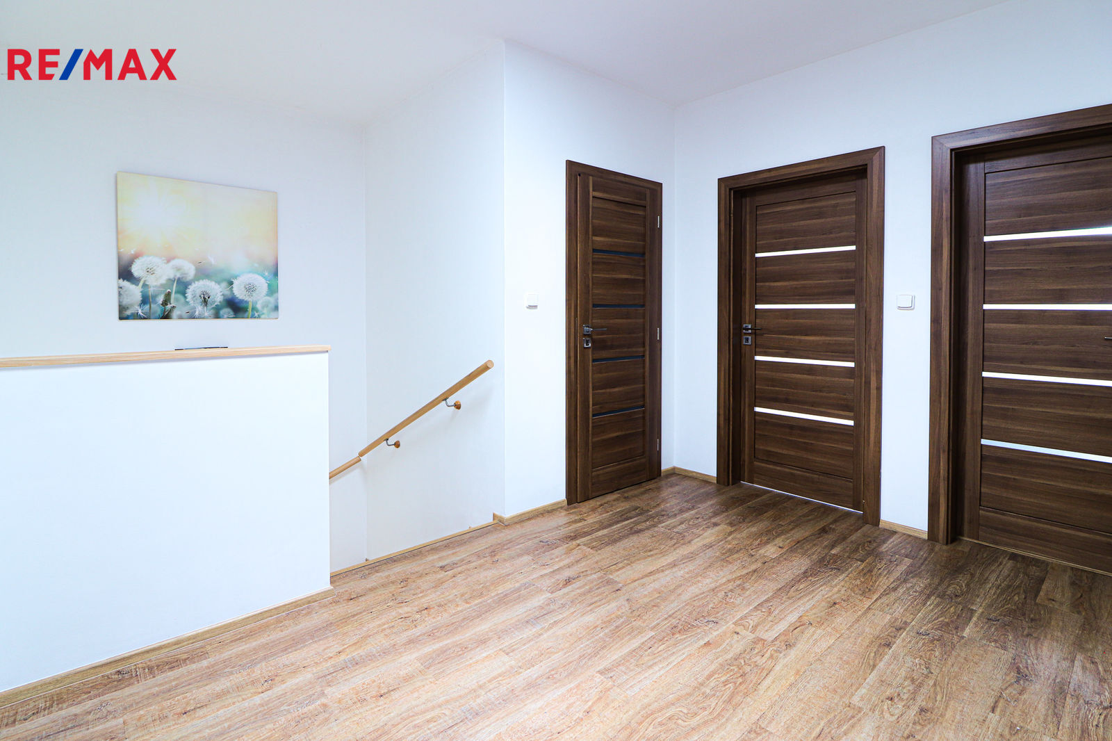 V patře jsou k dispozici 3 samostatné pokoje, šatna, koupelna s vanou i sprchovým koutem a samostatné WC.