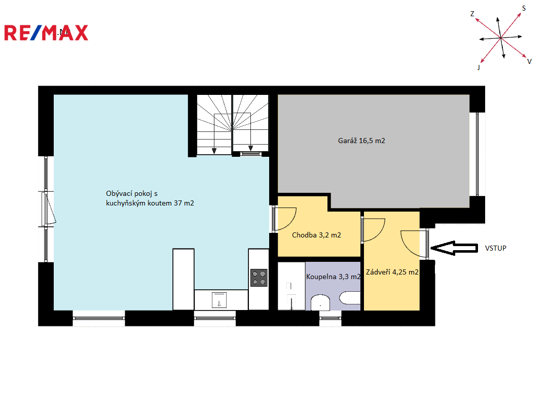 V přízemí domu se nachází vstupní hala, prostorný obývací pokoj s kuchyní, koupelna se sprchou a WC.