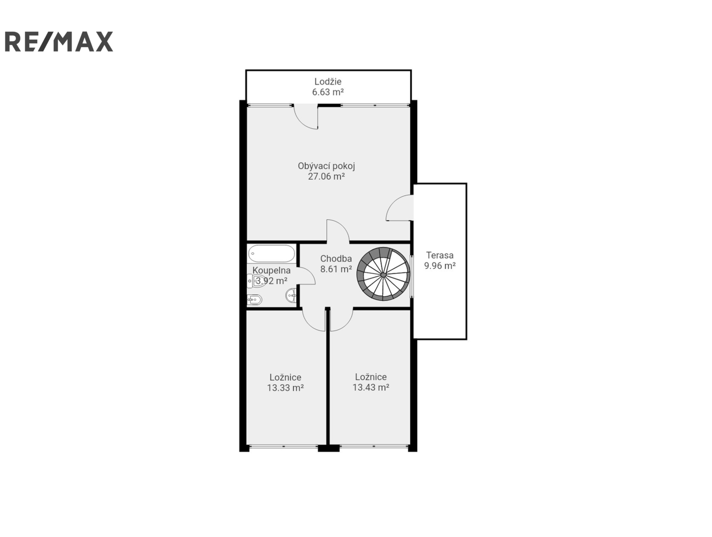Podlaží nabízí tři neprůchozí pokoje – obývací pokoj se vstupem na lodžii a terasu a dvě ložnice. Součástí je také koupelna s vanou, toaletou a bidetem a centrální chodba.
