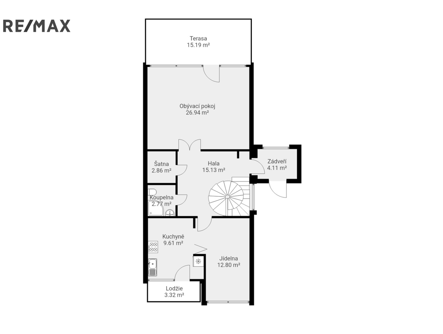 Dominantou podlaží je prostorný obývací pokoj s přímým vstupem na terasu a navazující zahradu. Dále je zde kuchyň s výstupem na prosklenou lodžii, jídelna, koupelna se sprchovým koutem a WC, šatna a vstupní chodba se zádveřím.