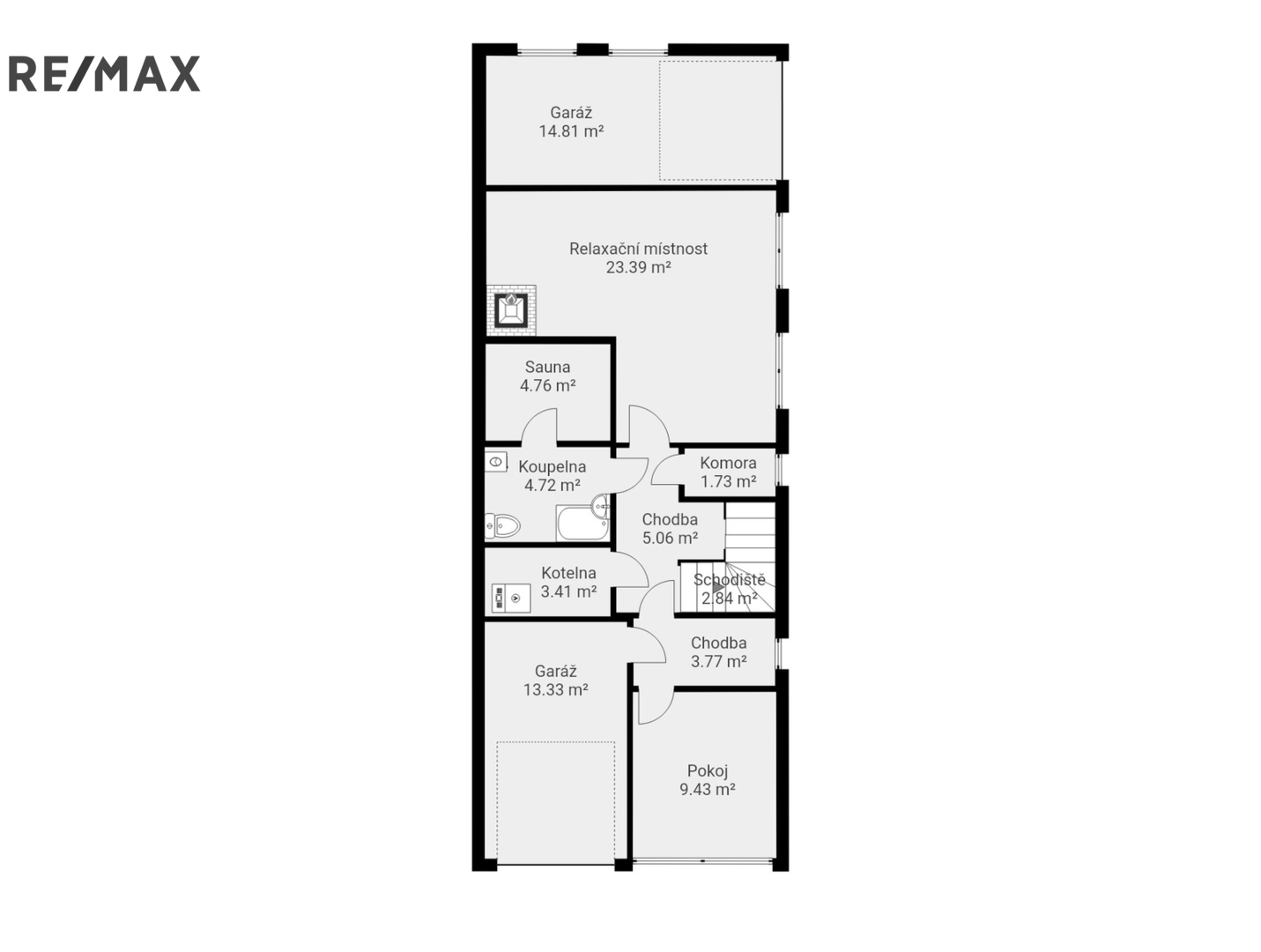 Praktické technické zázemí domu zahrnuje dvě garáže, relaxační zónu, technické místnosti, koupelnu, obytný pokoj a komory.