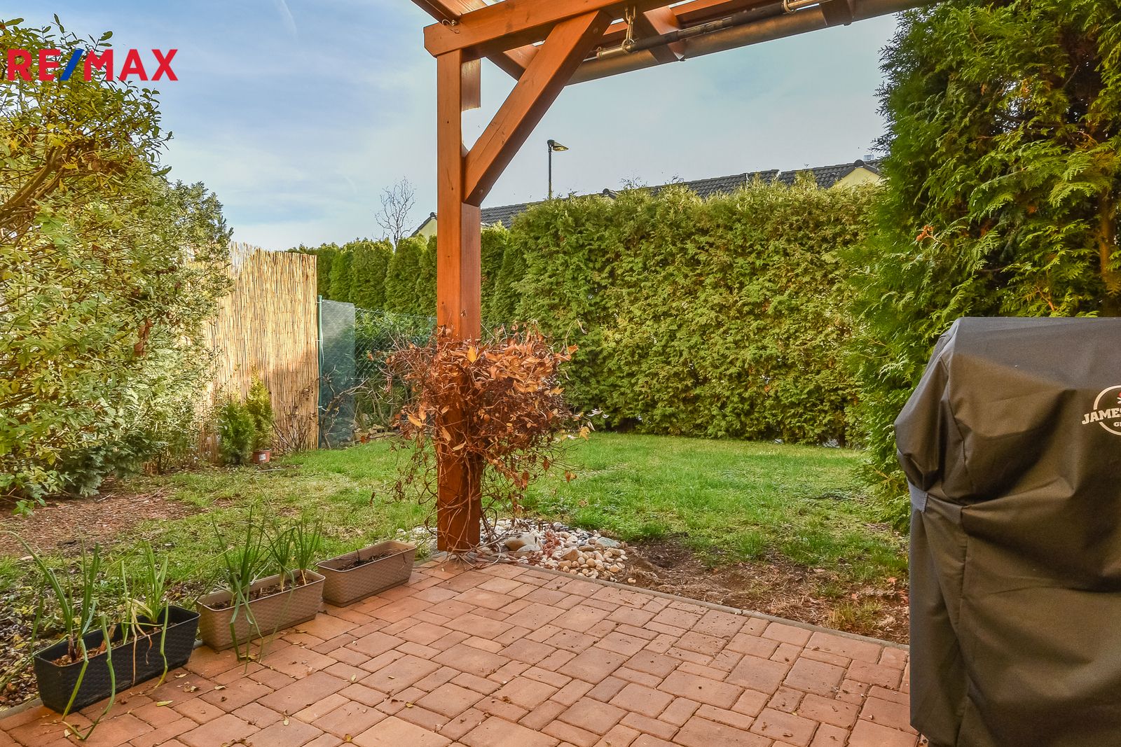 Udržovaná zahrada s terasou a pergolou nabízí místo k odpočinku.
