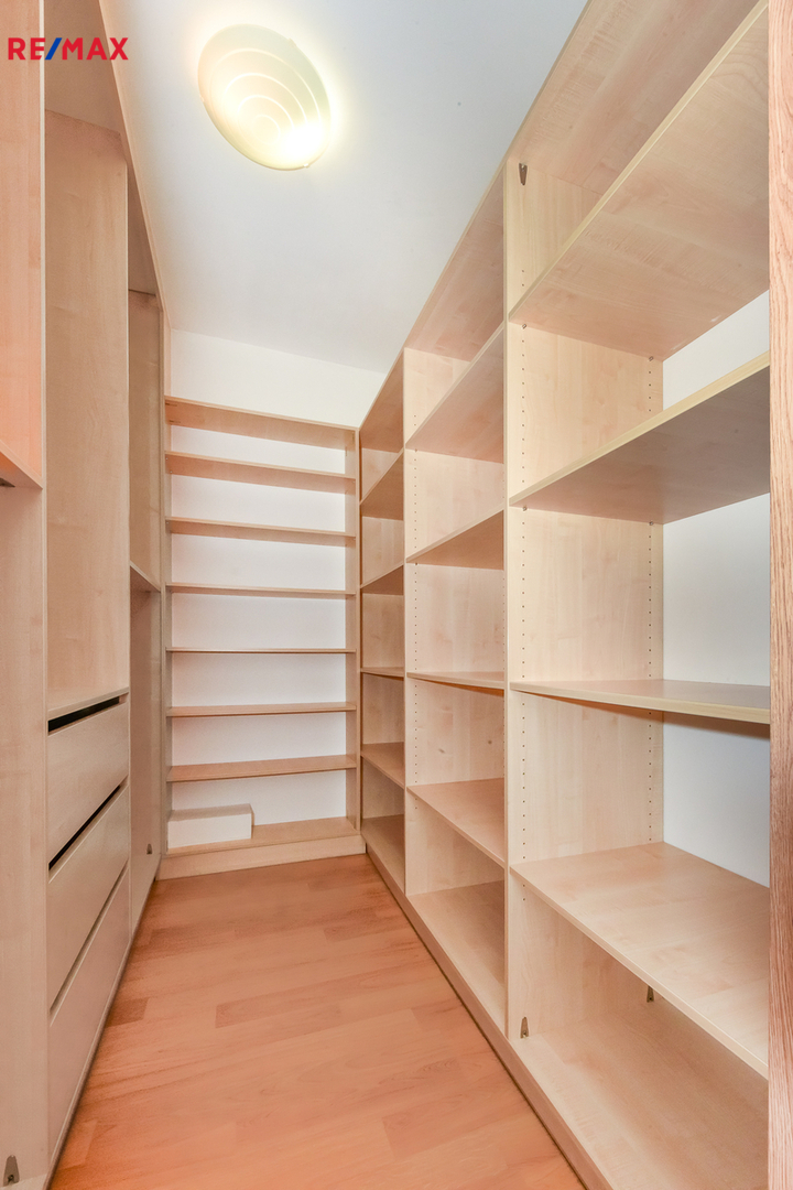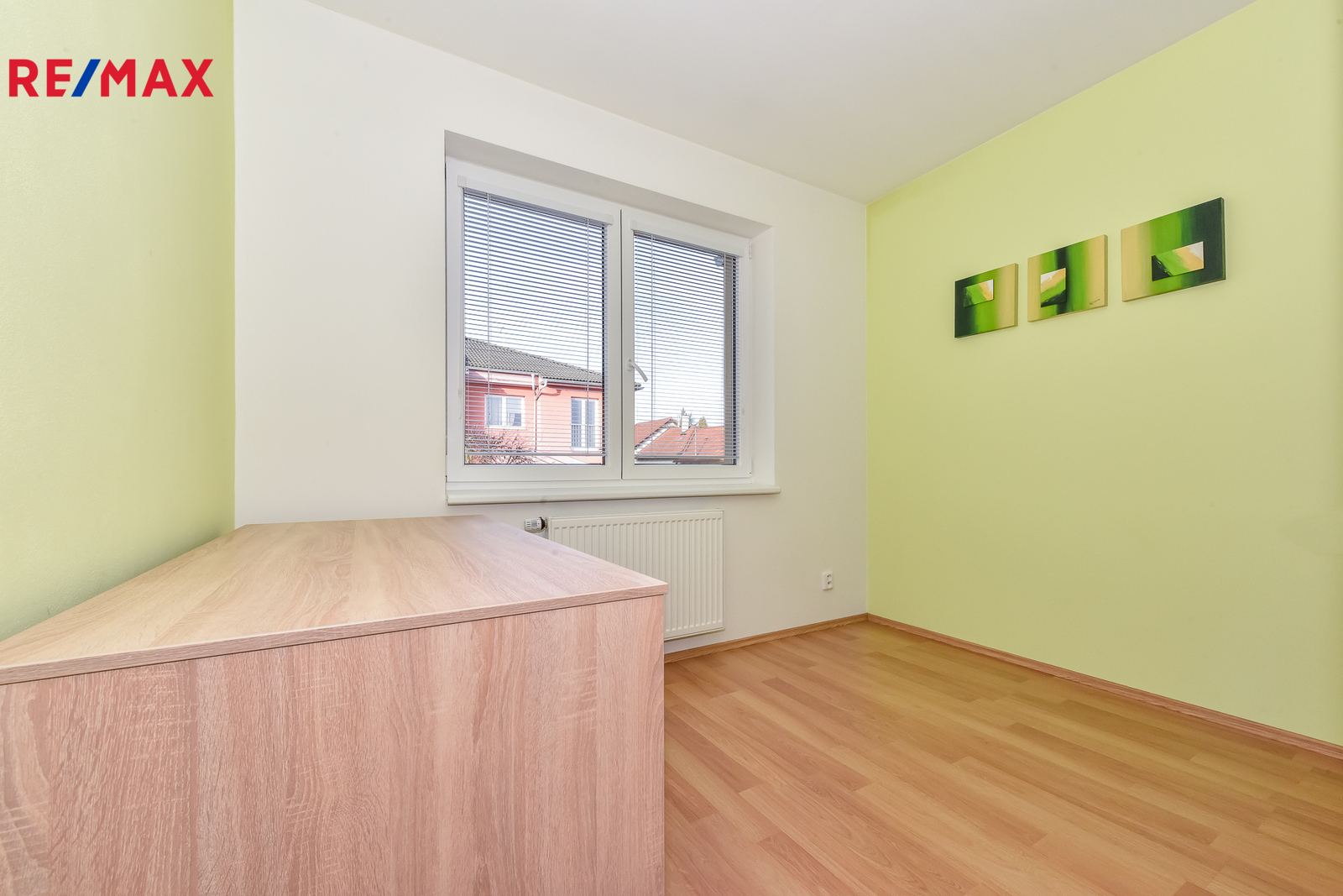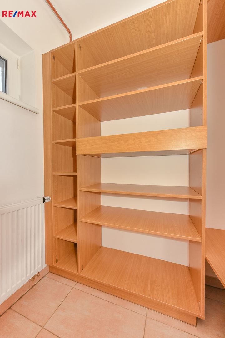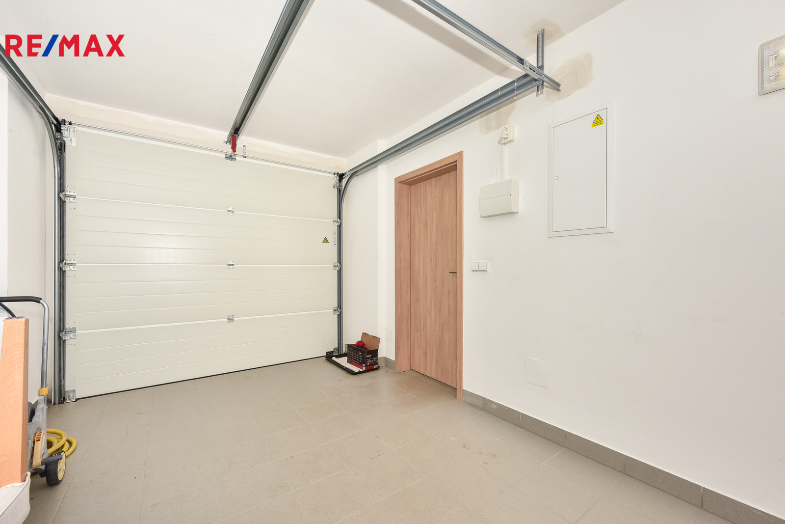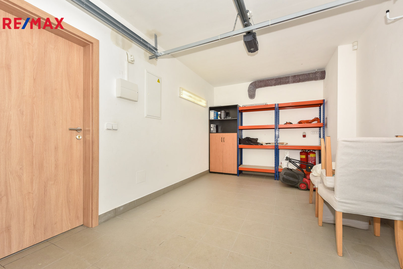 V přízemí domu se nachází prostorný obývací pokoj s kuchyňským koutem a moderní kuchyňskou linkou s vestavěnými spotřebiči, dále toaleta s umyvadlem, šatna, prádelna a garáž pro jeden osobní automobil. V patře jsou k dispozici čtyři pokoje, šatna a koupelna s vanou a toaletou. Šatna v přízemí a šatna v patře jsou vybaveny vestavěnými skříněmi, stejně jako dva pokoje v patře. Jeden z pokojů v patře lze využívat také jako pracovnu, je zde k dispozici knihovna. V obývacím pokoji je rozkládací sedací souprava a nábytková obývací stěna. Majitel domu neuvažuje o demontáži stávajícího vestavěného nábytku na míru.