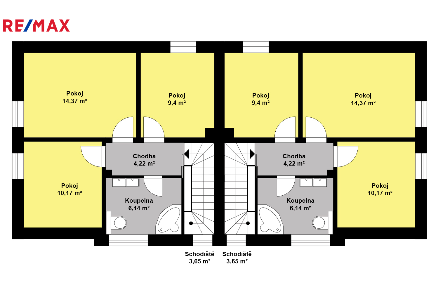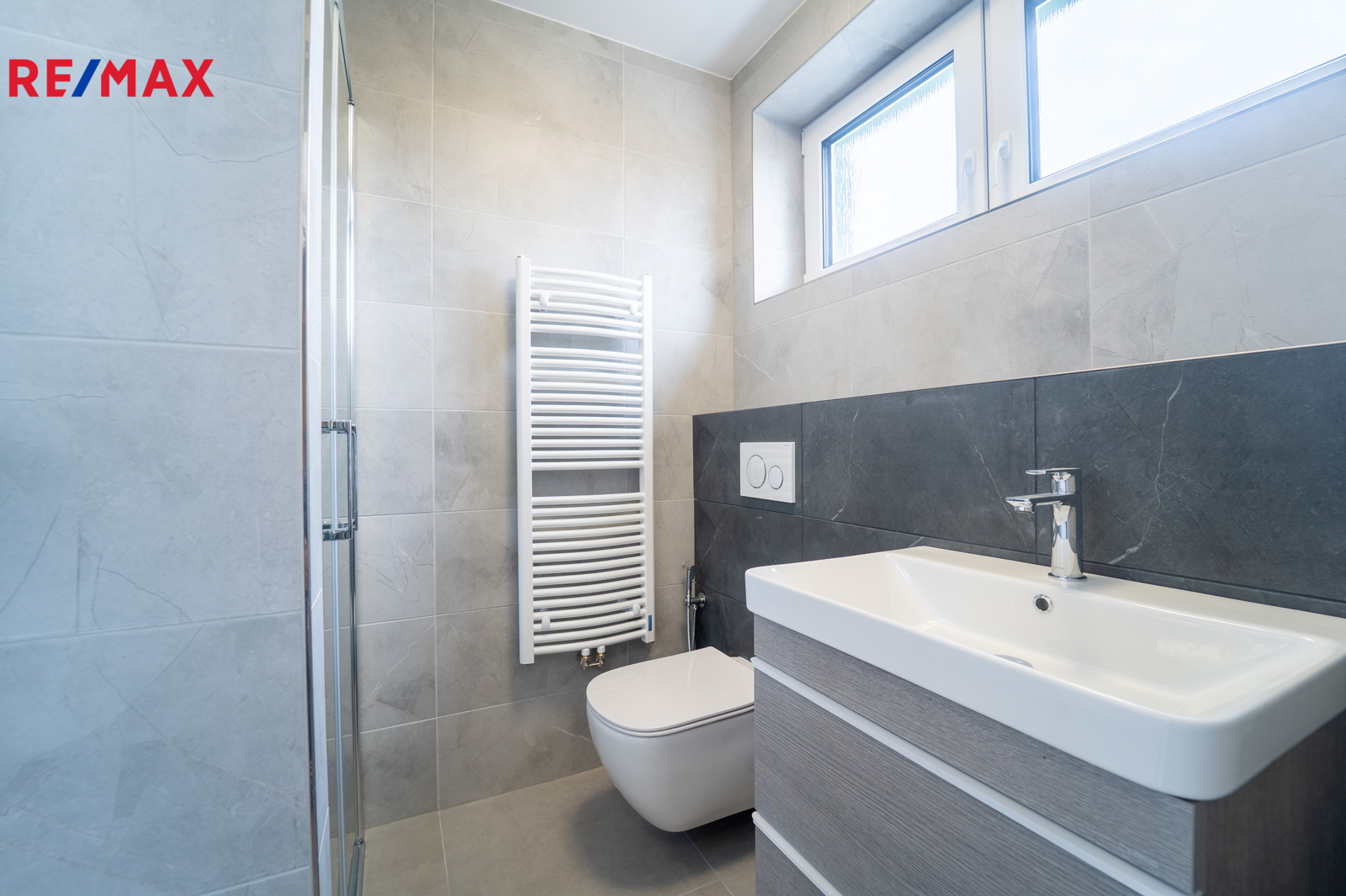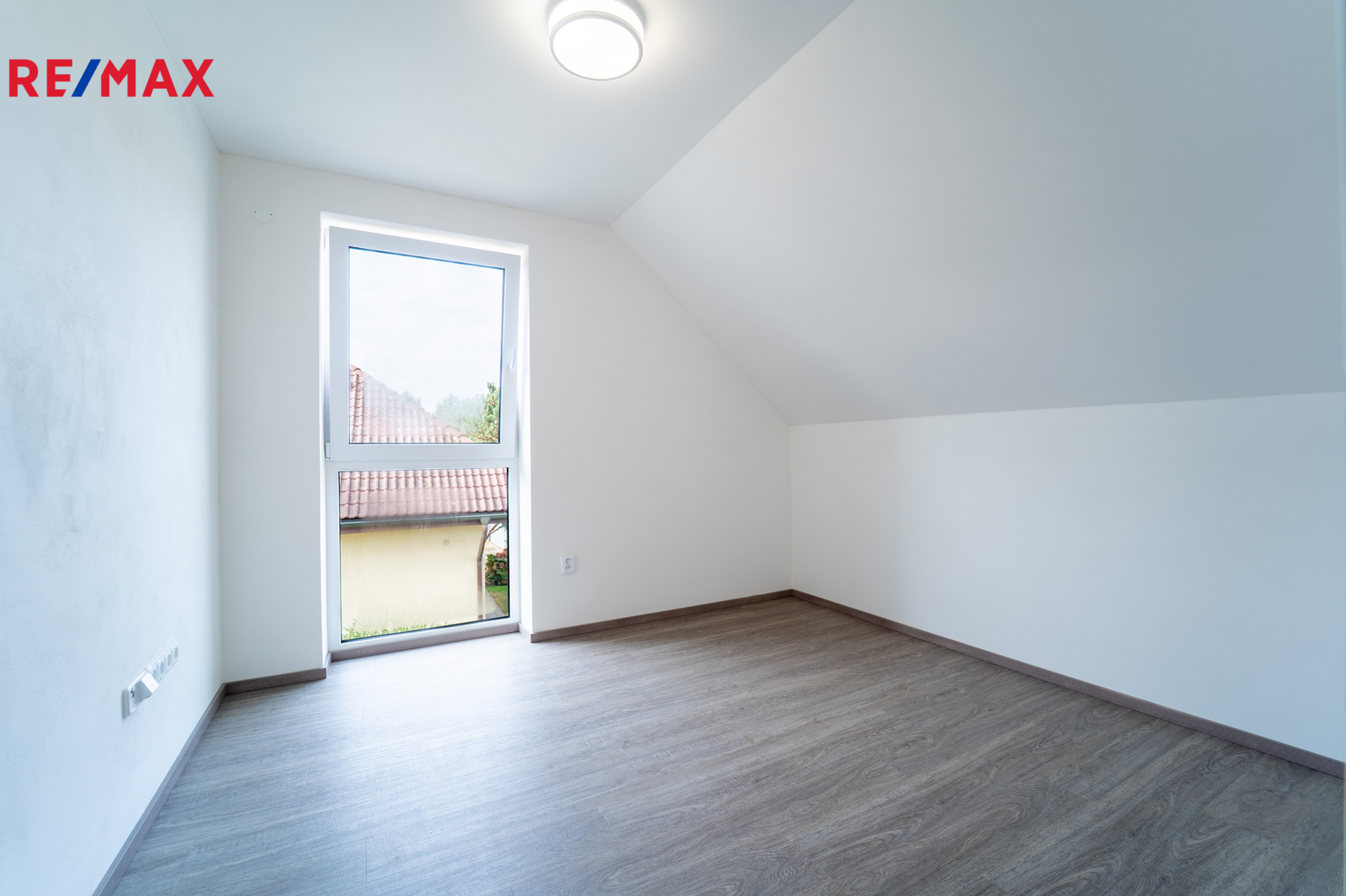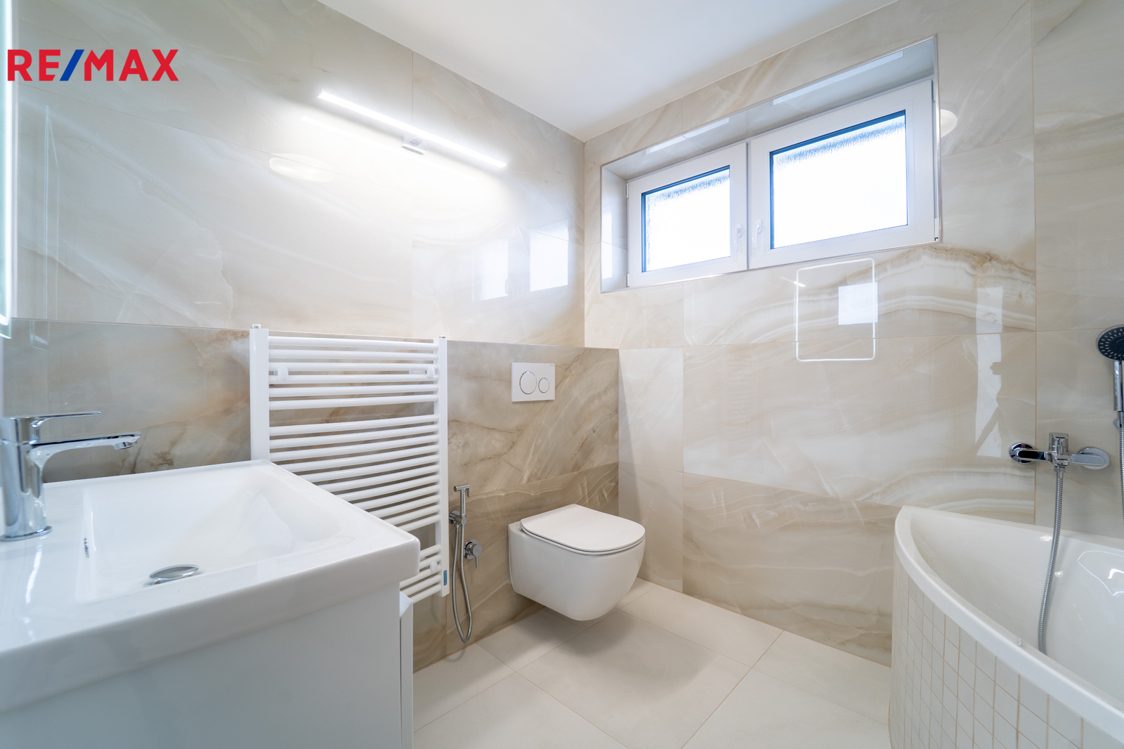 V patře jsou tři samostatné pokoje a koupelna s vanou a WC.