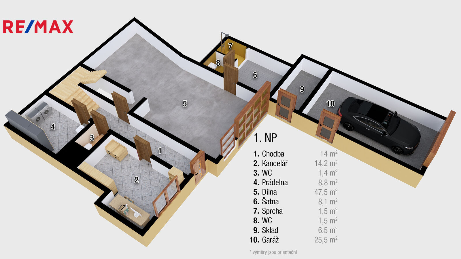 - Dílna: Prostorná a vhodná pro různé podnikatelské aktivity.