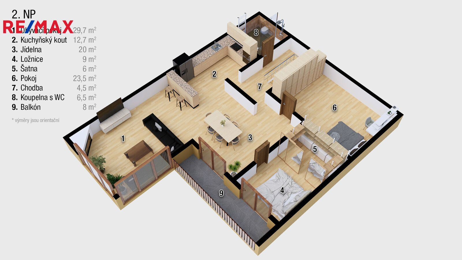 - Ložnice: Nabízí přímý vstup na terasu a jako bonus velkou 6metrovou šatnu, která zajišťuje dostatek úložného prostoru.