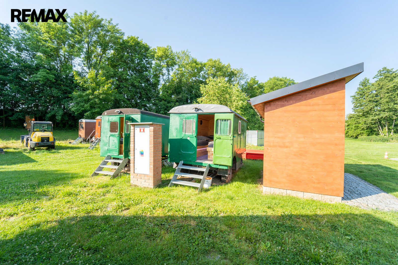 Resort je oplocený s příjezdovými vraty připravenými na dálkové ovládání. Na pozemku je hlavní společenská cihlová budova 60m2 zkolaudovaná v roce 2019. Budova je plně vybavená - výčepním zařízením, klimatizací (teplo-chlad), vodou, elektřinou, TV, plátnem s projektorem, zvukový audio systém, stoly, židle, WC a ostatní. Na pozemku je nadstandardně rozvedená elektřina 230V, 400V – 40A. Voda je z vlastní vrtané studně a rozvedená po pozemku ohřev je zajištěn průtokovým ohřívačem Stiebel Eltron. Na pozemku je přípojka na veřejnou kanalizaci, plyn není.