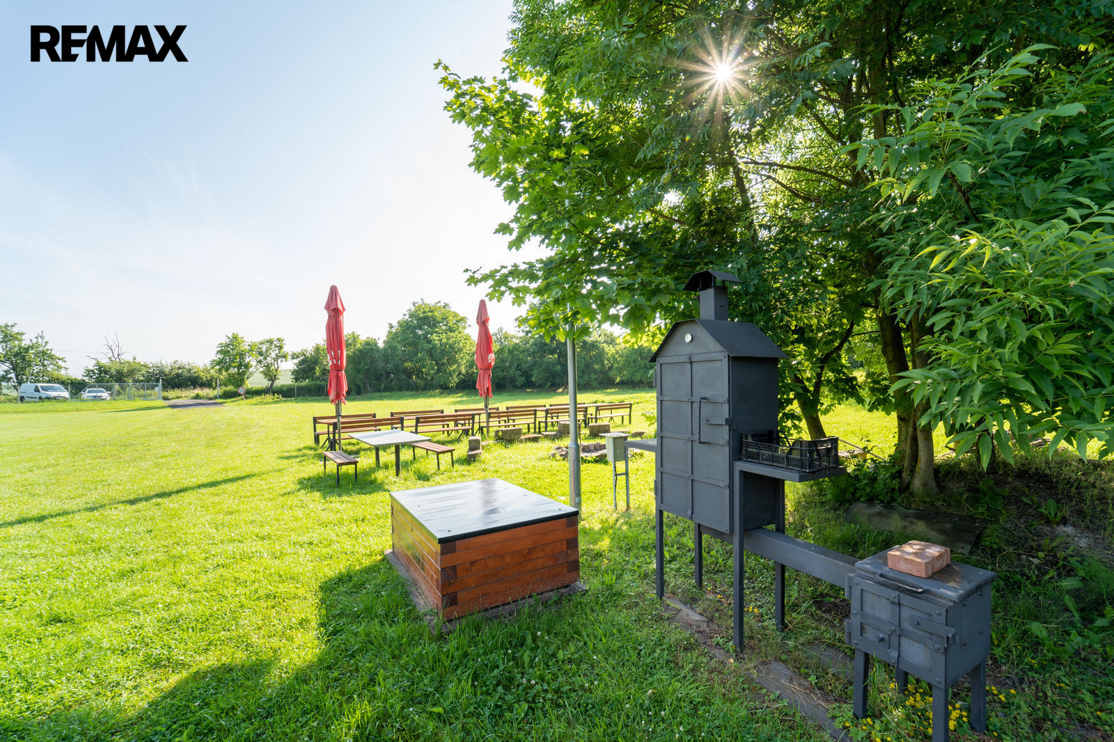 Venkovní posezení má přivedenou elektřinu na gril, součástí je udírna, venkovní ohniště vše je osvětleno solární lampou.